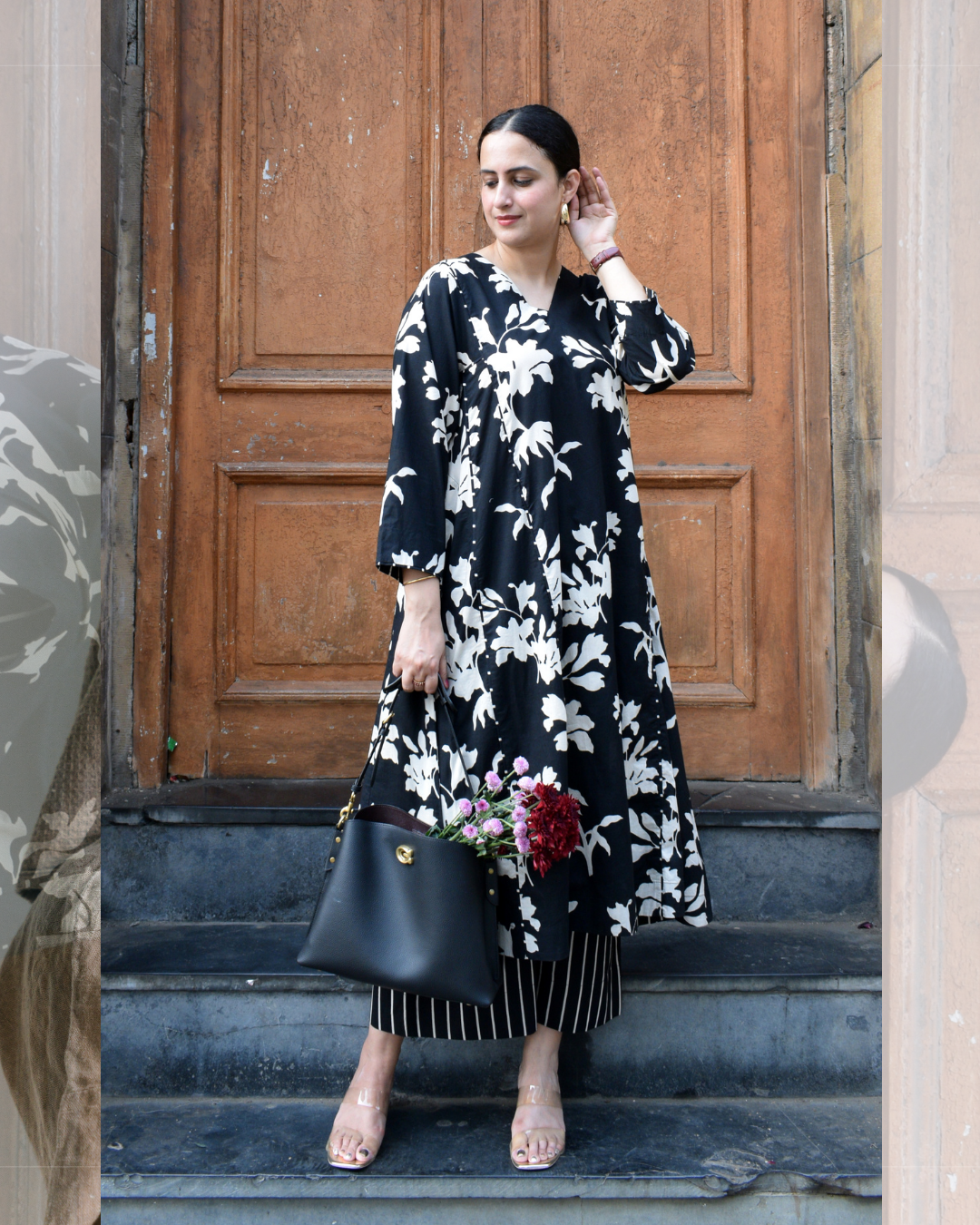 Black floral kurta set with striped pajama