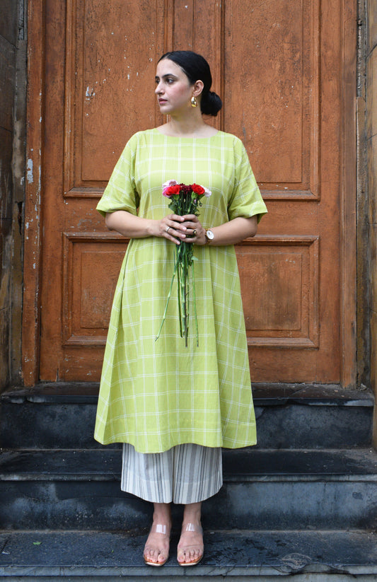 Lime Green A line Kurta in Handwoven Checks with Handwoven Striped pyjama