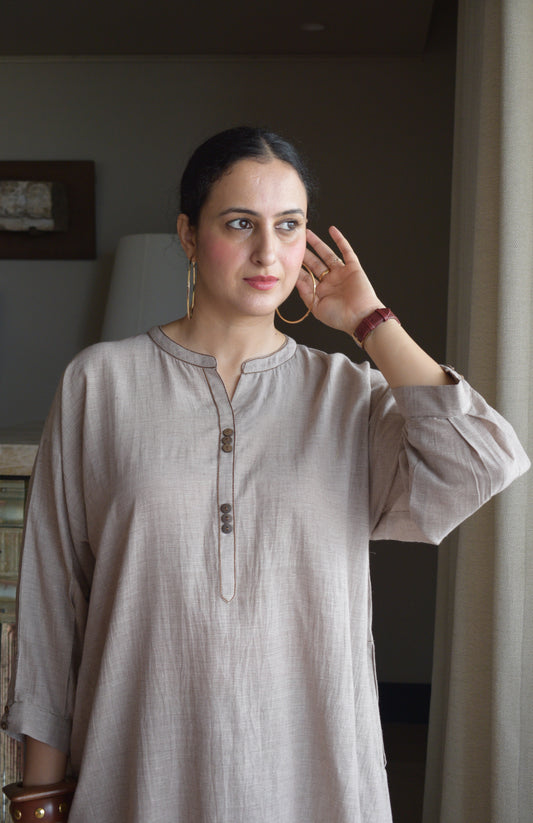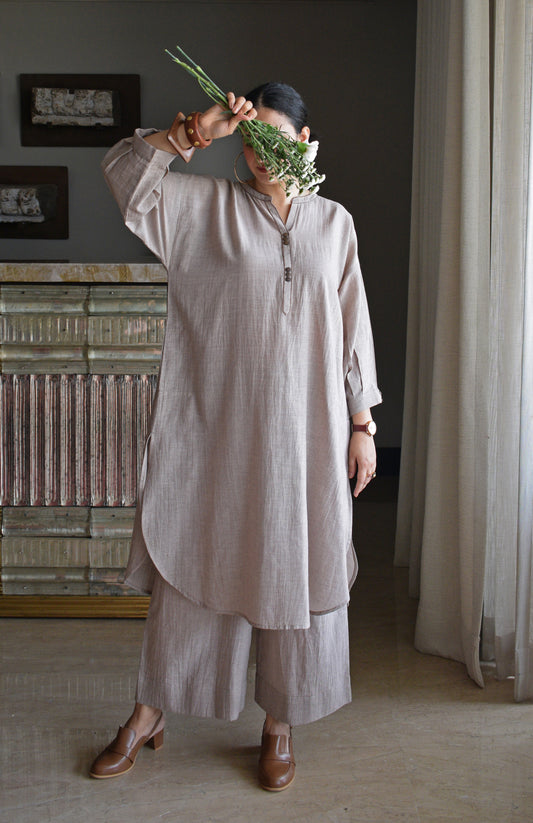 Light brown striped co-ord set with A line kurta and pajama in handwoven cotton