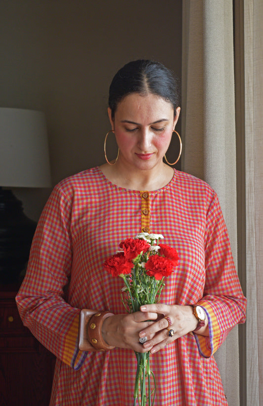 Rust Orange Checks A line Kurta with Pyjama in Handwoven cotton