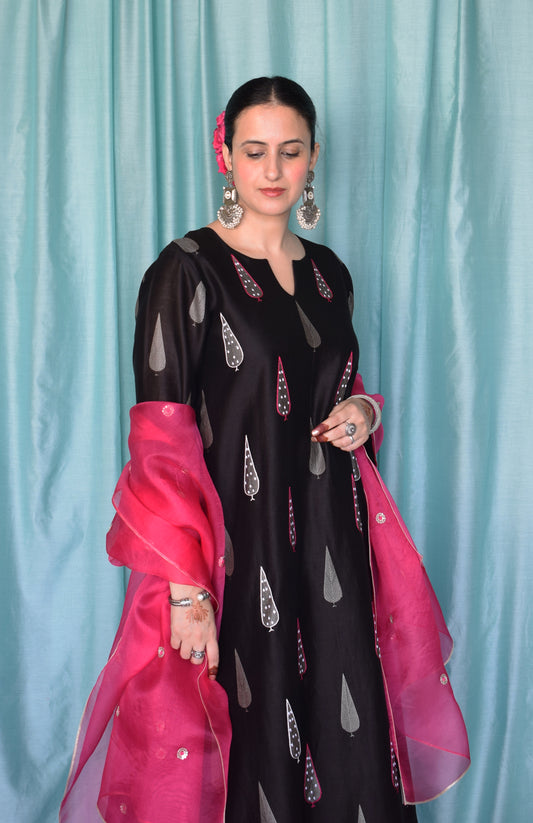 Shyam Chanderi Set with Rani Pink Silk Organza Dupatta