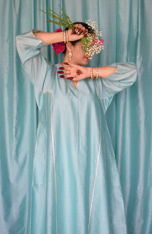 Meher Chanderi Set with Hand Embroidered Phiran Kurta and Wide Legged Pyjama