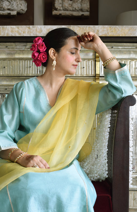 Meher Chanderi Set with Yellow Silk Organza Dupatta