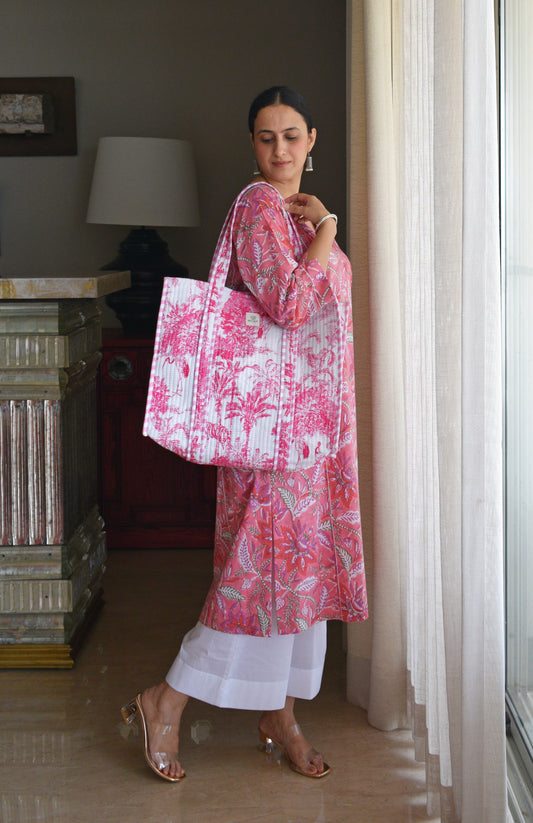 Pink Handblock Printed Panelled Kurta with White Pyjama