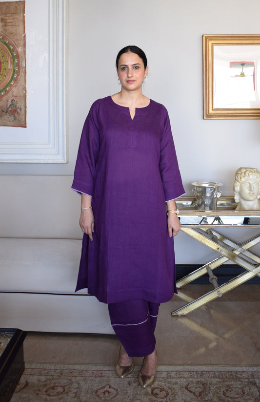 Pure Linen | Kurta & Pants SetPurple Linen Straight Fit Panelled Kurta Set with Trousers