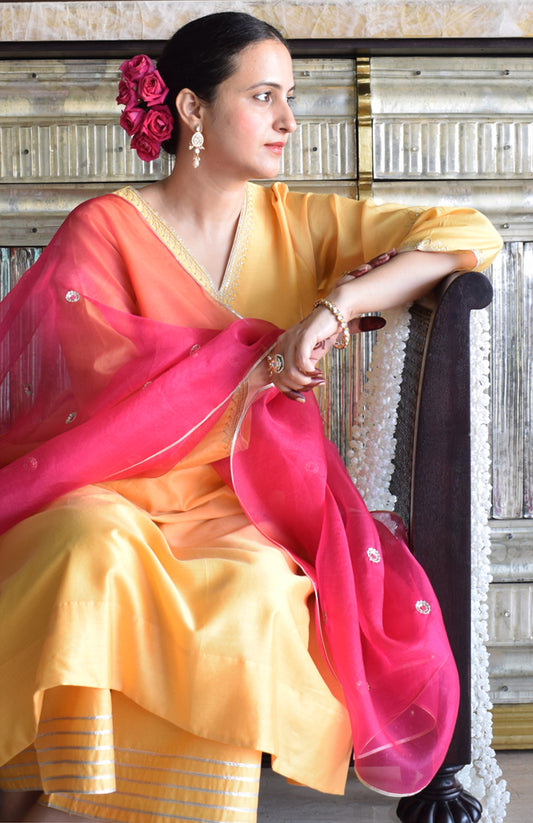 Meher Chanderi Set with Yellow Silk Organza Dupatta