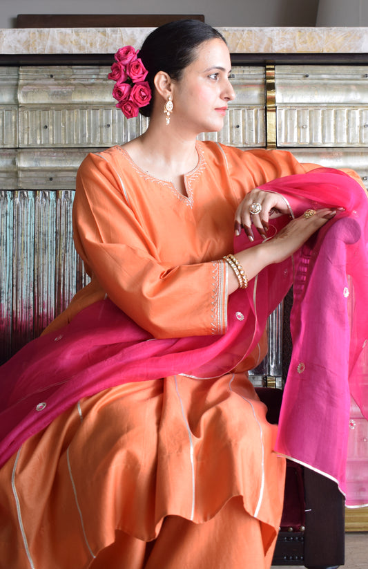 Kanak Chanderi Set with Hand Embroidered A line Kurta and Wide Legged Pyjama