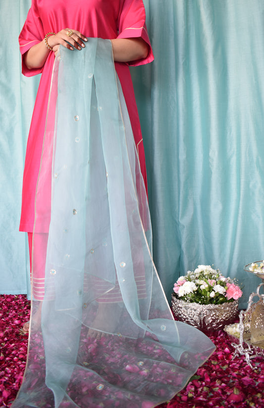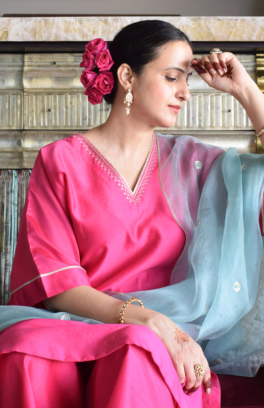 Shyam Chanderi Set with Rani Pink Silk Organza Dupatta