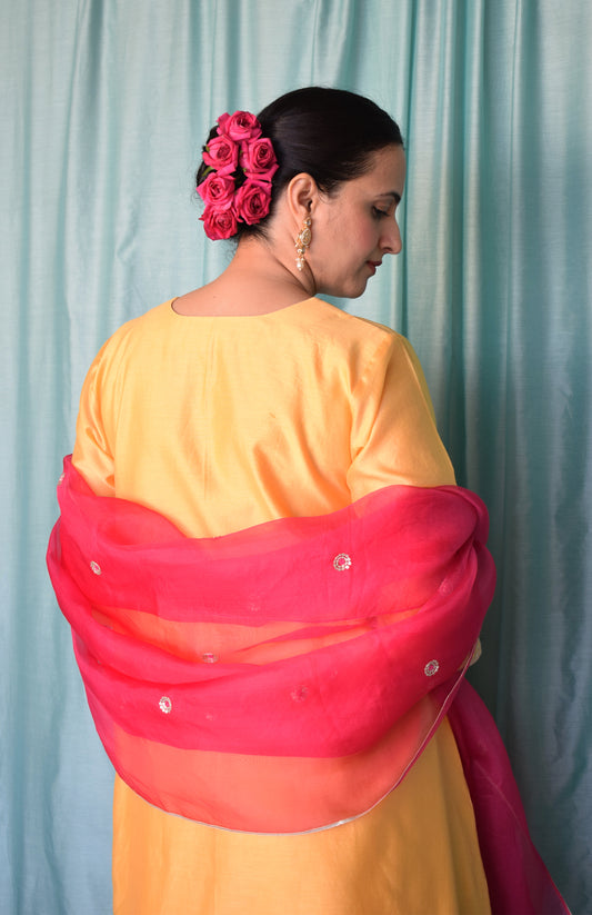 Kanak Chanderi Set with Rani Pink Silk Organza Dupatta