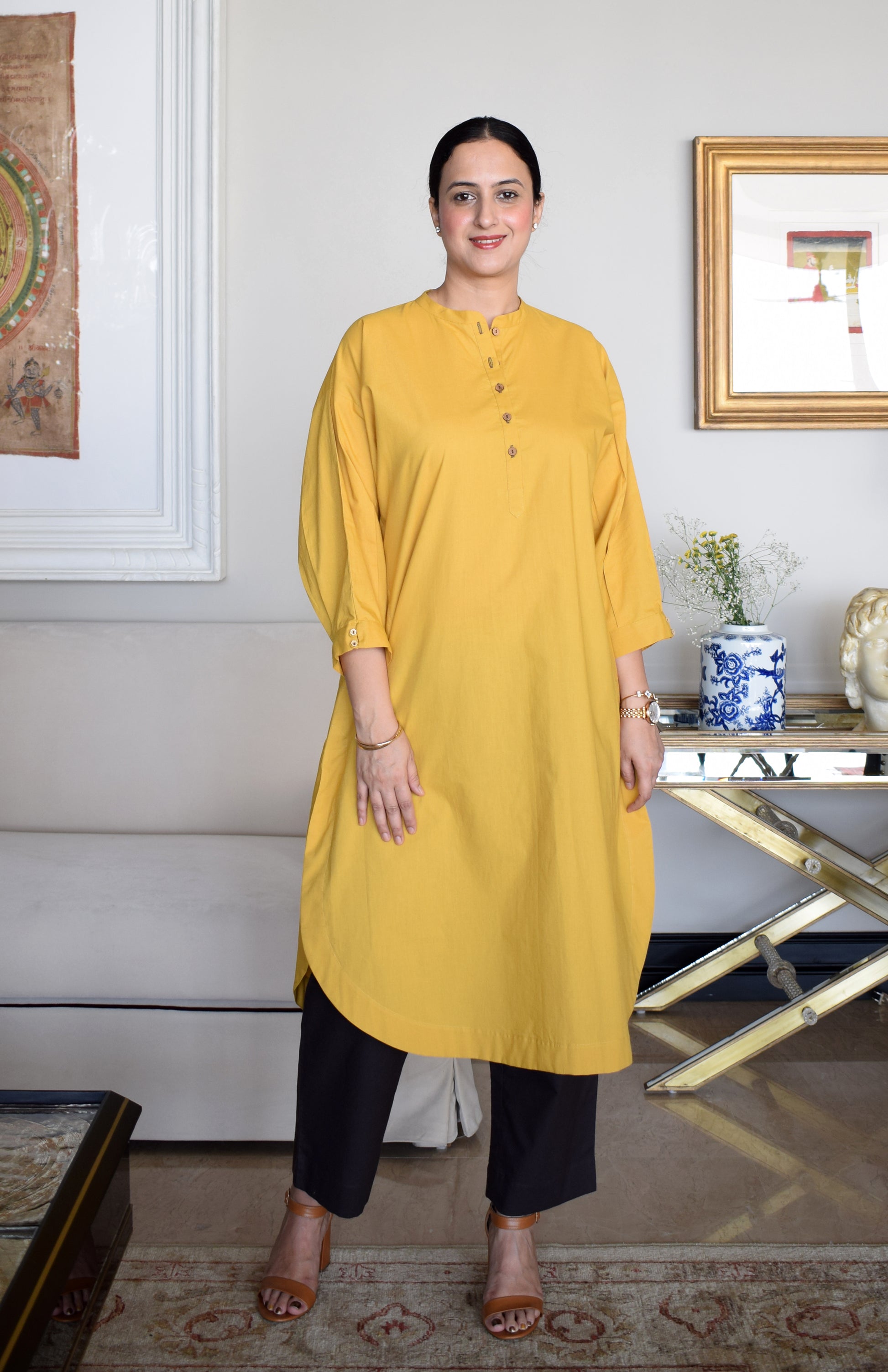 An anti-fit cotton kurta with mandarin collar and front open placket. This kurta has a drop shoulder pattern with loose fitted sleeves and pockets. The back features a yoke with box pleat detail.