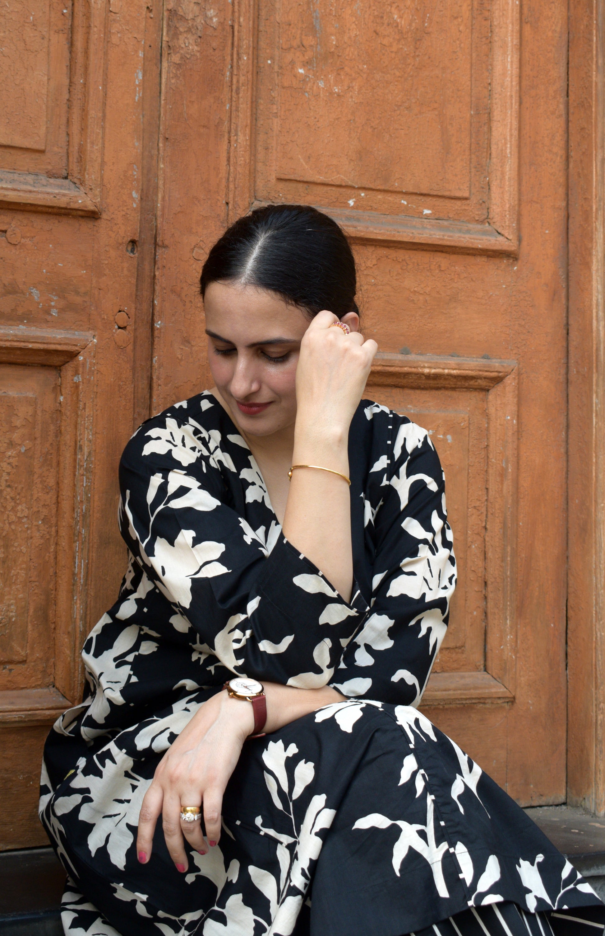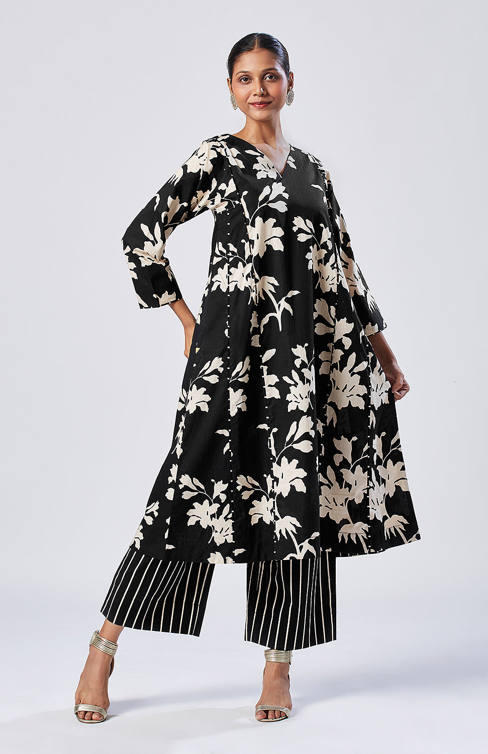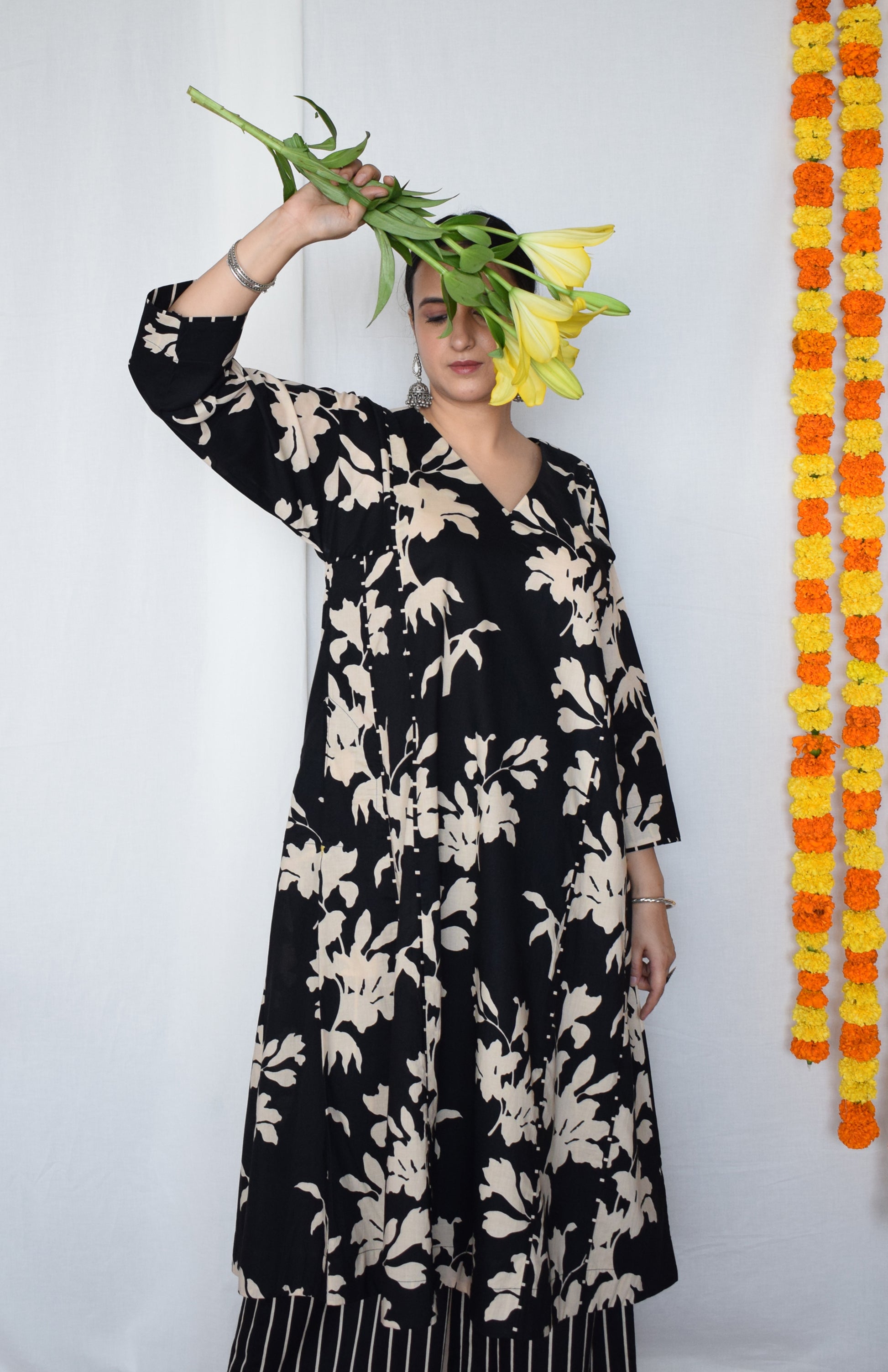 Our Black floral kurta set with striped pajama is best styled as it is. Elevate this look by wearing a pair of traditional juttis and styling it with silver jewelery for a festive look.