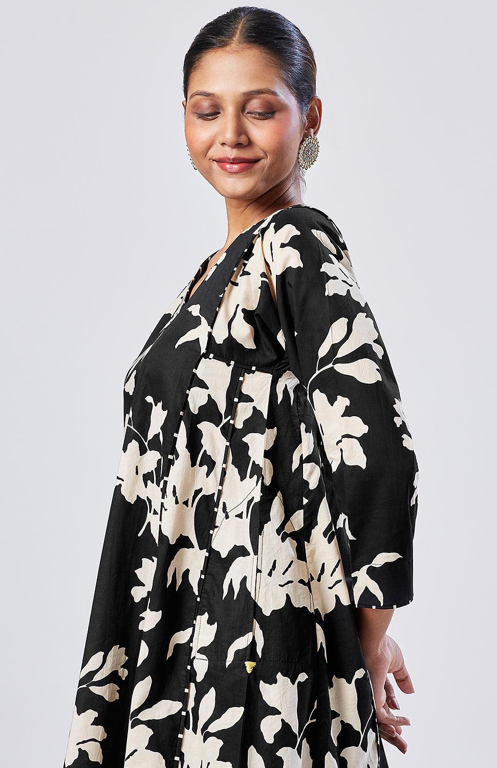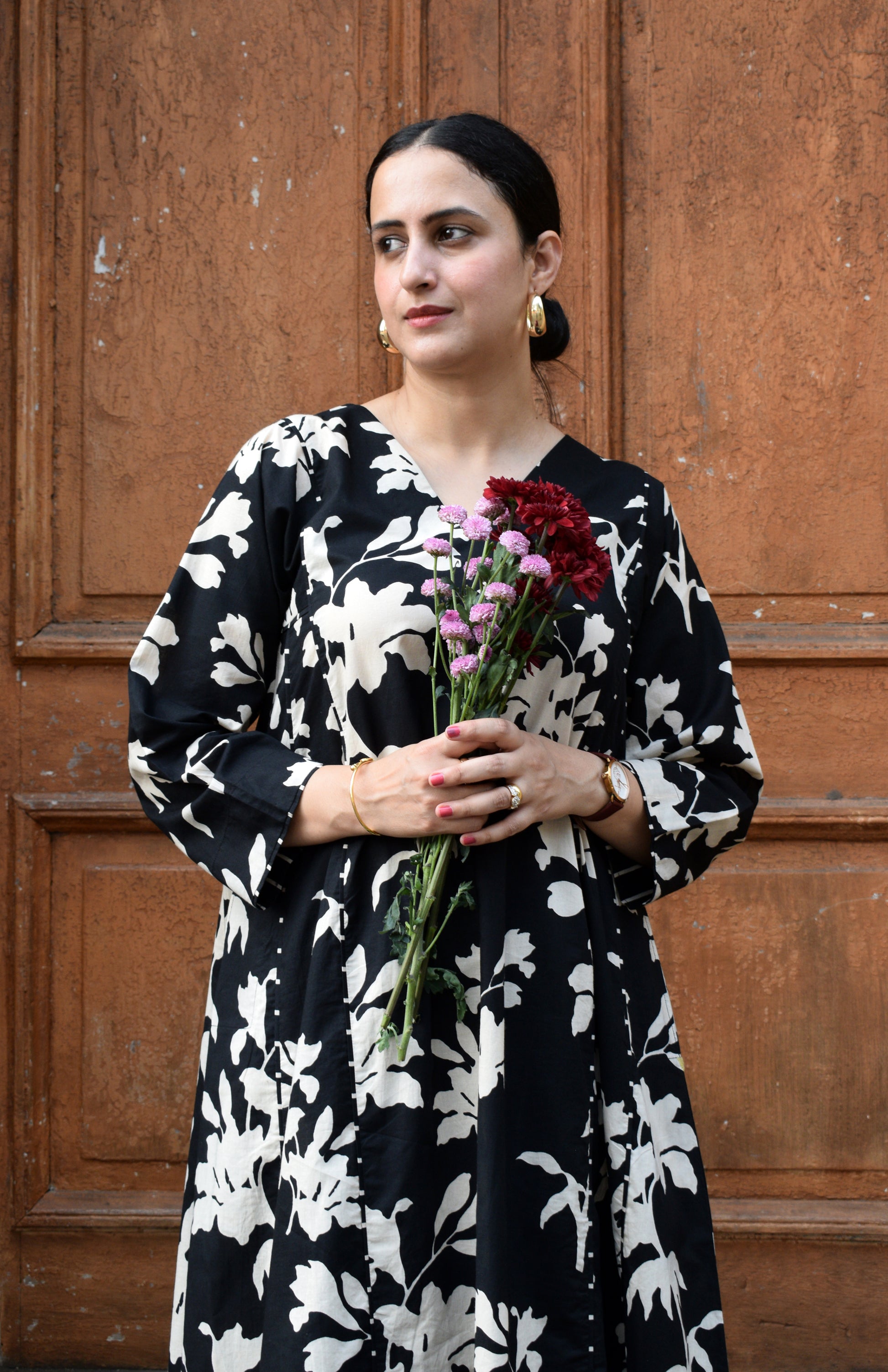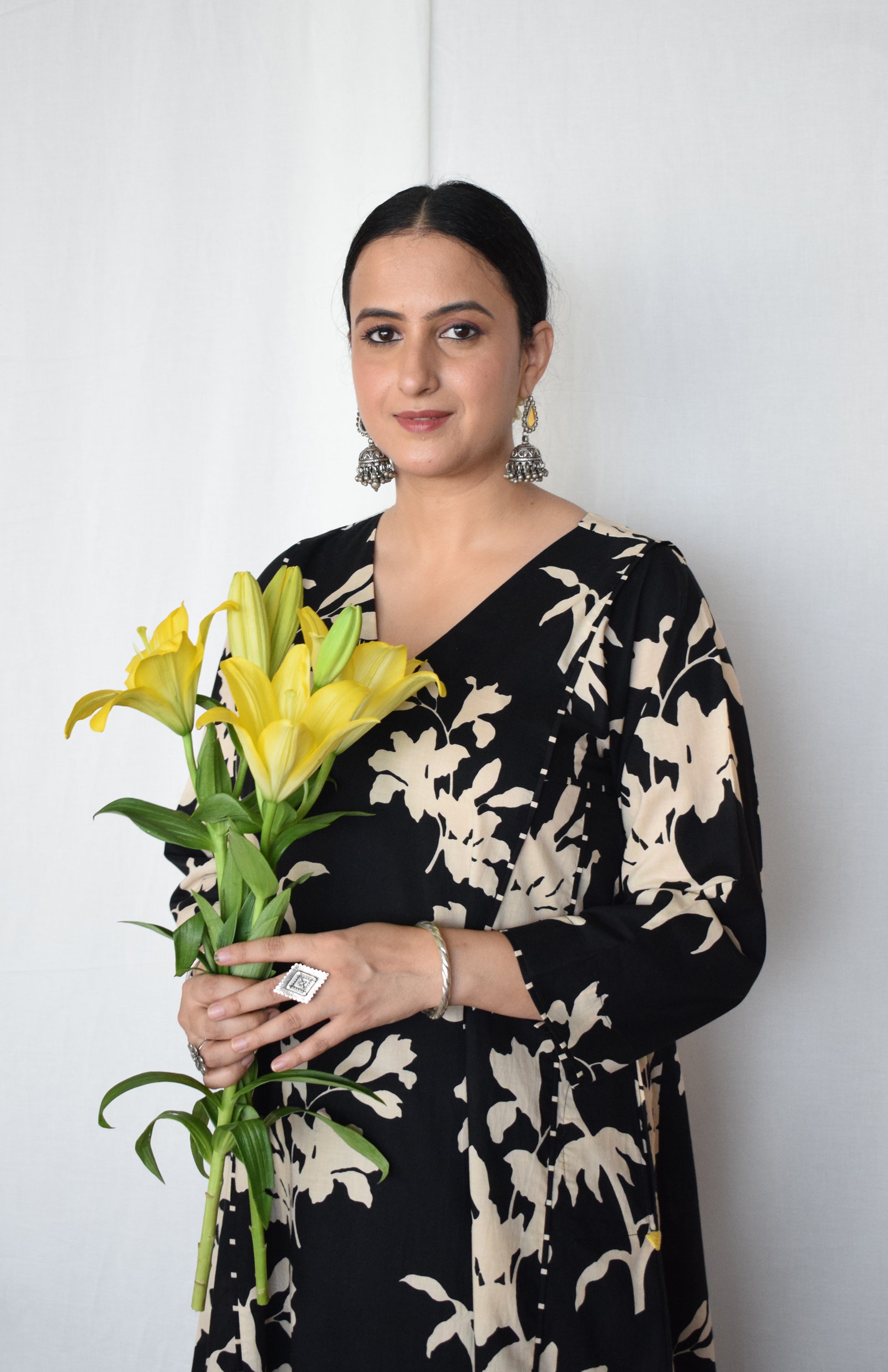Our Black floral kurta set with striped pajama is best styled as it is. Elevate this look by wearing a pair of traditional juttis and styling it with silver jewelery for a festive look.