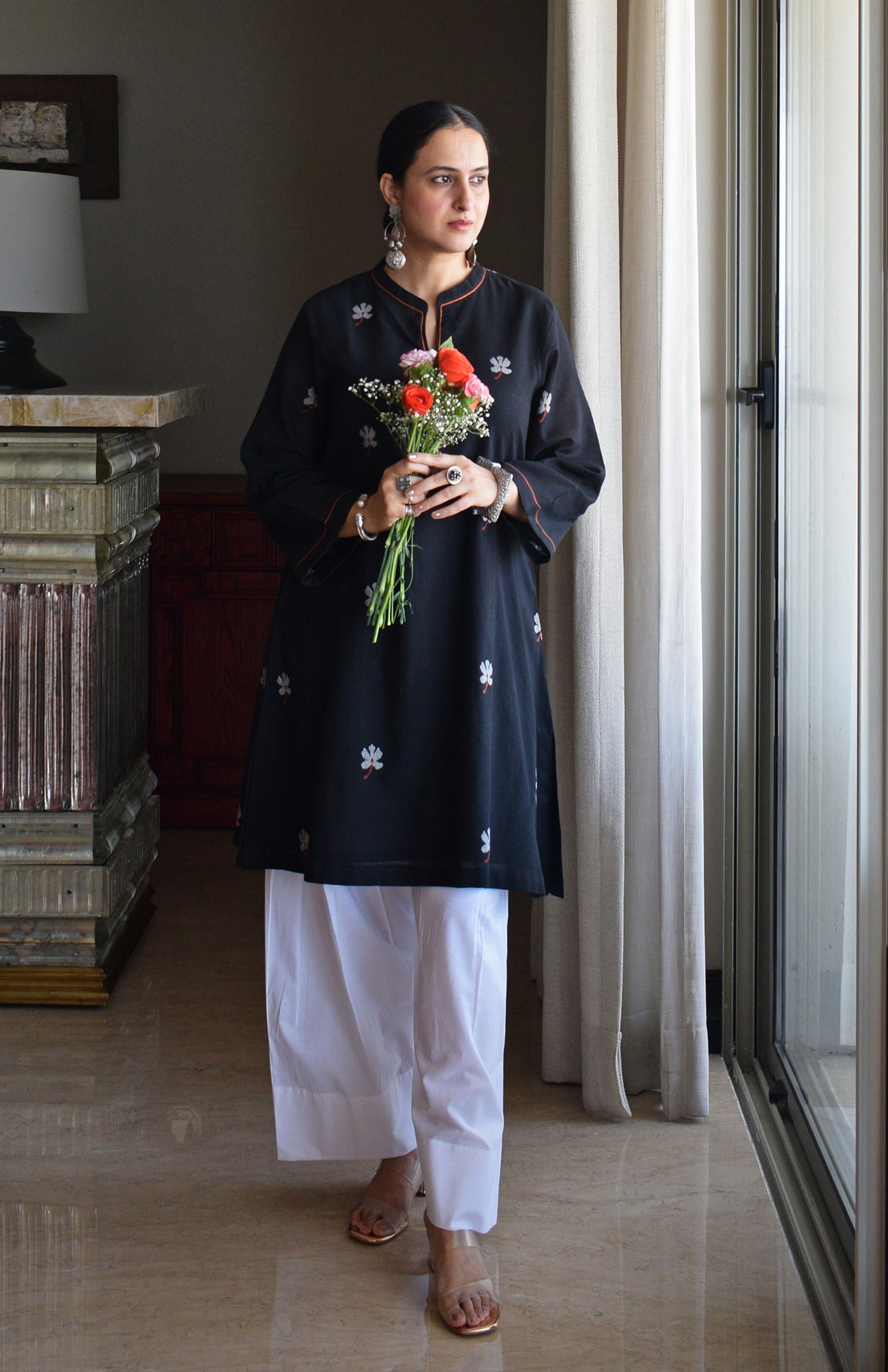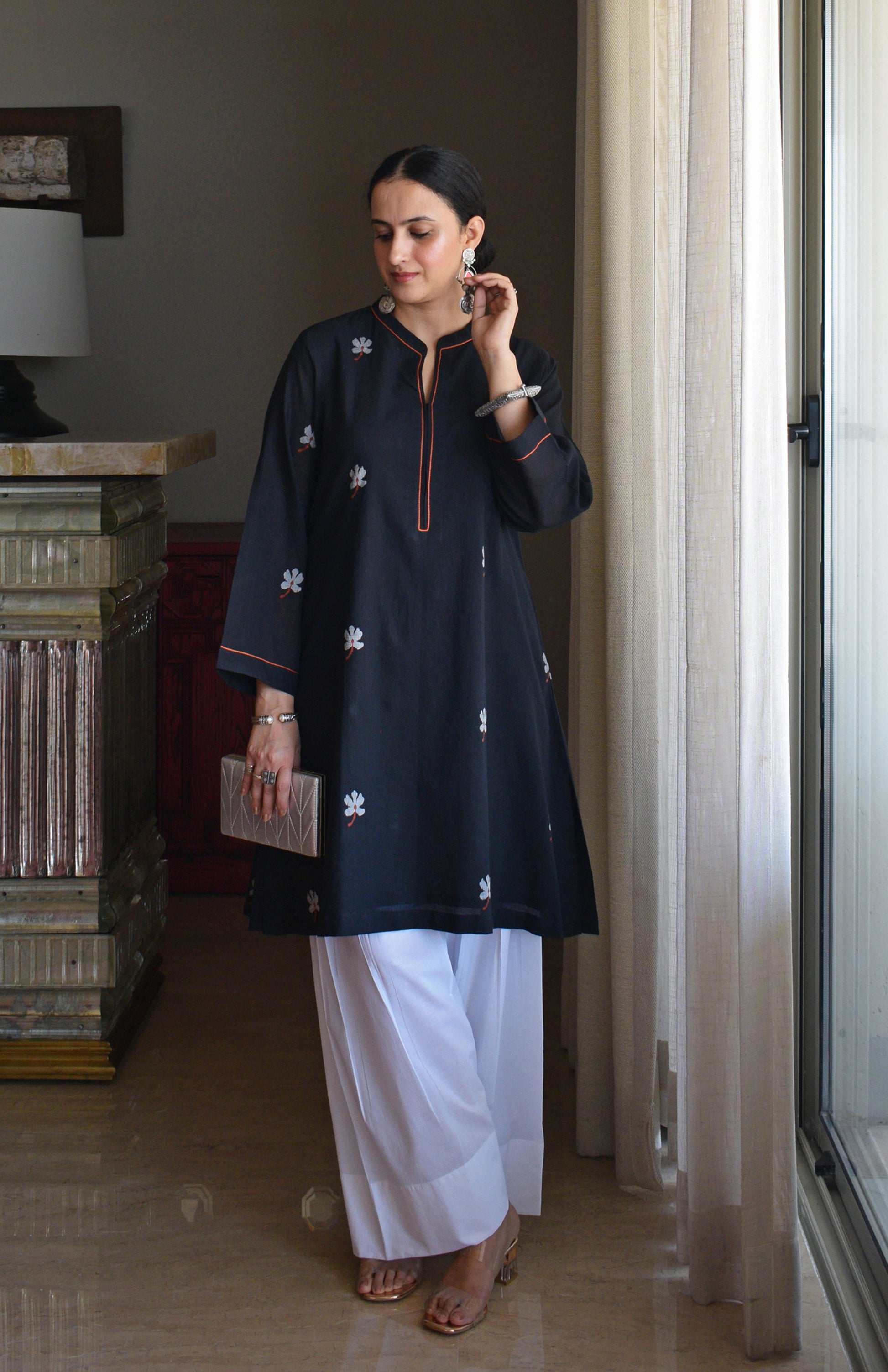 Our Black jamdani short kurta set can be easily styled with statement silver jewelery and flats for an elegant everyday look. For a contemporary vibe, pair it with block heels, a structured bag, or even sneakers for an Indo-fusion touch. Keep hairstyles sleek—like a low bun or ponytail—to complete the look.