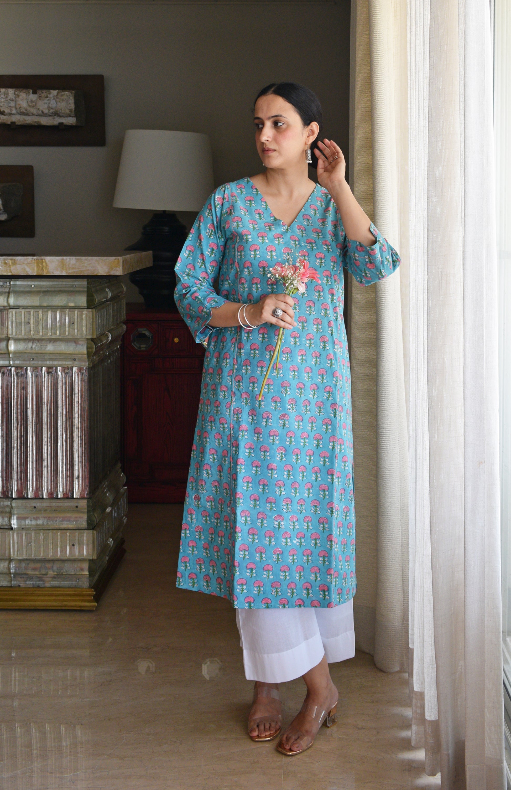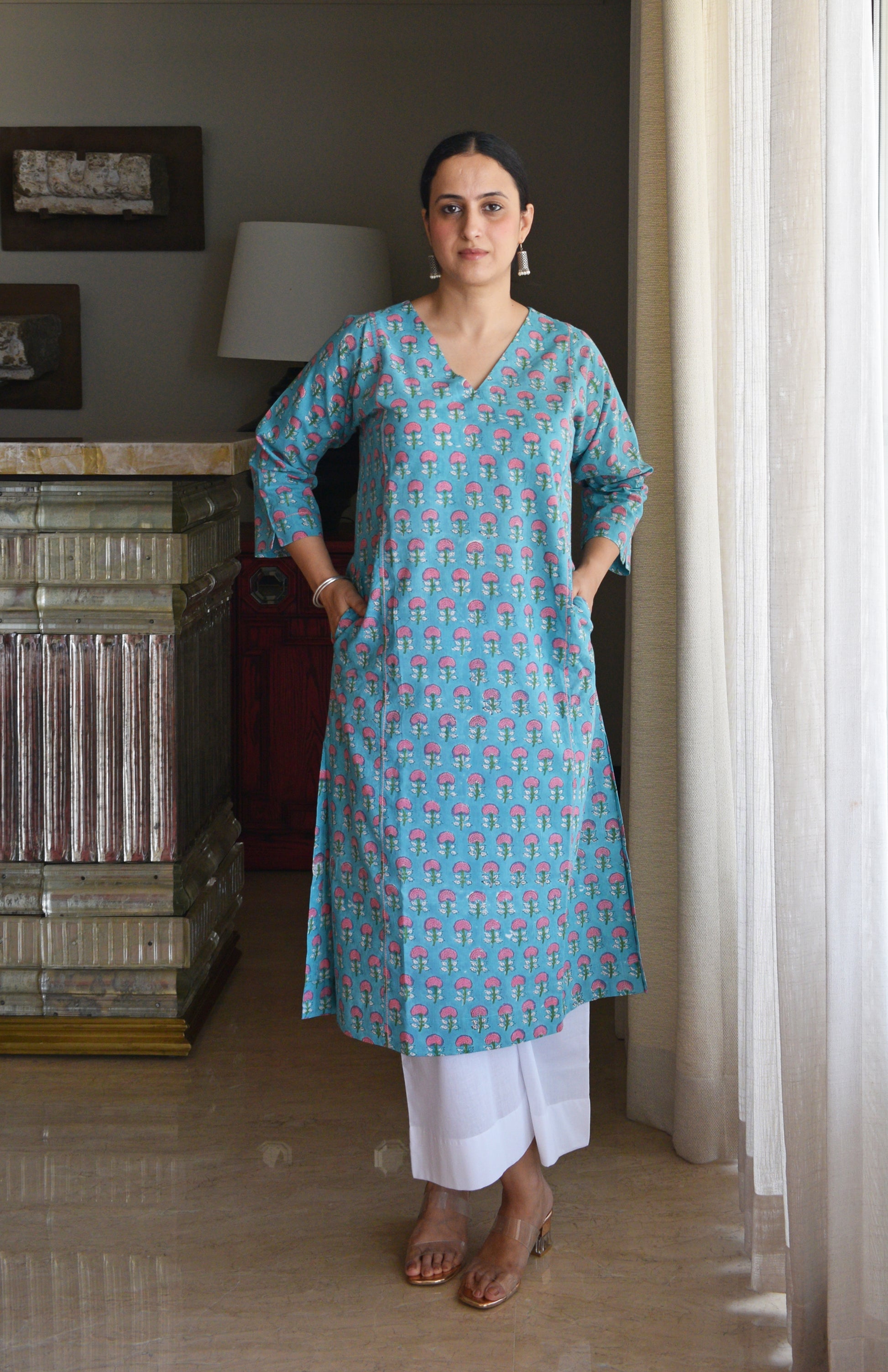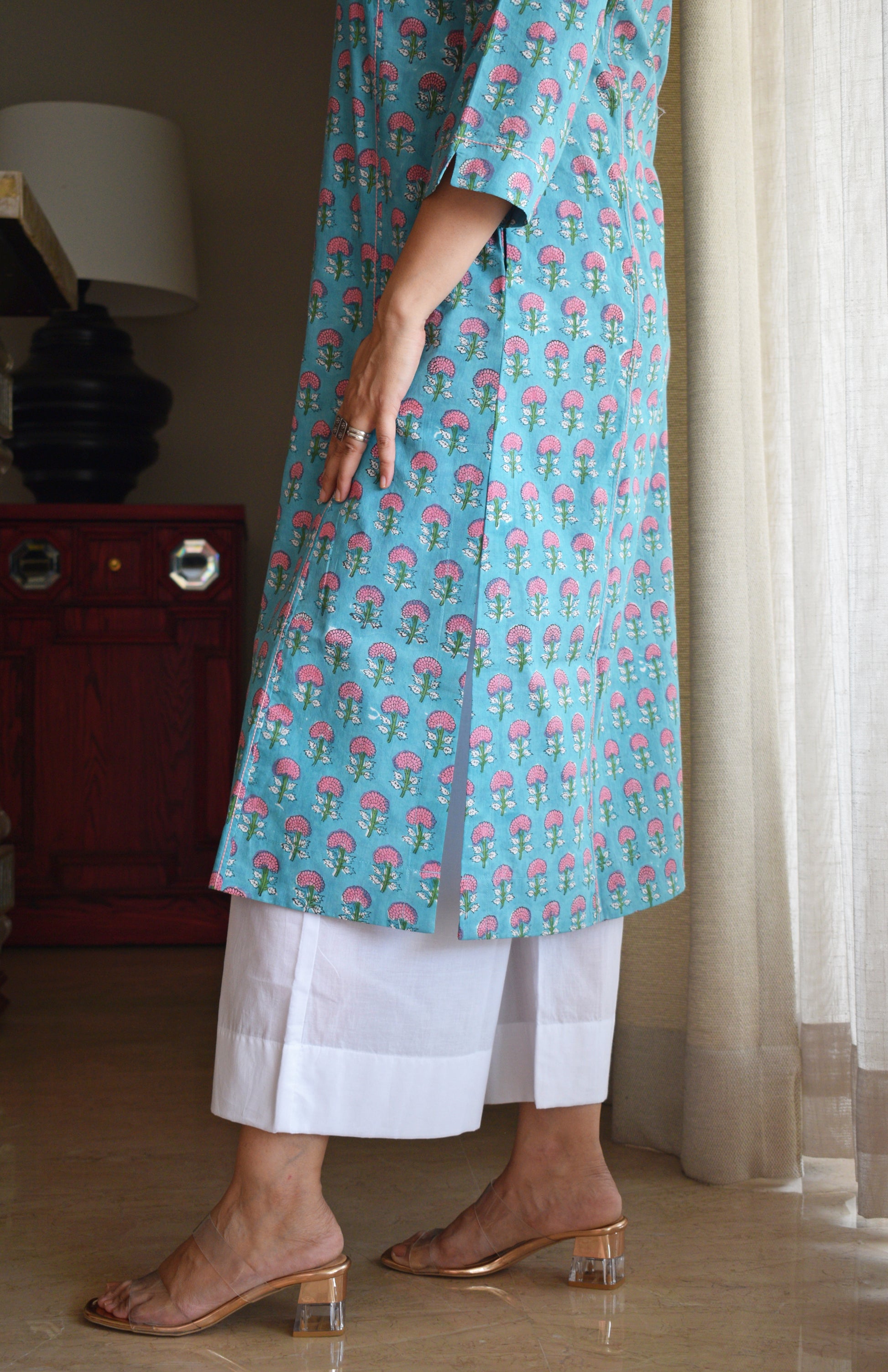 Crafted in soft cotton, this hand block printed kurta set blends simplicity with thoughtful detail. Featuring a straight fit with side slits and a flattering V-neckline, it’s designed for everyday comfort. The front and back panels are subtly highlighted with contrast stitch detail. Perfect for effortless, all-day wear this kurta comes with a pair of white wide-legged pajamas.