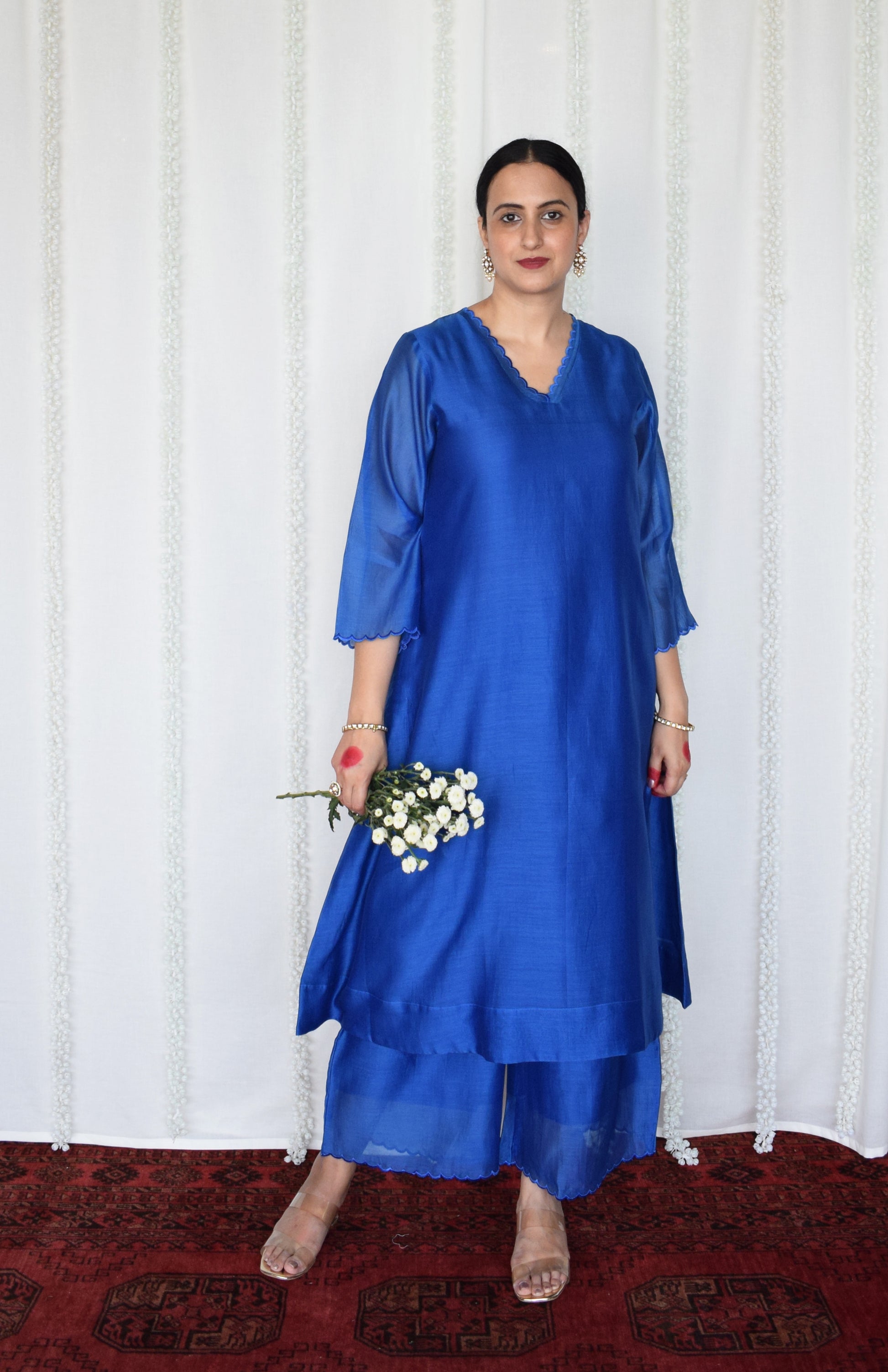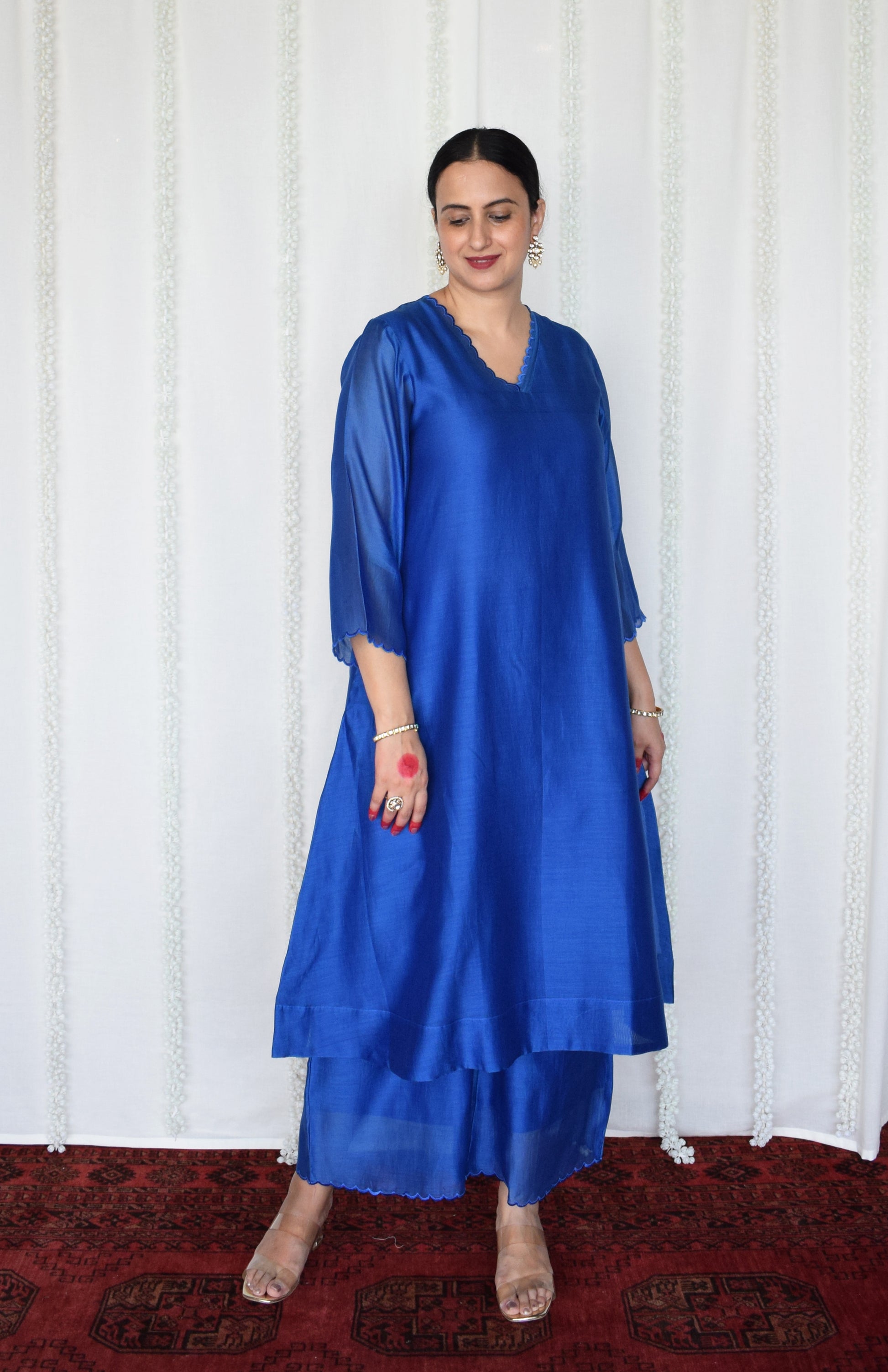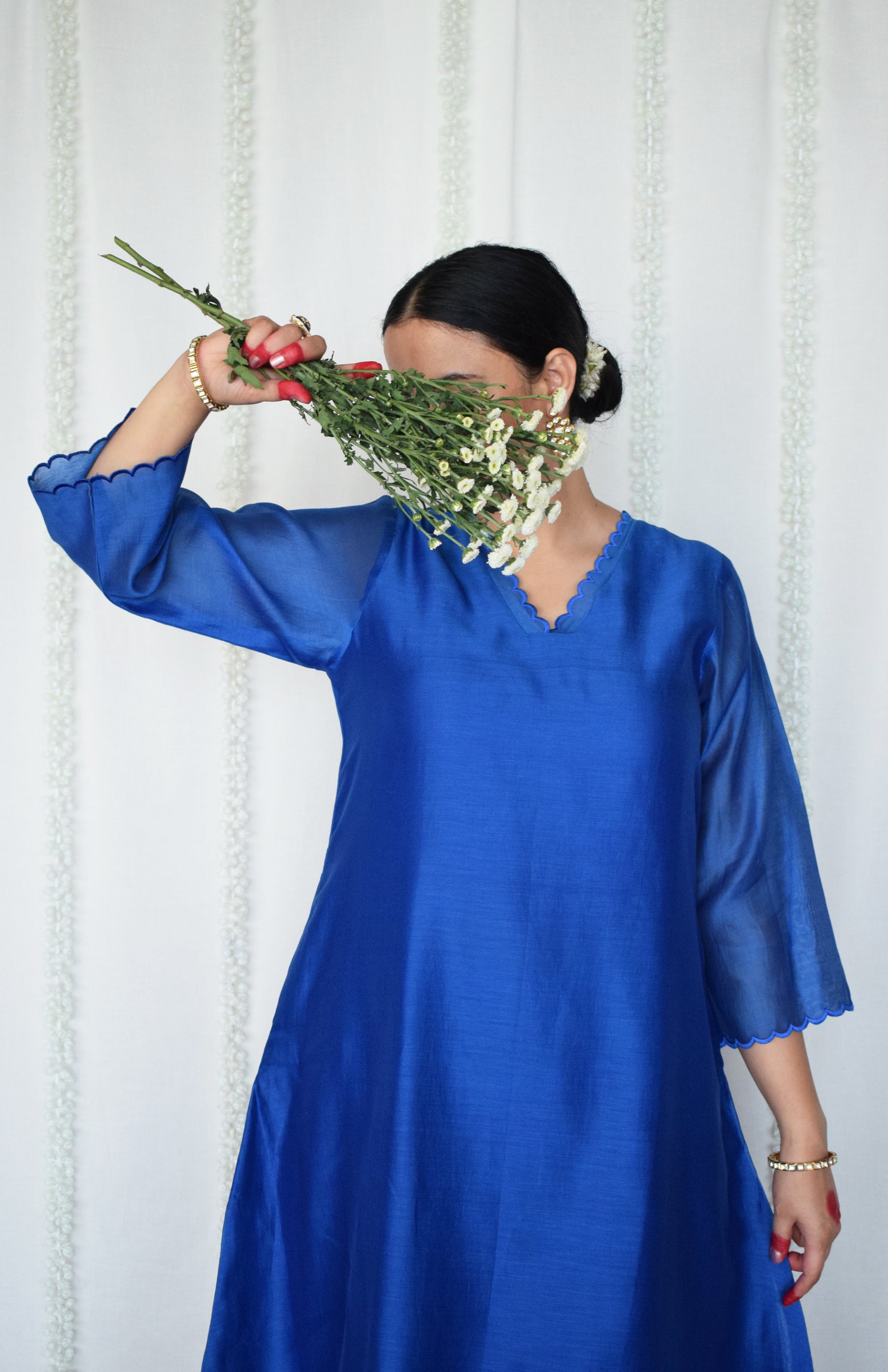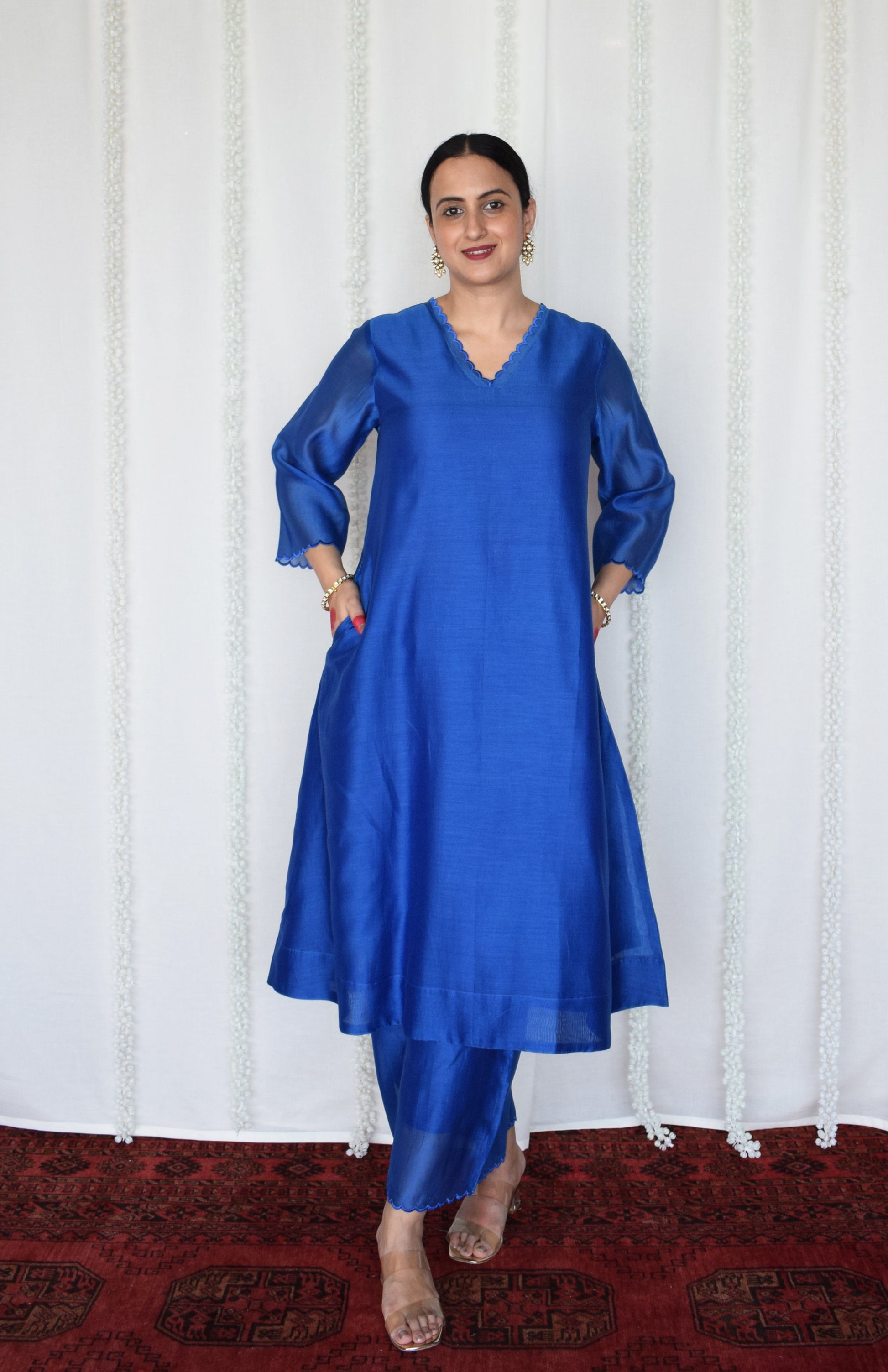 This graceful A-line Kurta Set is crafted from luxurious Chanderi Silk fabric and adorned with intricate zari embroidery. It features delicate scalloped edge detailing on the neckline, sleeves, and pajama hemline, adding a touch of sophistication. Both the kurta and pajama are fully lined with soft mul cotton for added comfort.