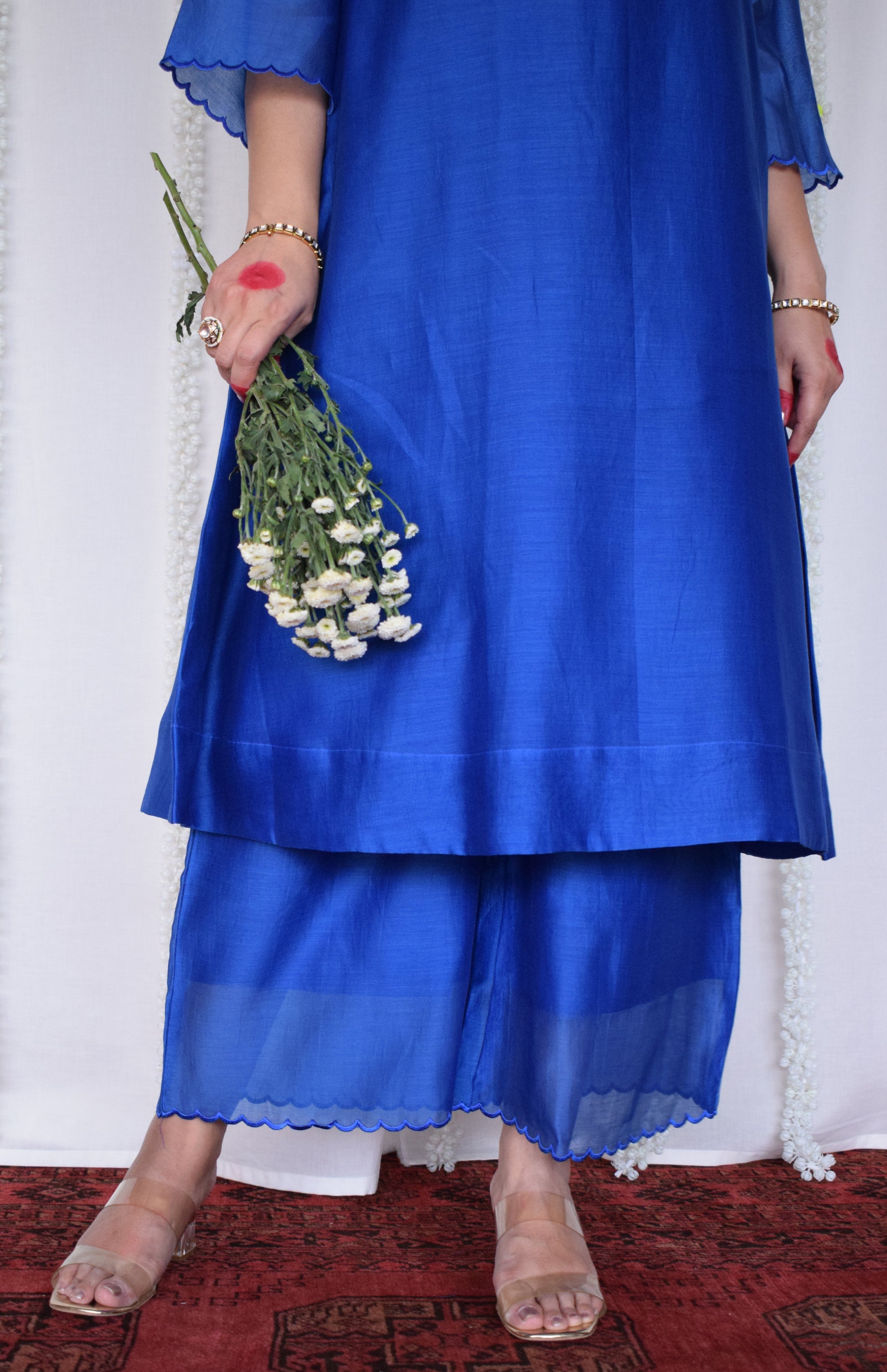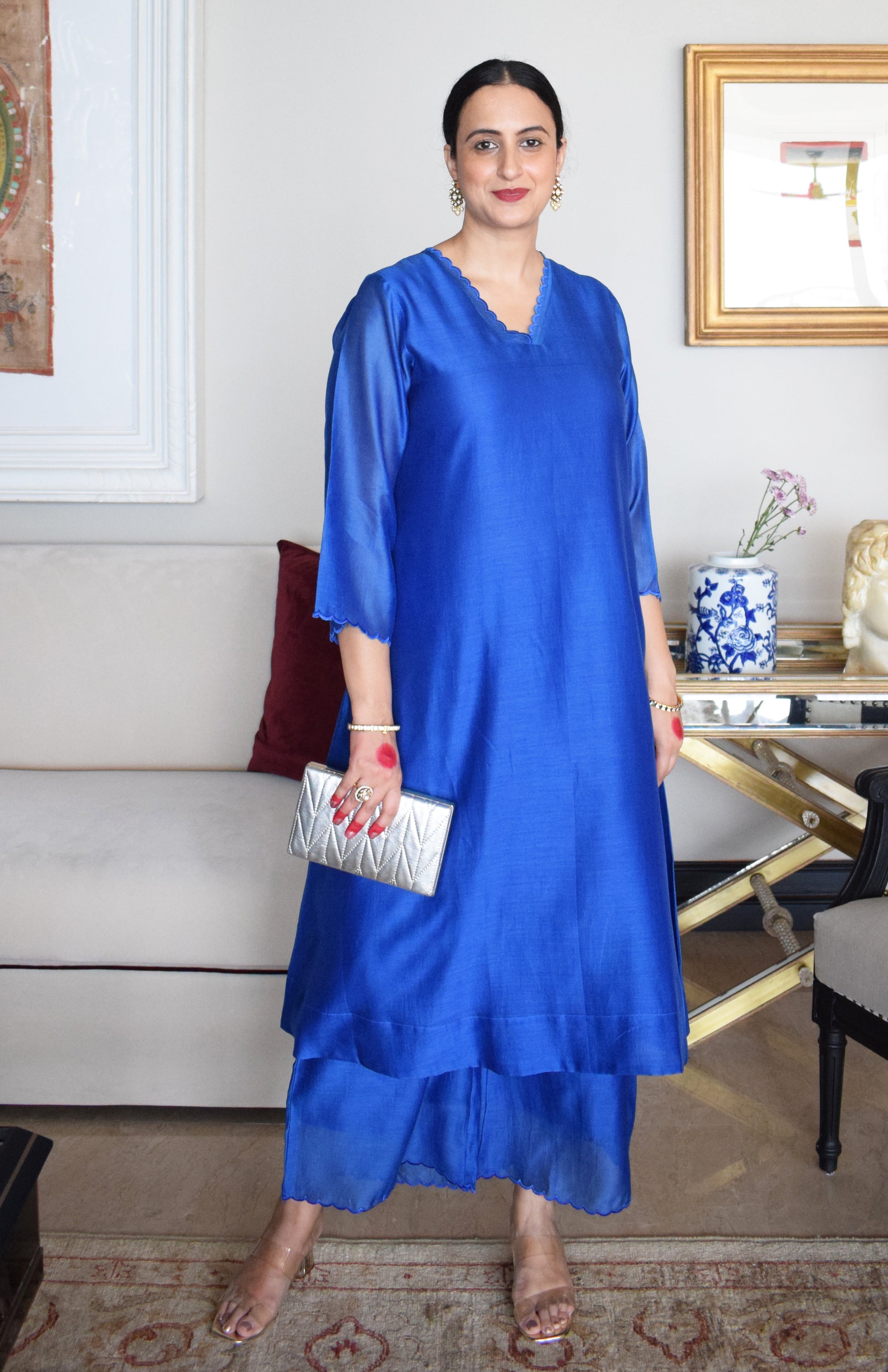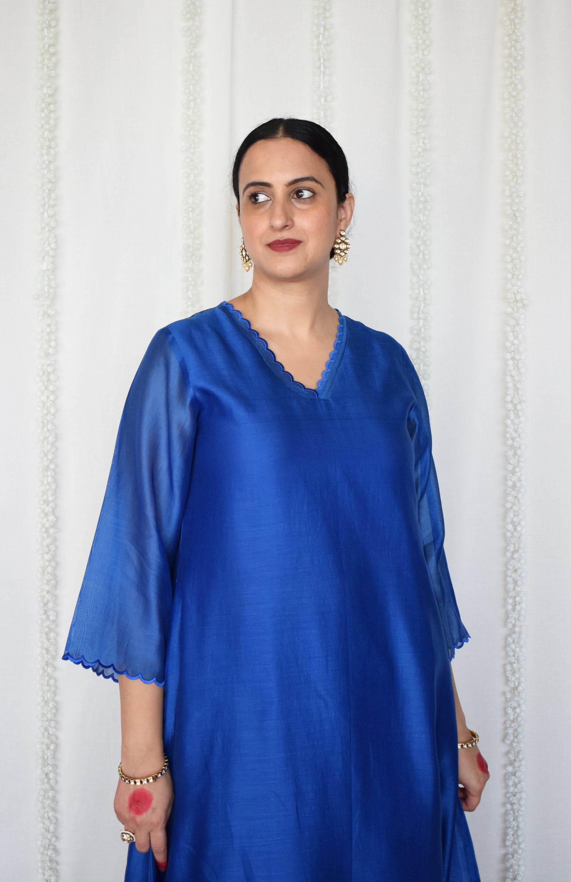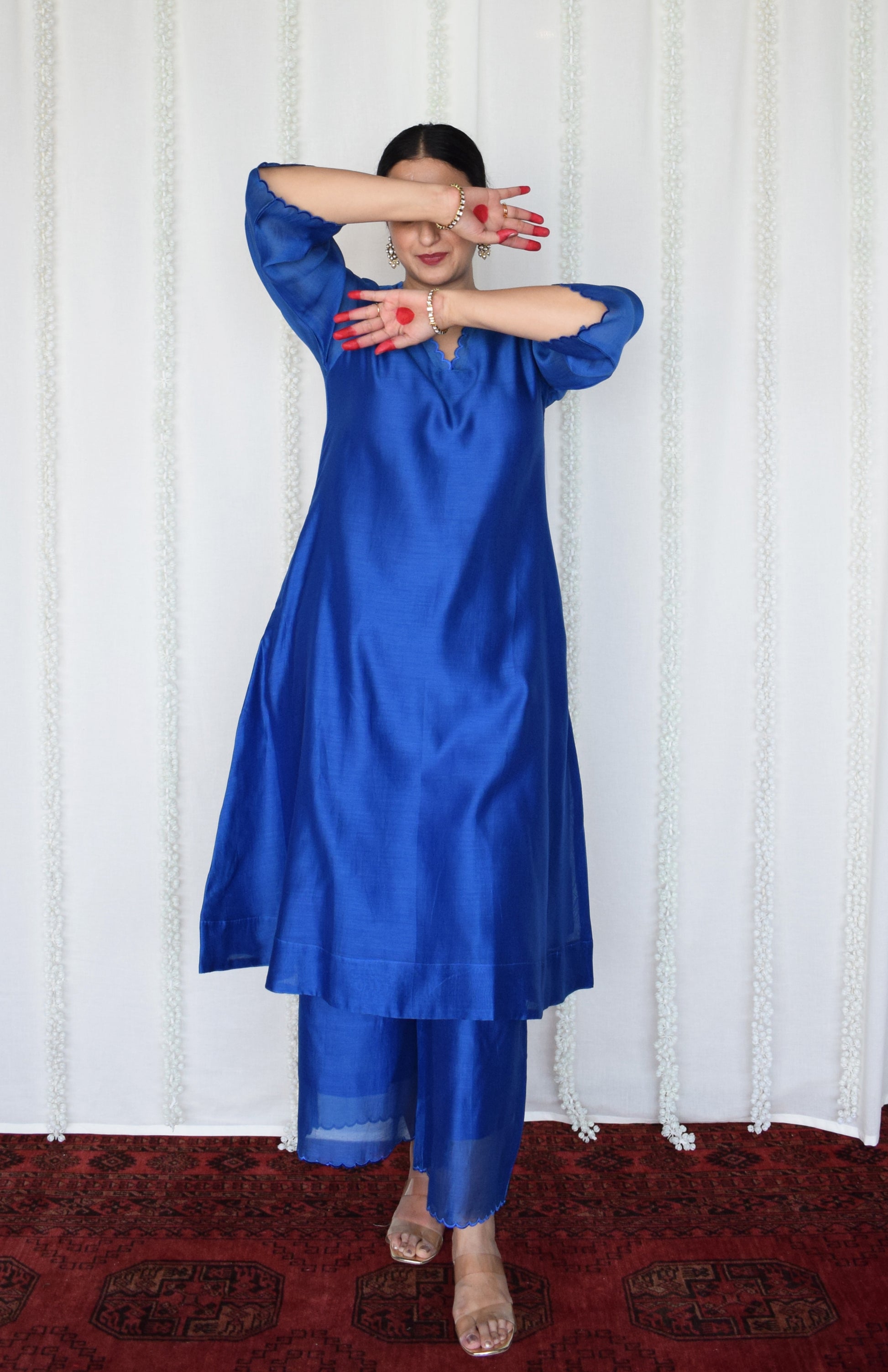 This graceful A-line Kurta Set is crafted from luxurious Chanderi Silk fabric and adorned with intricate zari embroidery. It features delicate scalloped edge detailing on the neckline, sleeves, and pajama hemline, adding a touch of sophistication. Both the kurta and pajama are fully lined with soft mul cotton for added comfort.