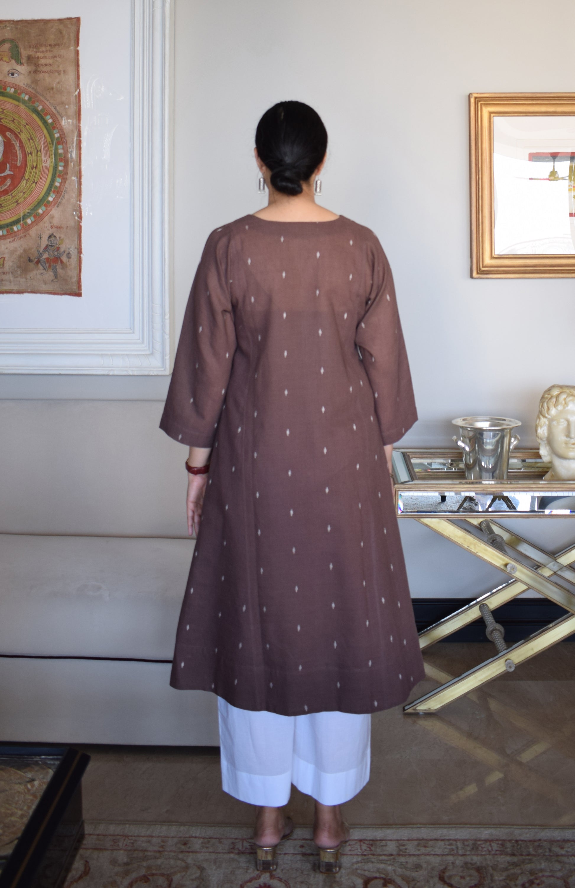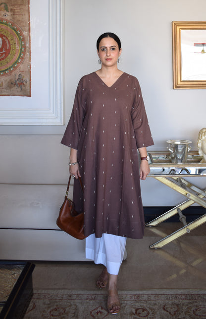 Loose-fitted long Jamdani kurta stitched in phiran style with side panels and gusset. This kurta has no armhole. It is an A-line fit with pockets on both sides of the kurta. This kurta comes with a mul cotton slip.