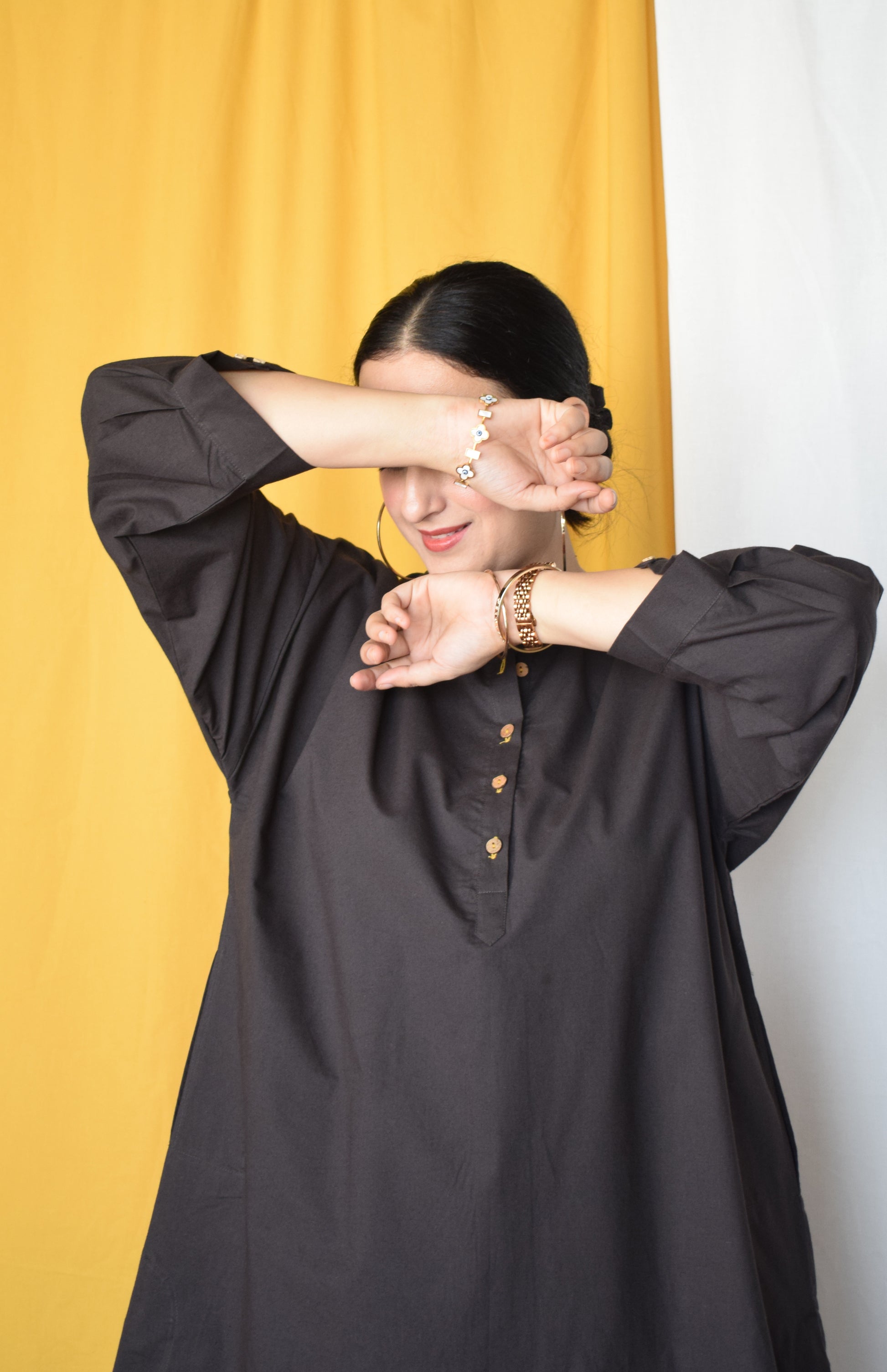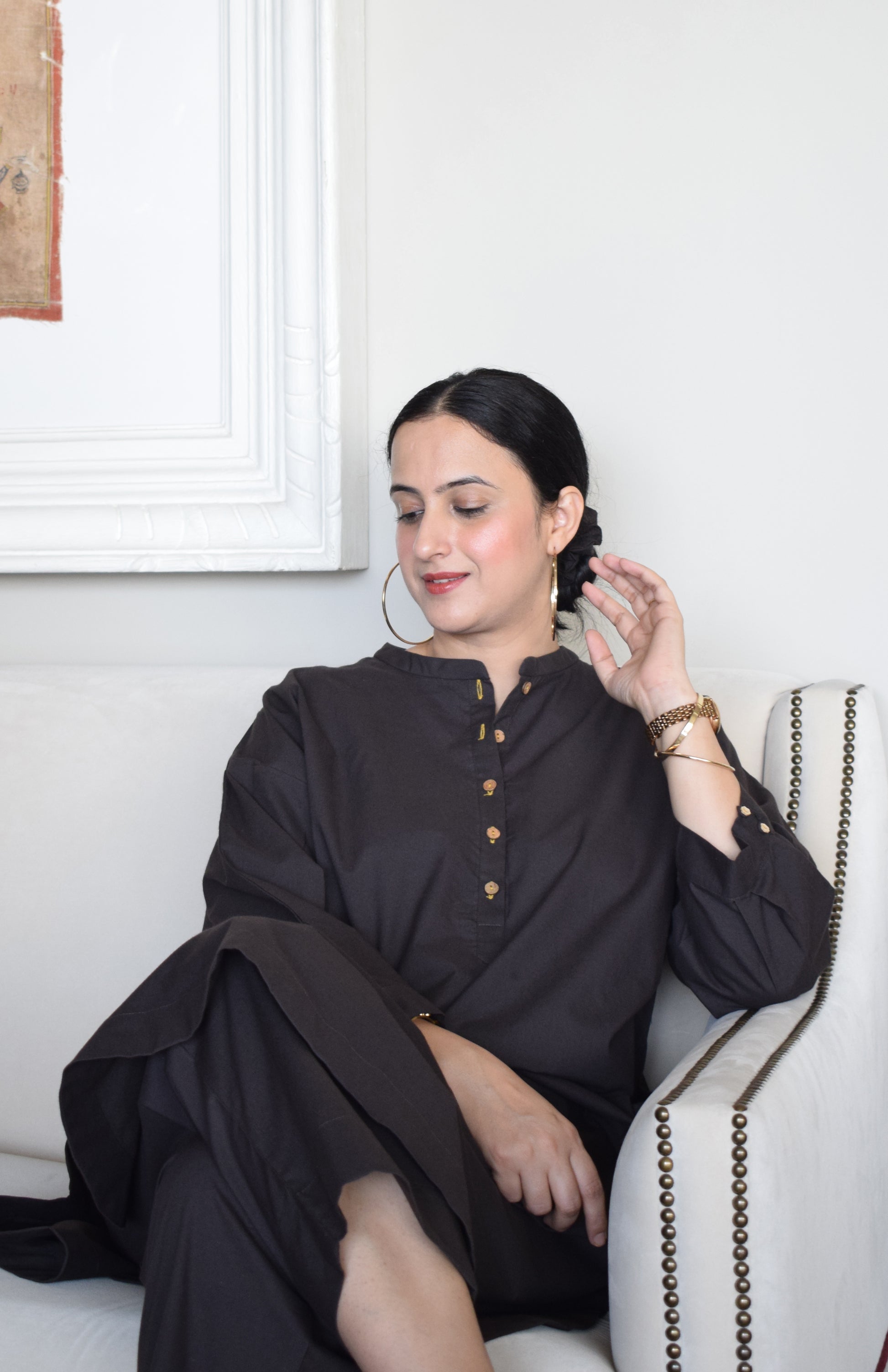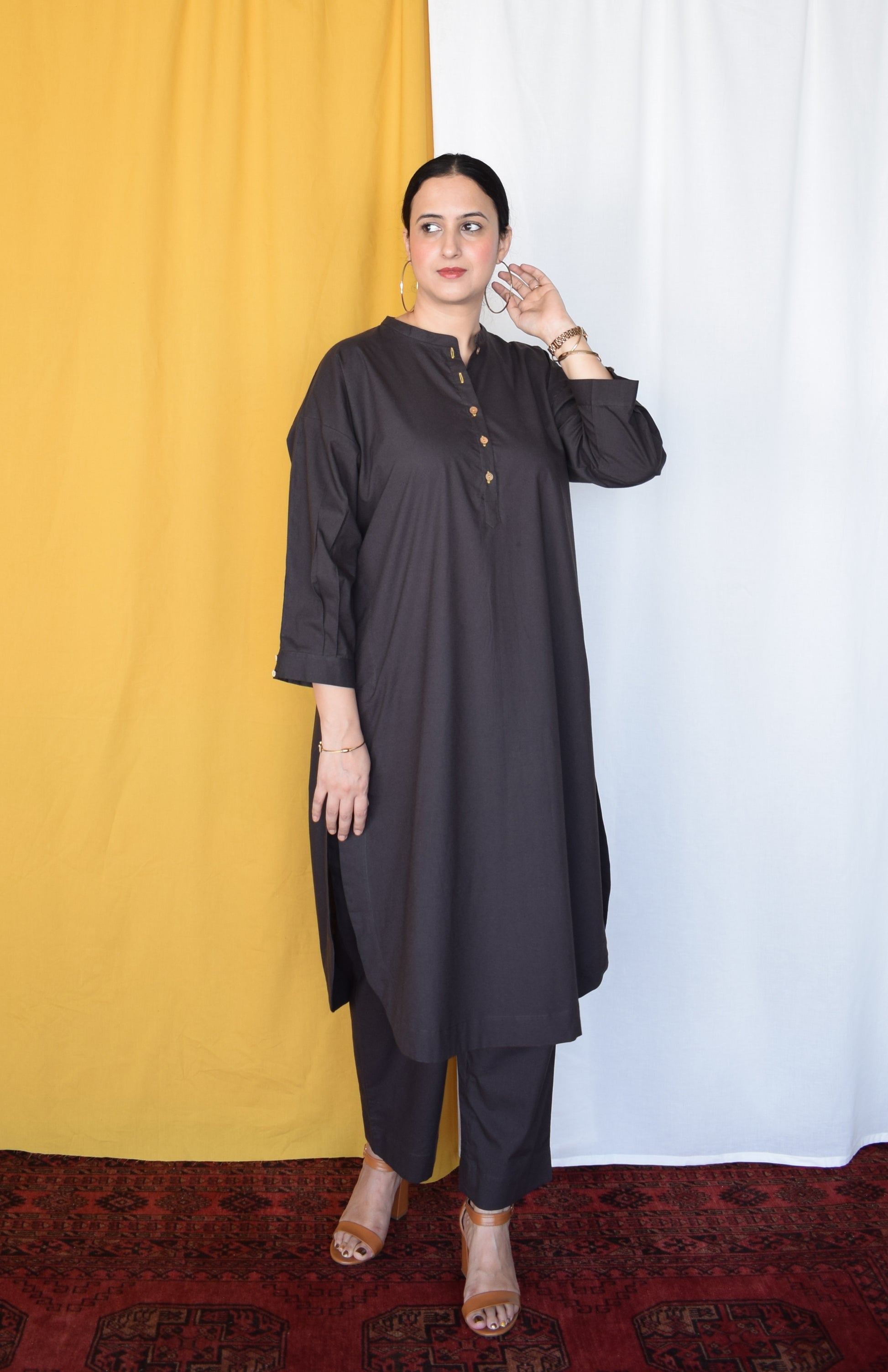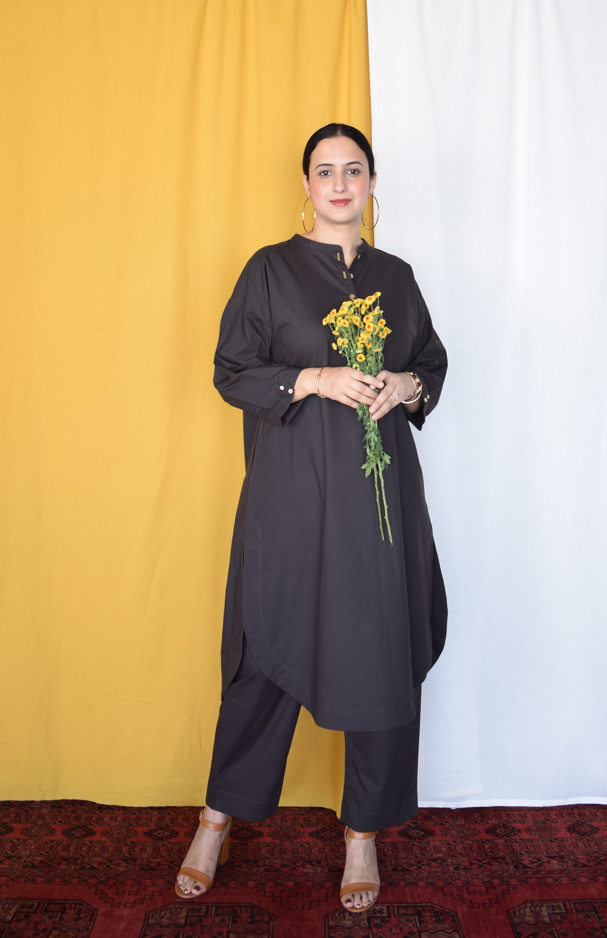 An anti-fit cotton kurta with mandarin collar and front open placket. This kurta has a drop shoulder pattern with loose fitted sleeves. The back features a yoke with box pleat detail. This set comes with a pair of straight fit pants in the same color with full elastic waistband.