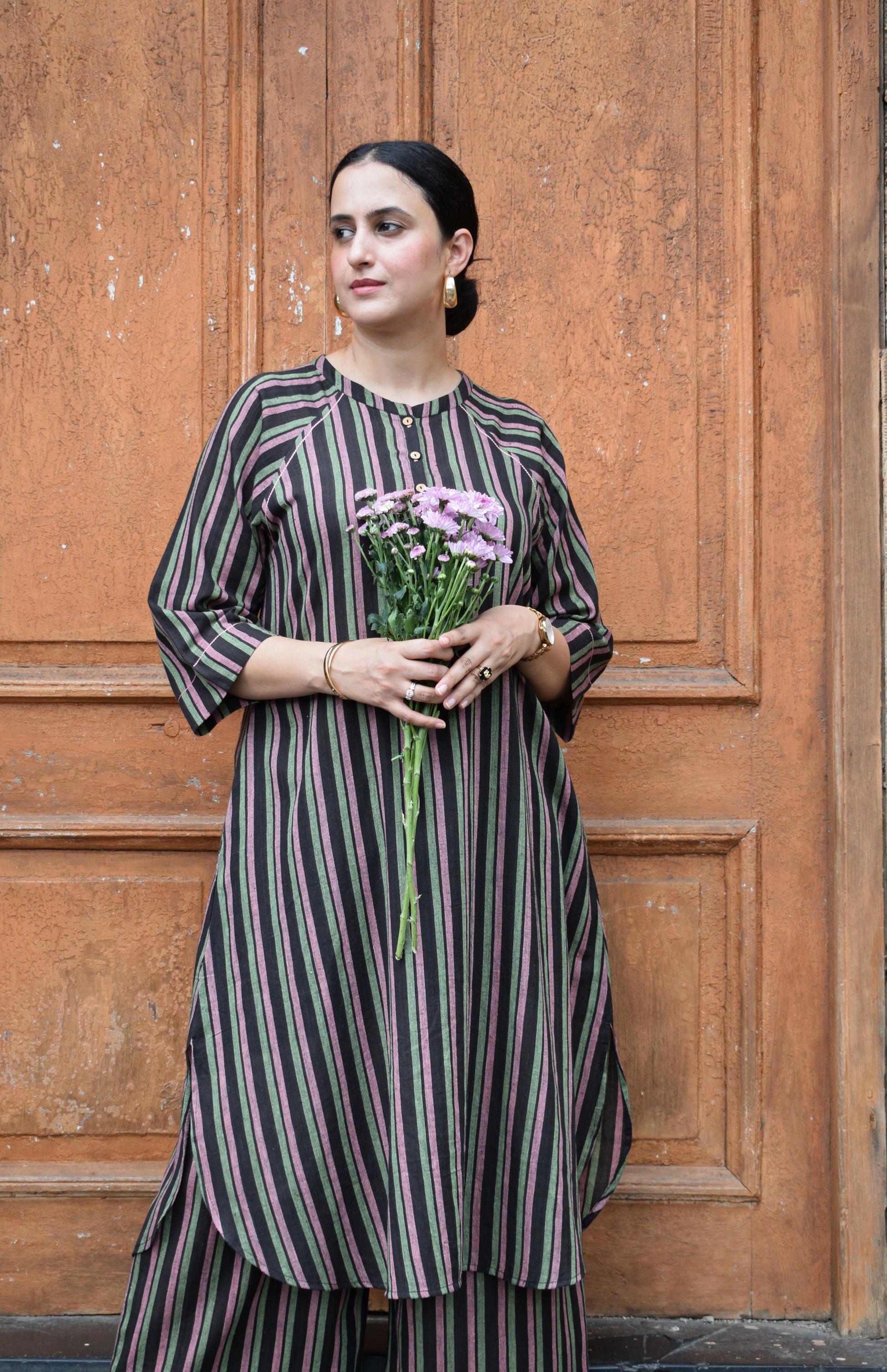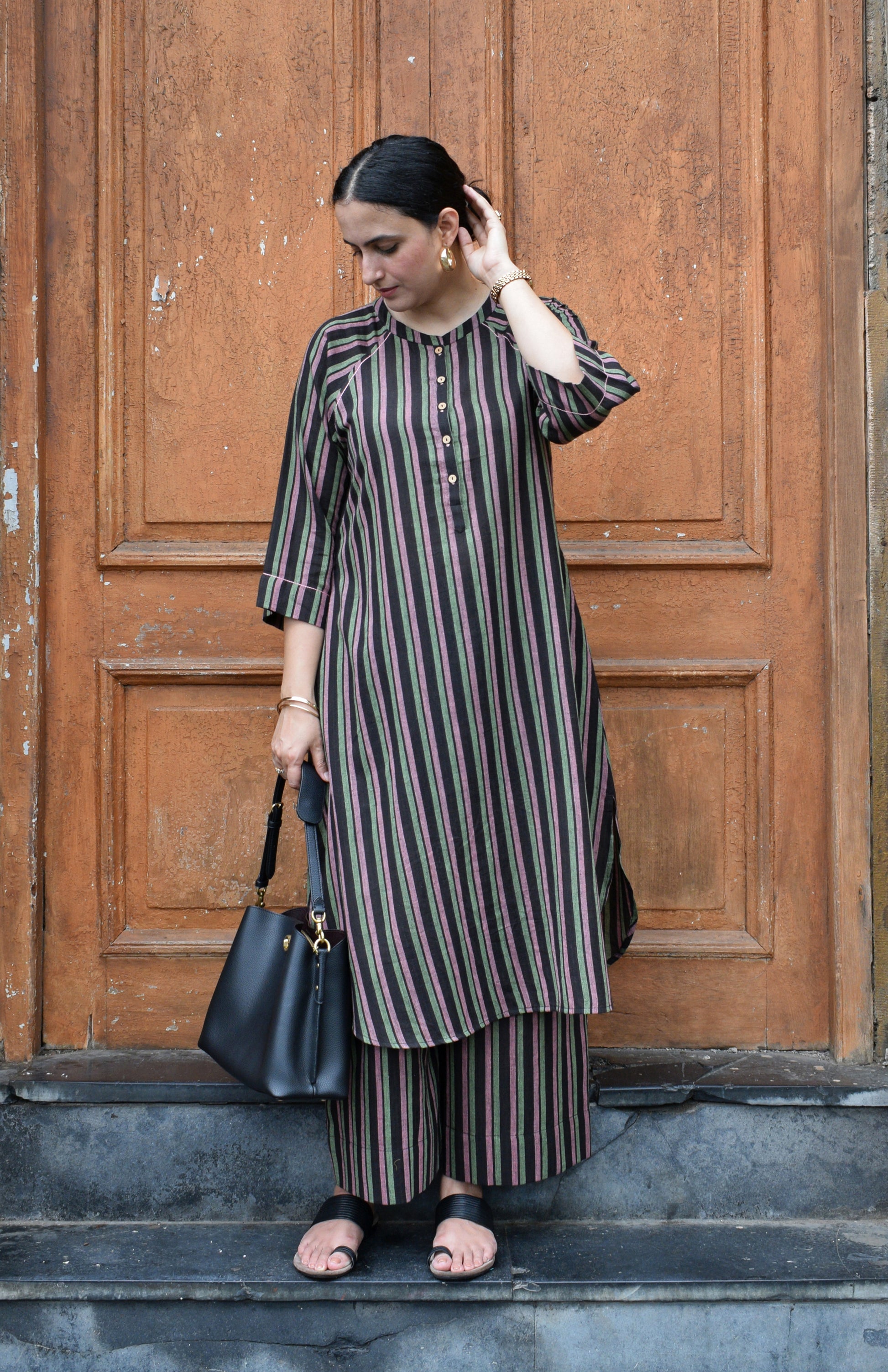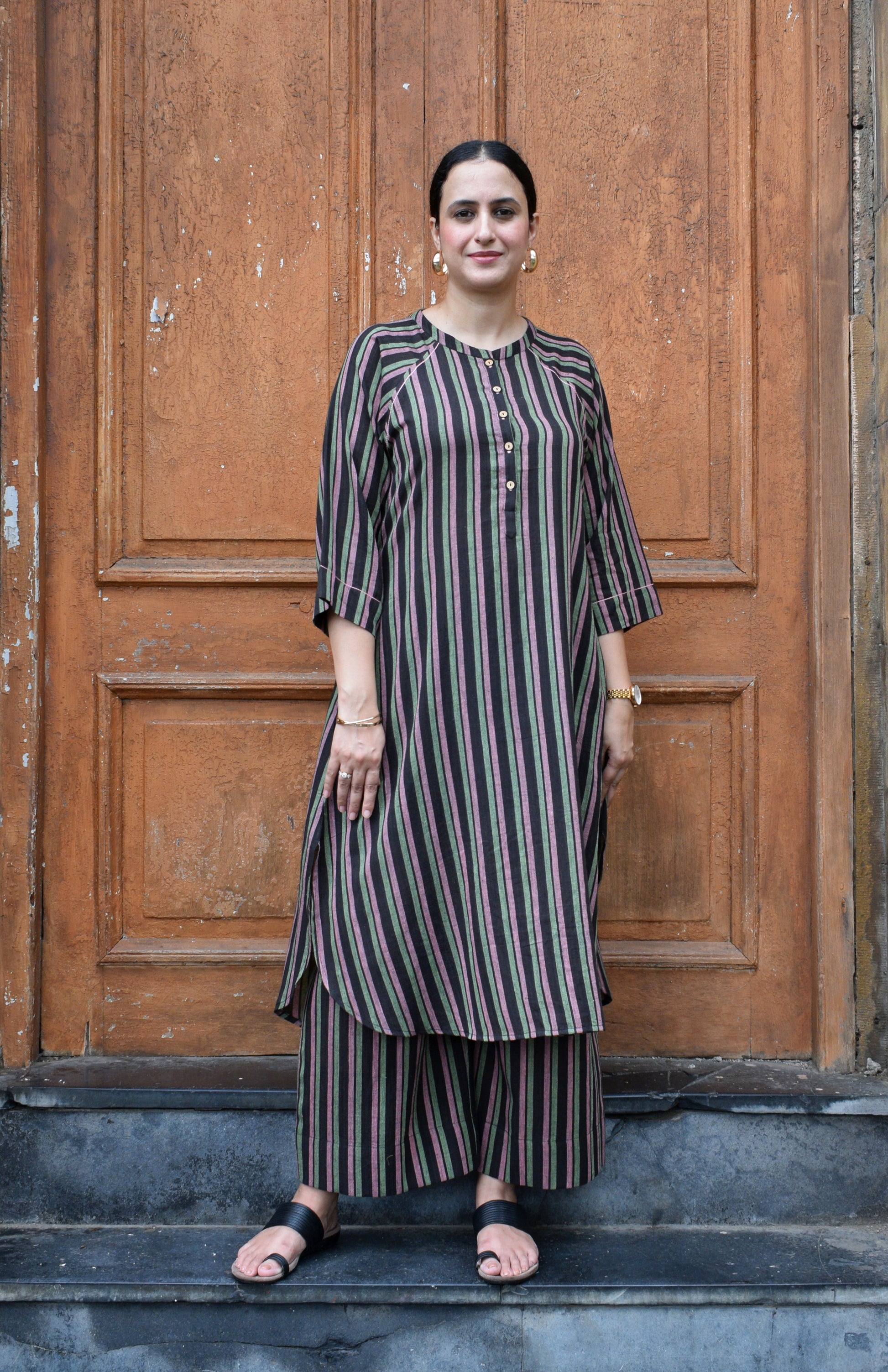 Our Charcoal Handwoven Striped Co-ord set with raglan sleeves and wide legged pyjama is the perfect ensemble for any season. It can be worn as a set as it is and styled with golden/ brass jewellery with a layered statement necklace. It is easy to maintain and is very soft against the skin, stripes are a classic for every wardrobe