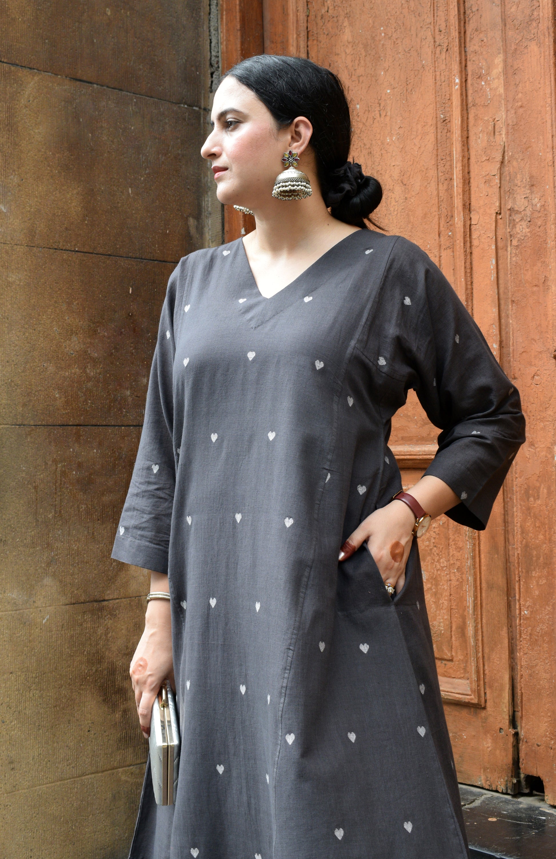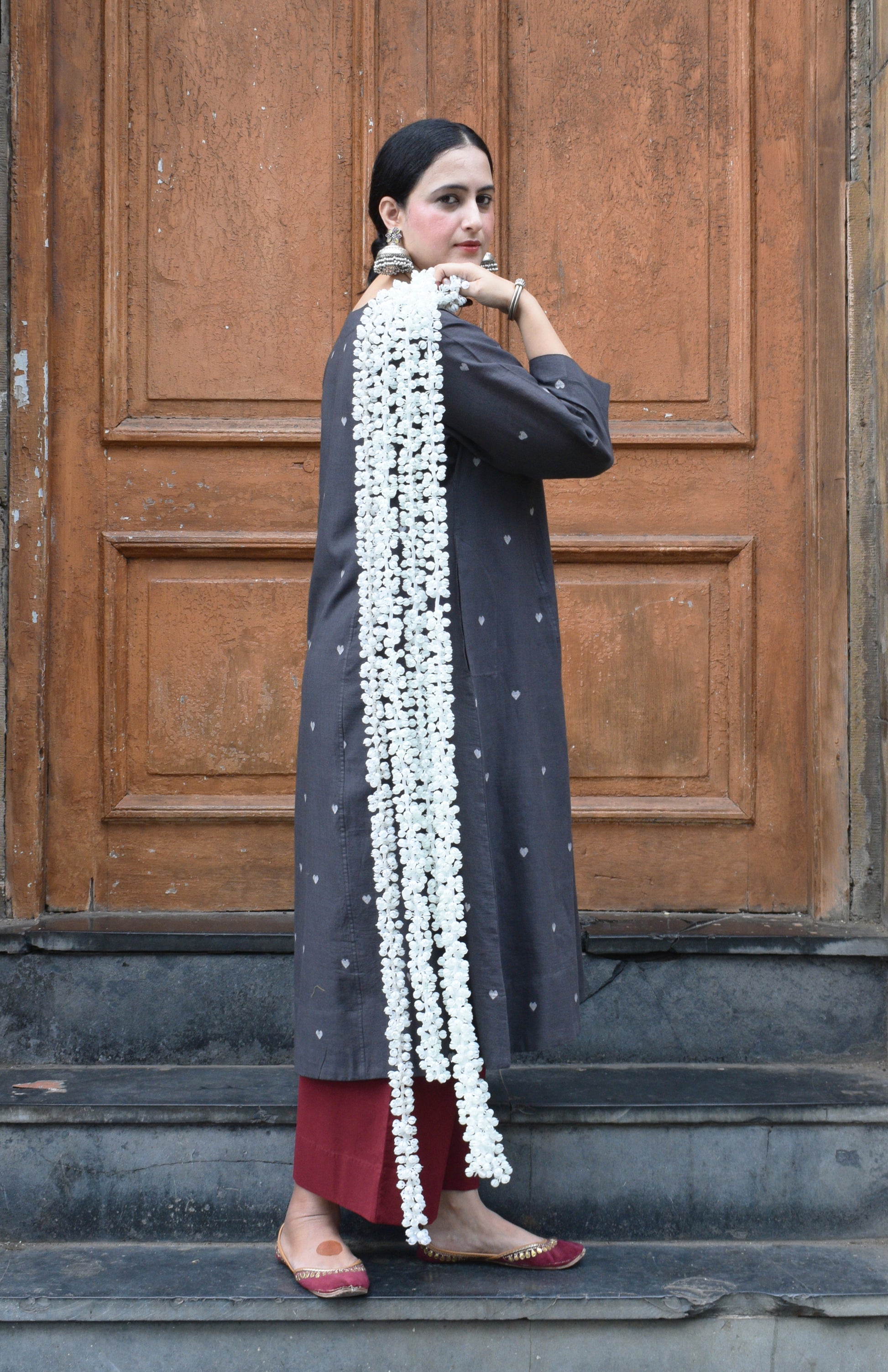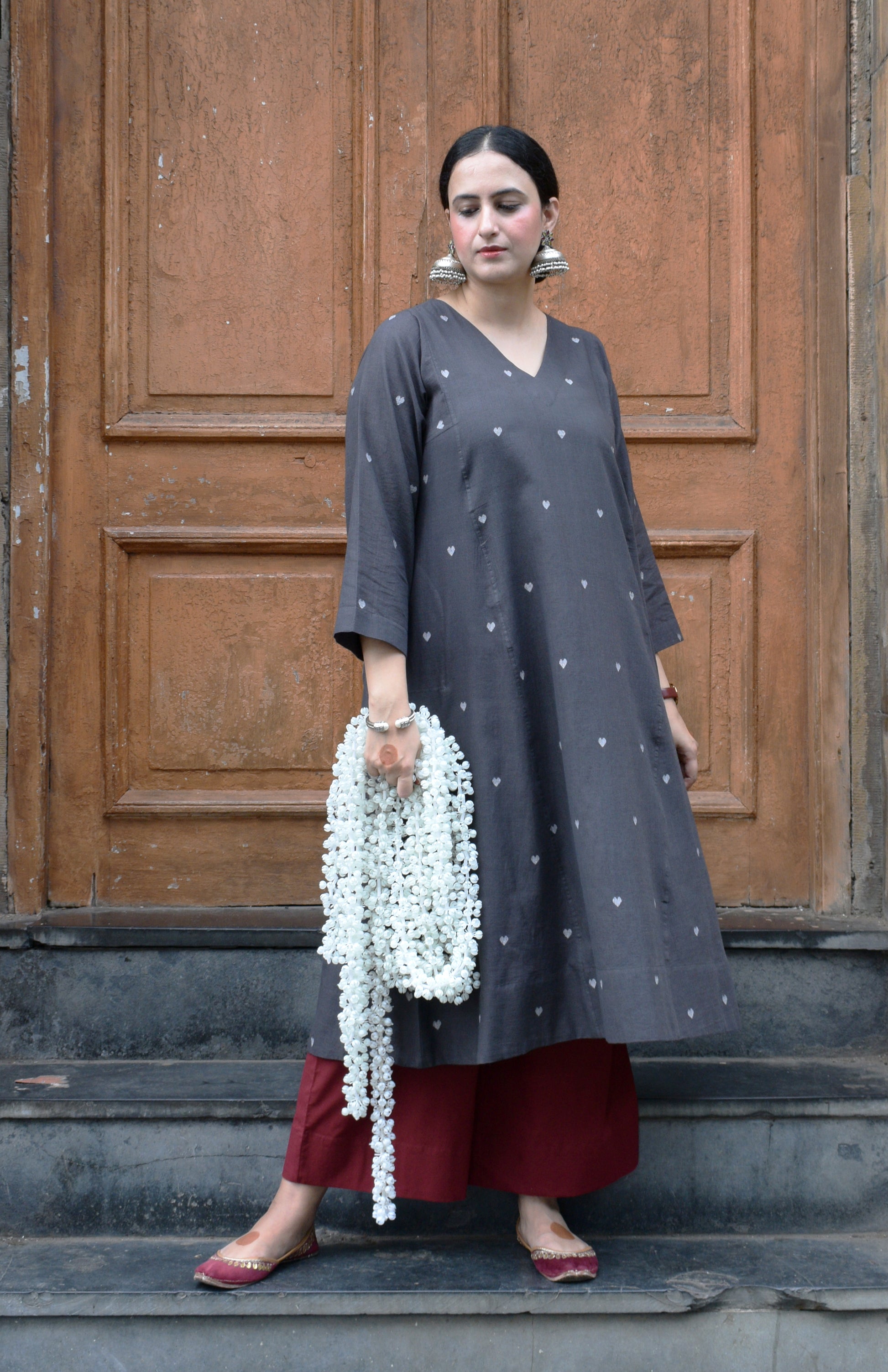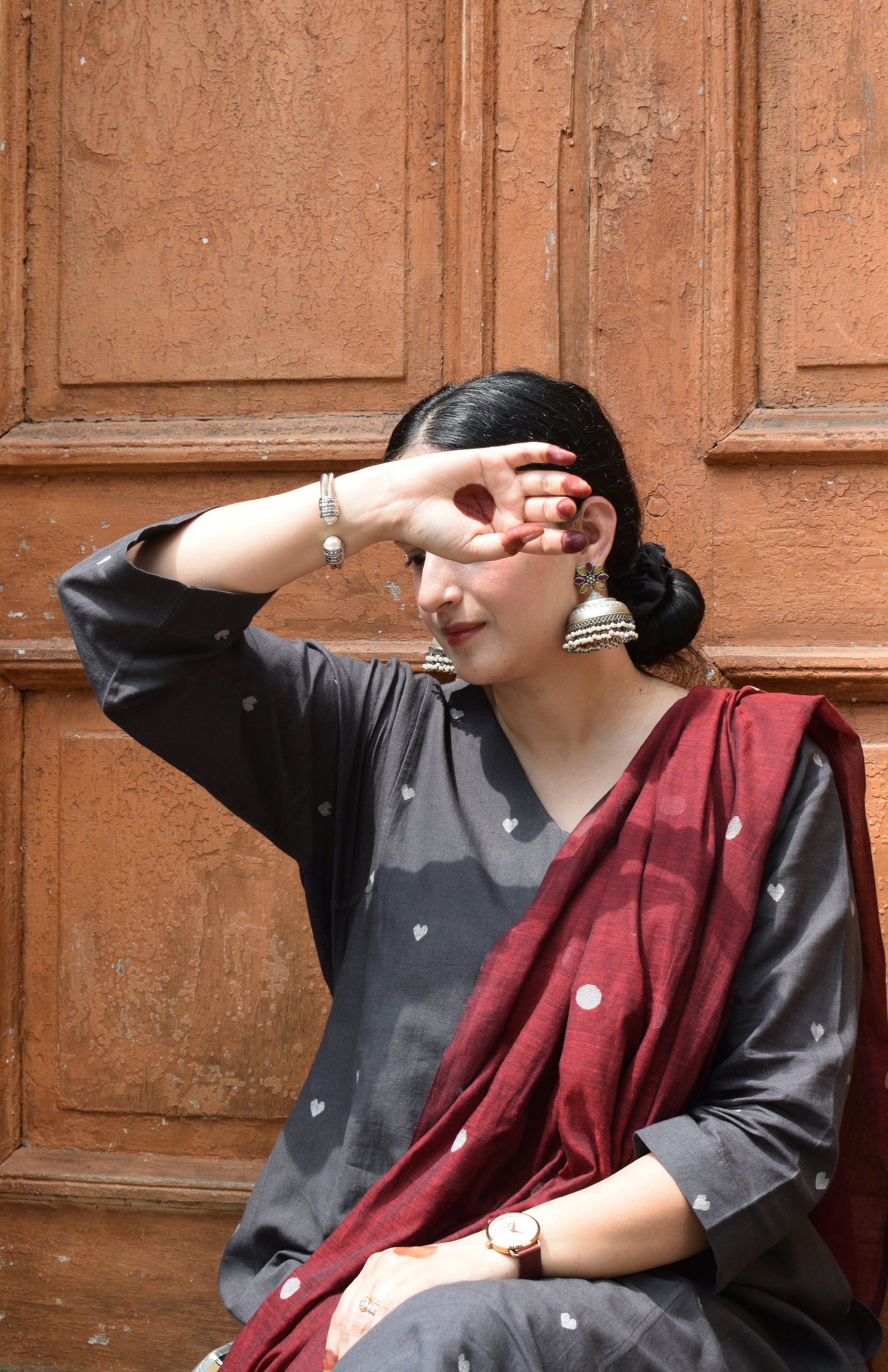 Charcoal Jamdani Phiran with Maroon Pyjama