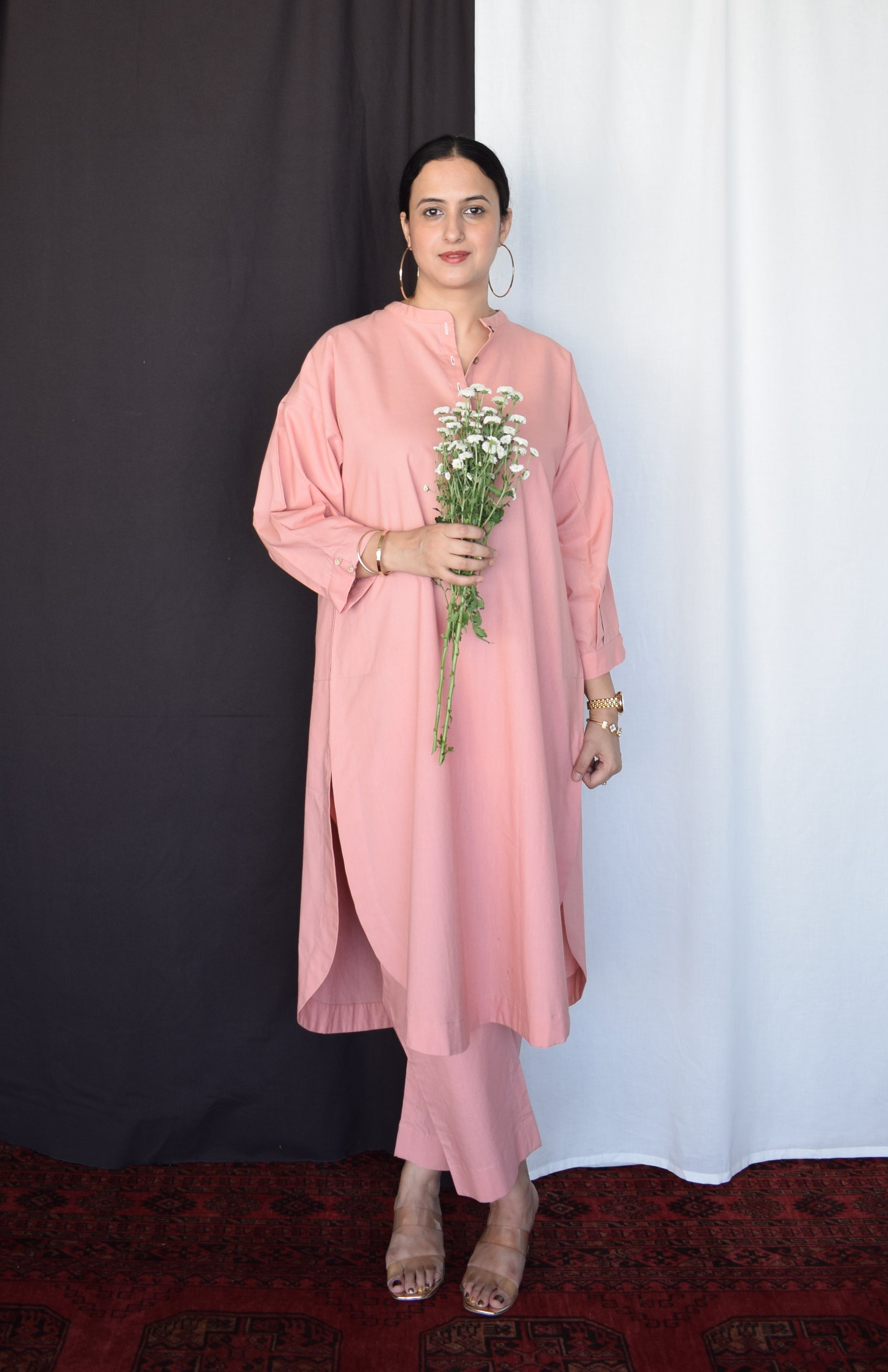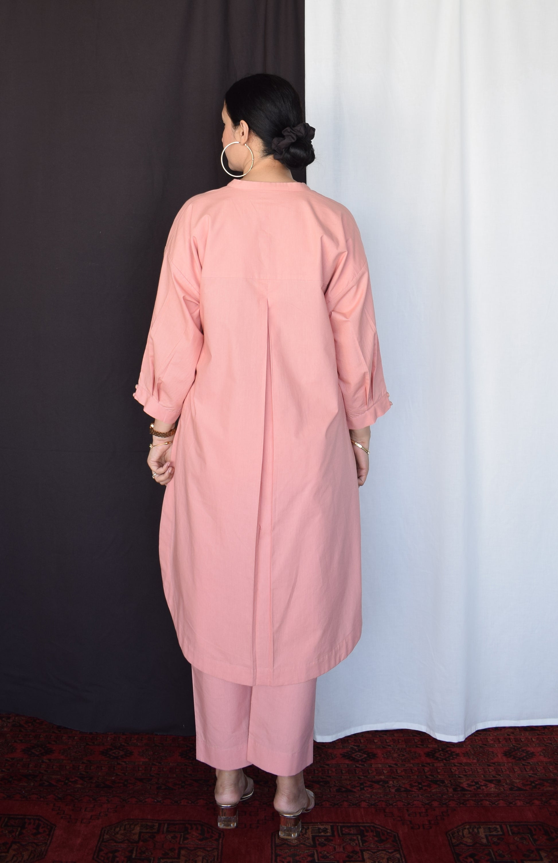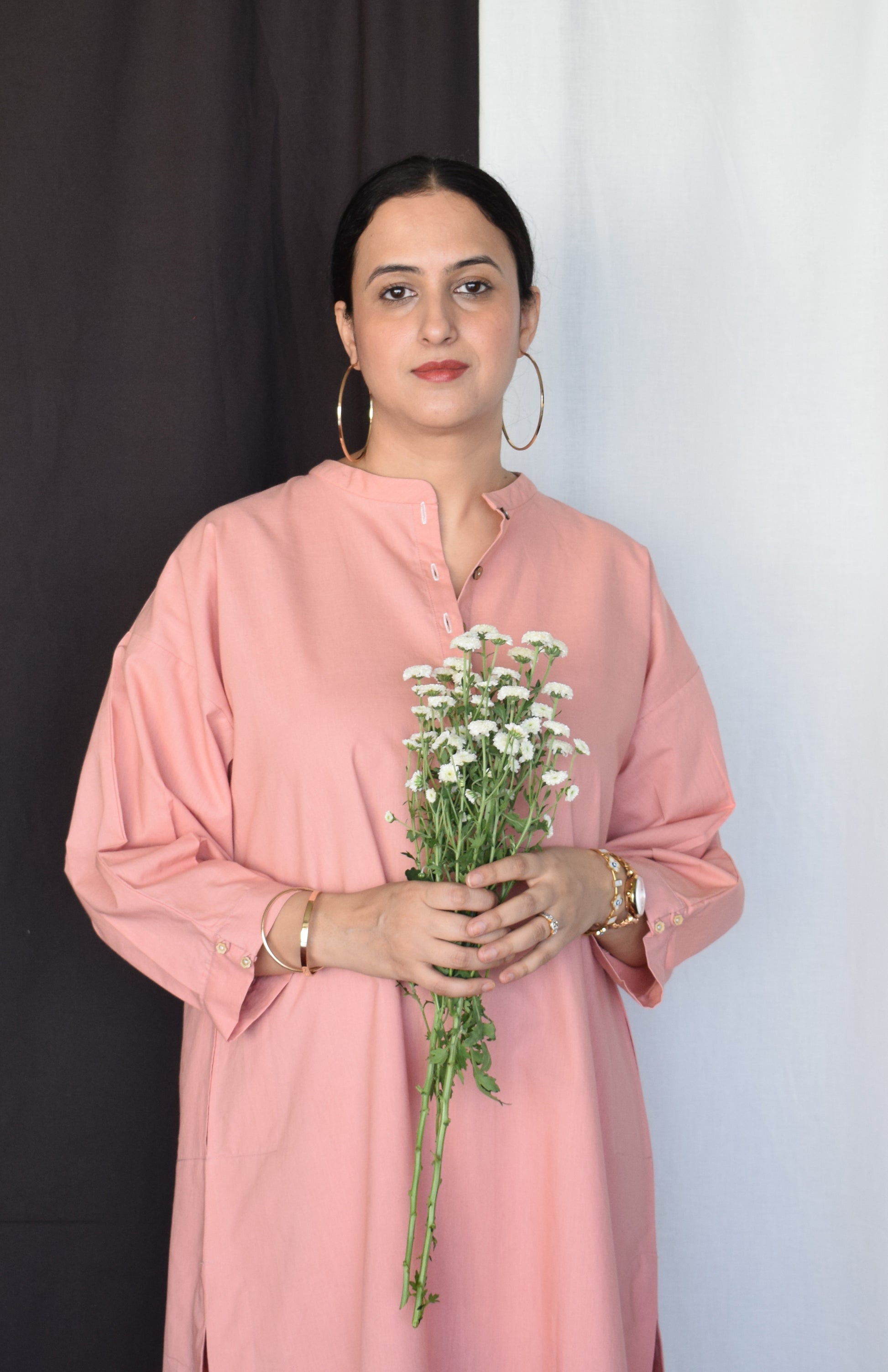 An anti-fit cotton kurta with mandarin collar and front open placket. This kurta has a drop shoulder pattern with loose fitted sleeves. The back features a yoke with box pleat detail.