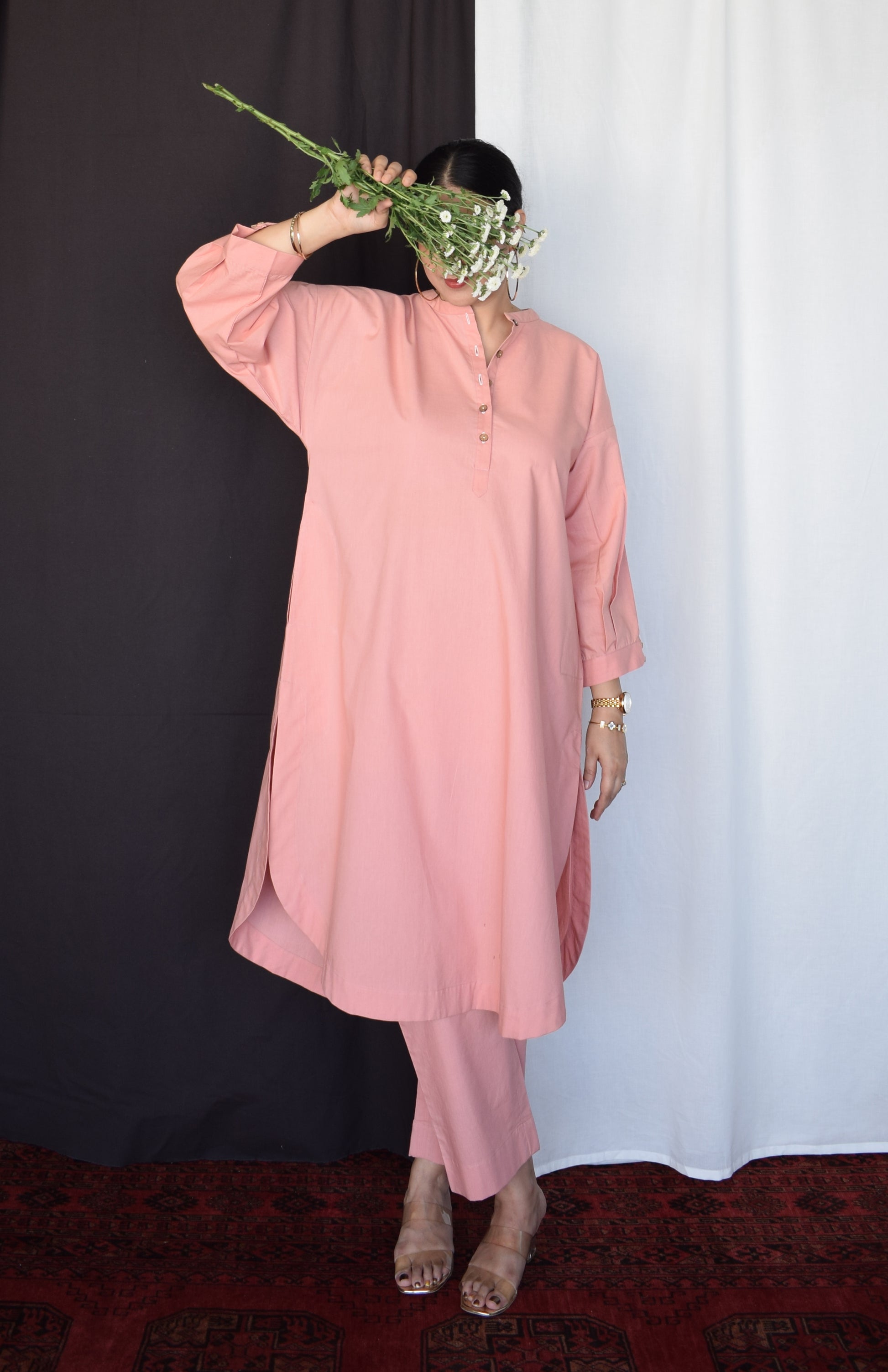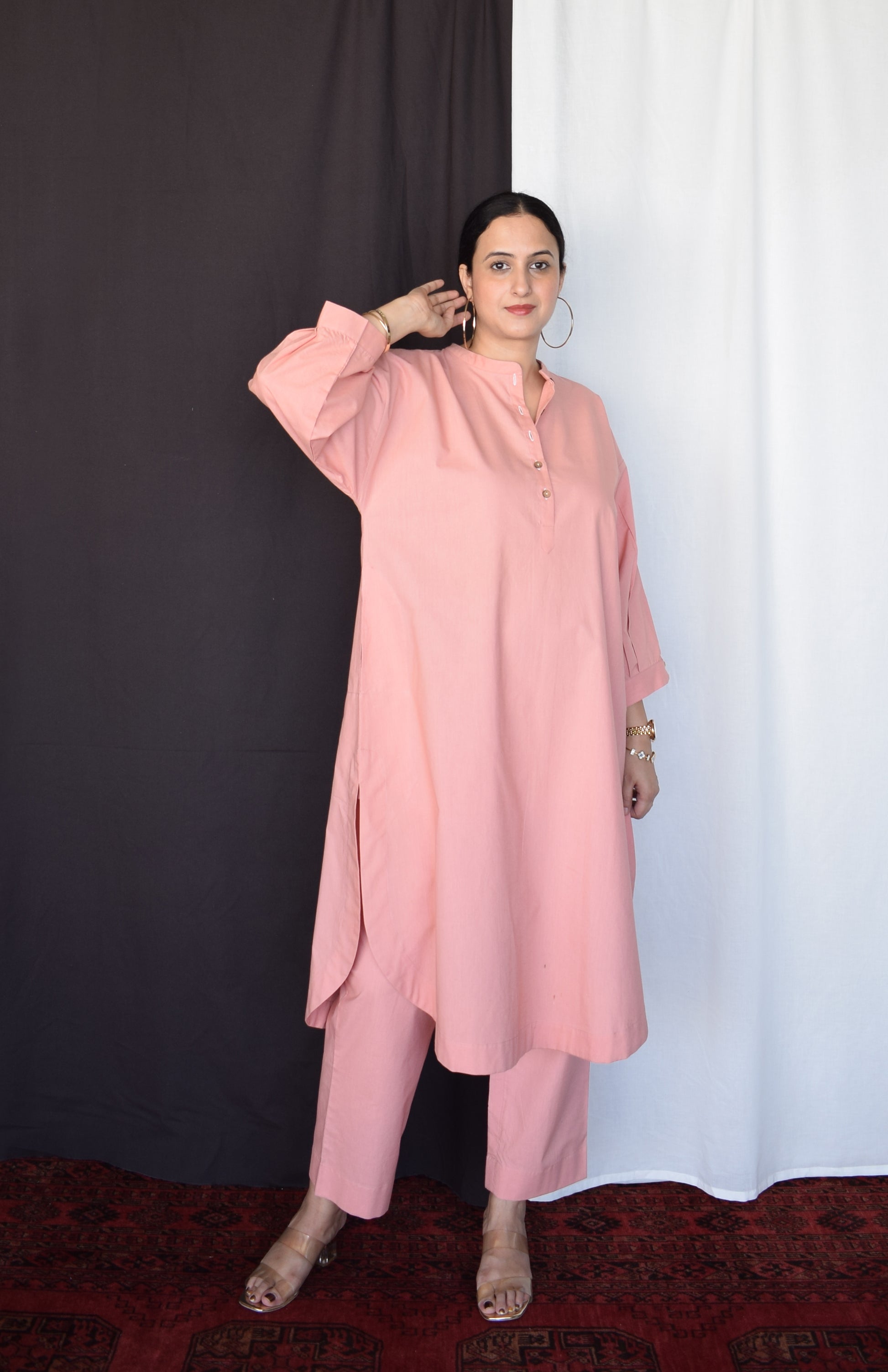 Coral Stripe Bias Paneled kurta in Handwoven cotton
