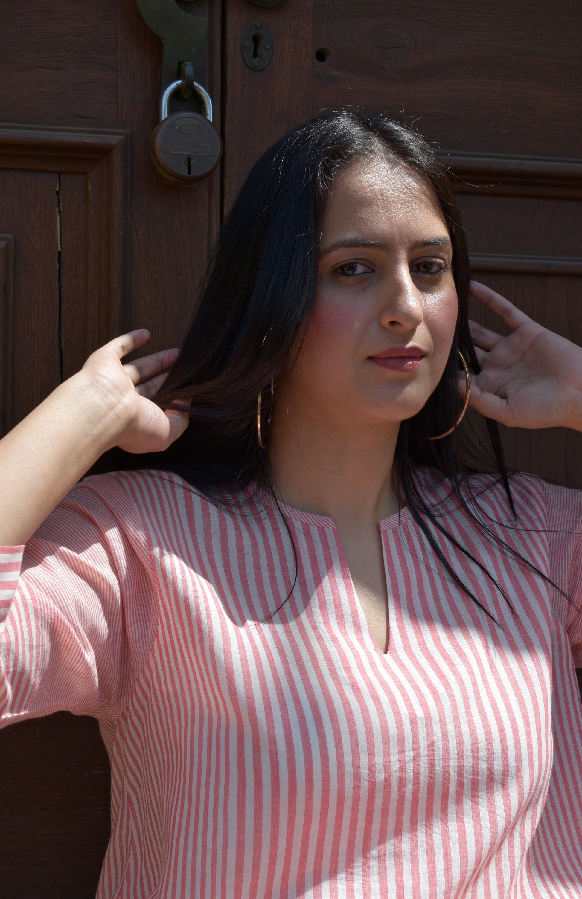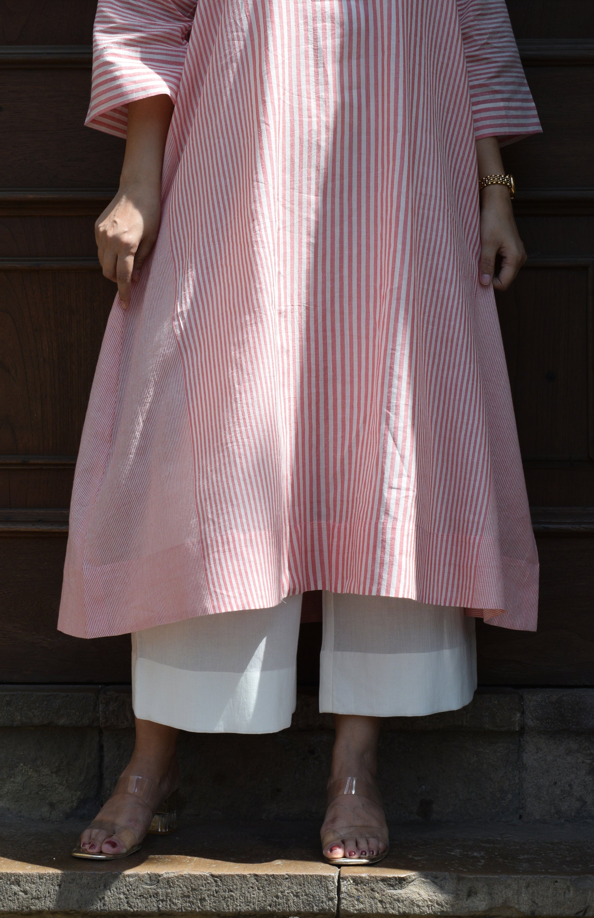 Coral Stripe Bias Paneled kurta in Handwoven cotton