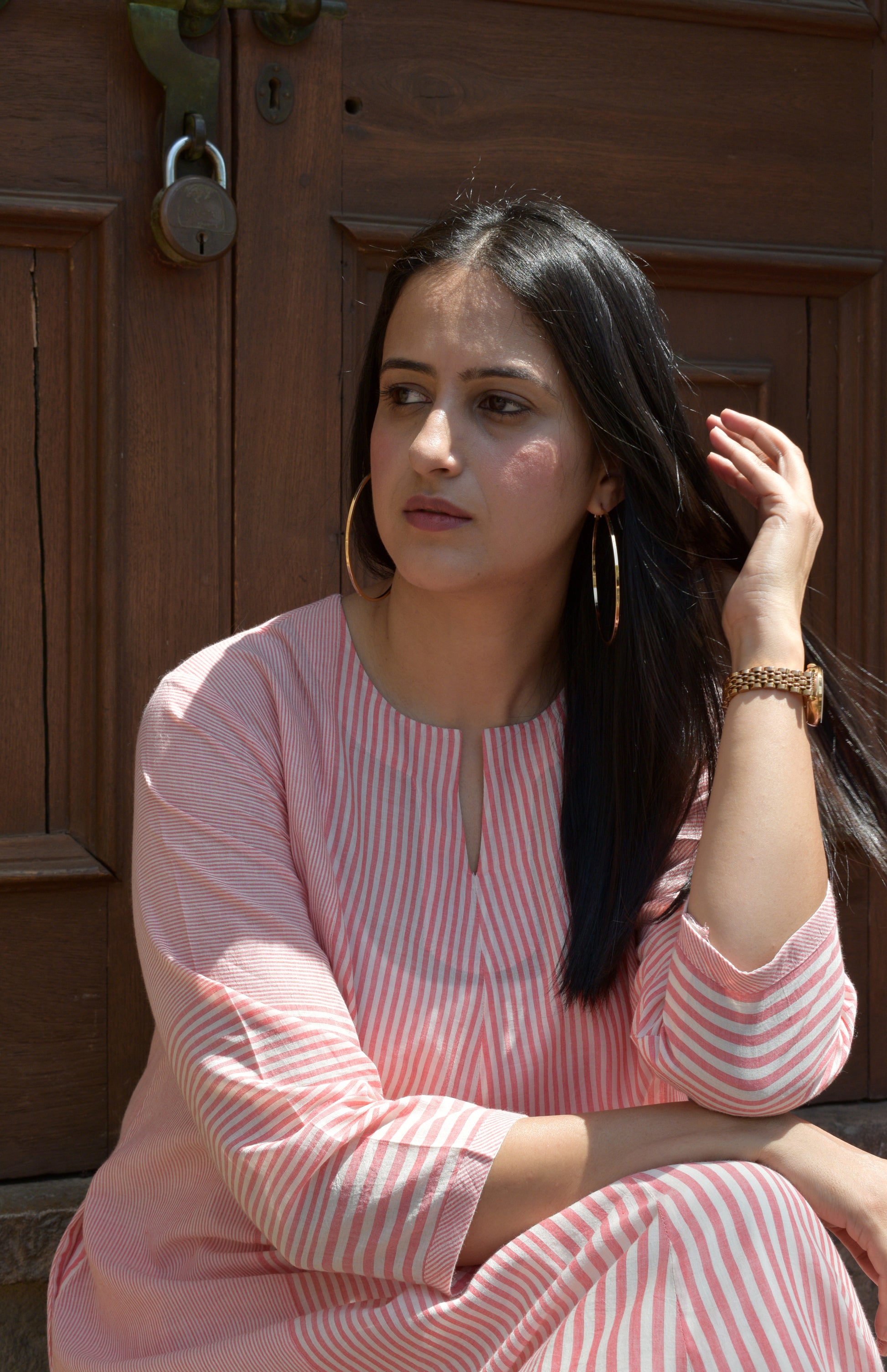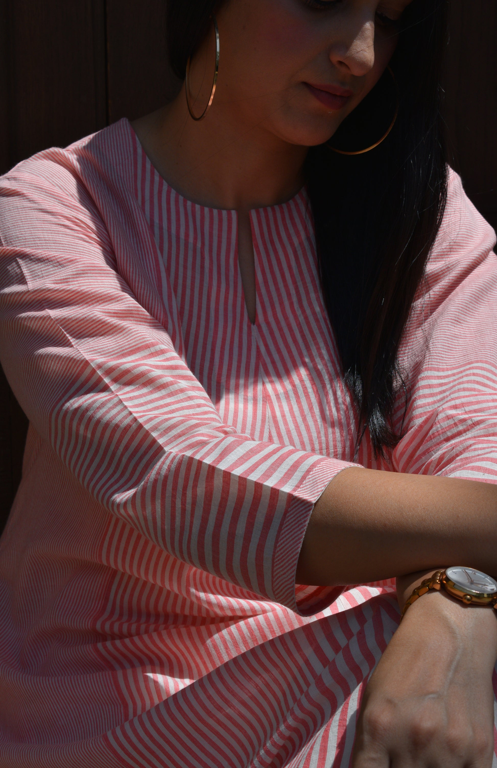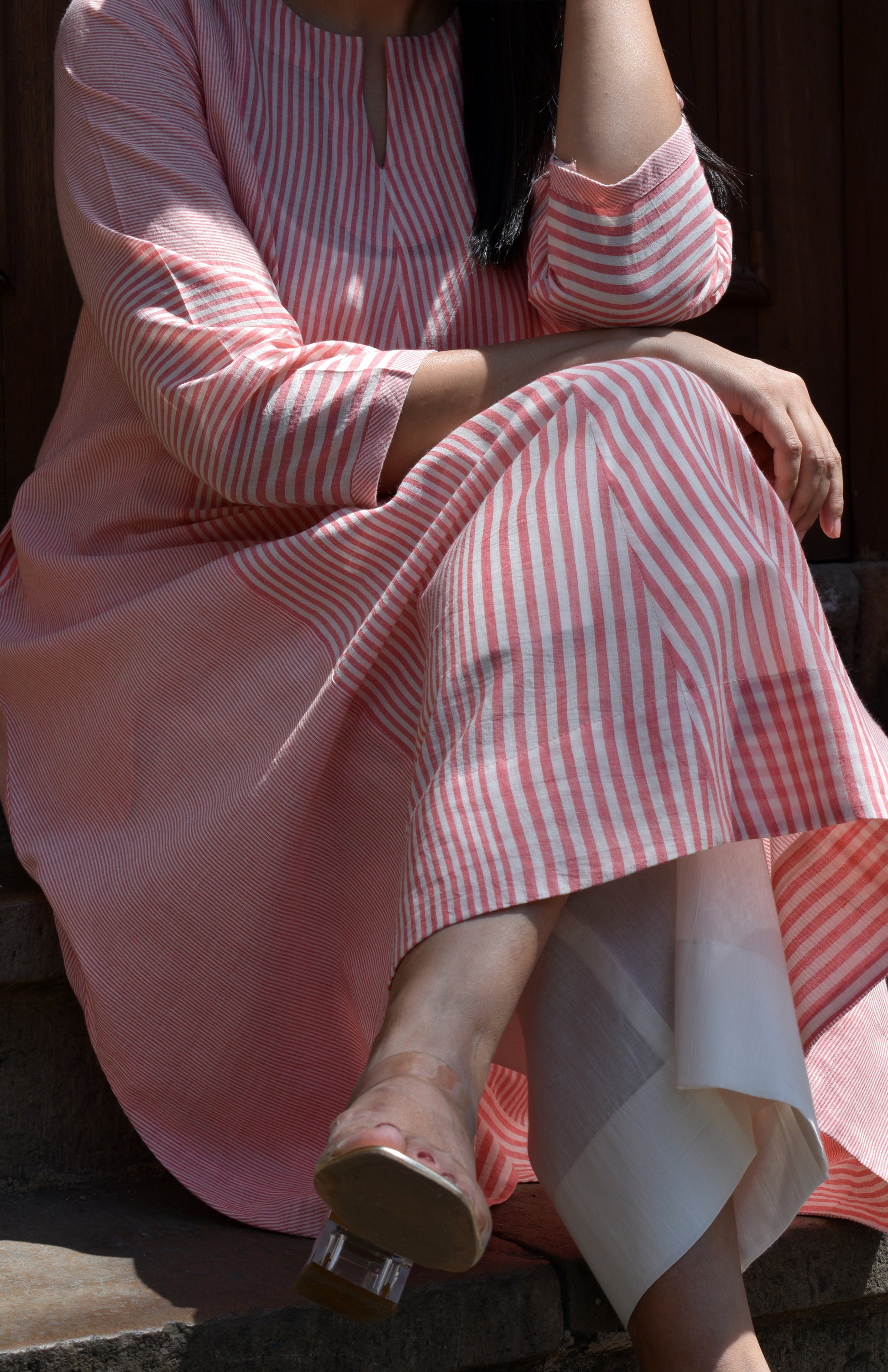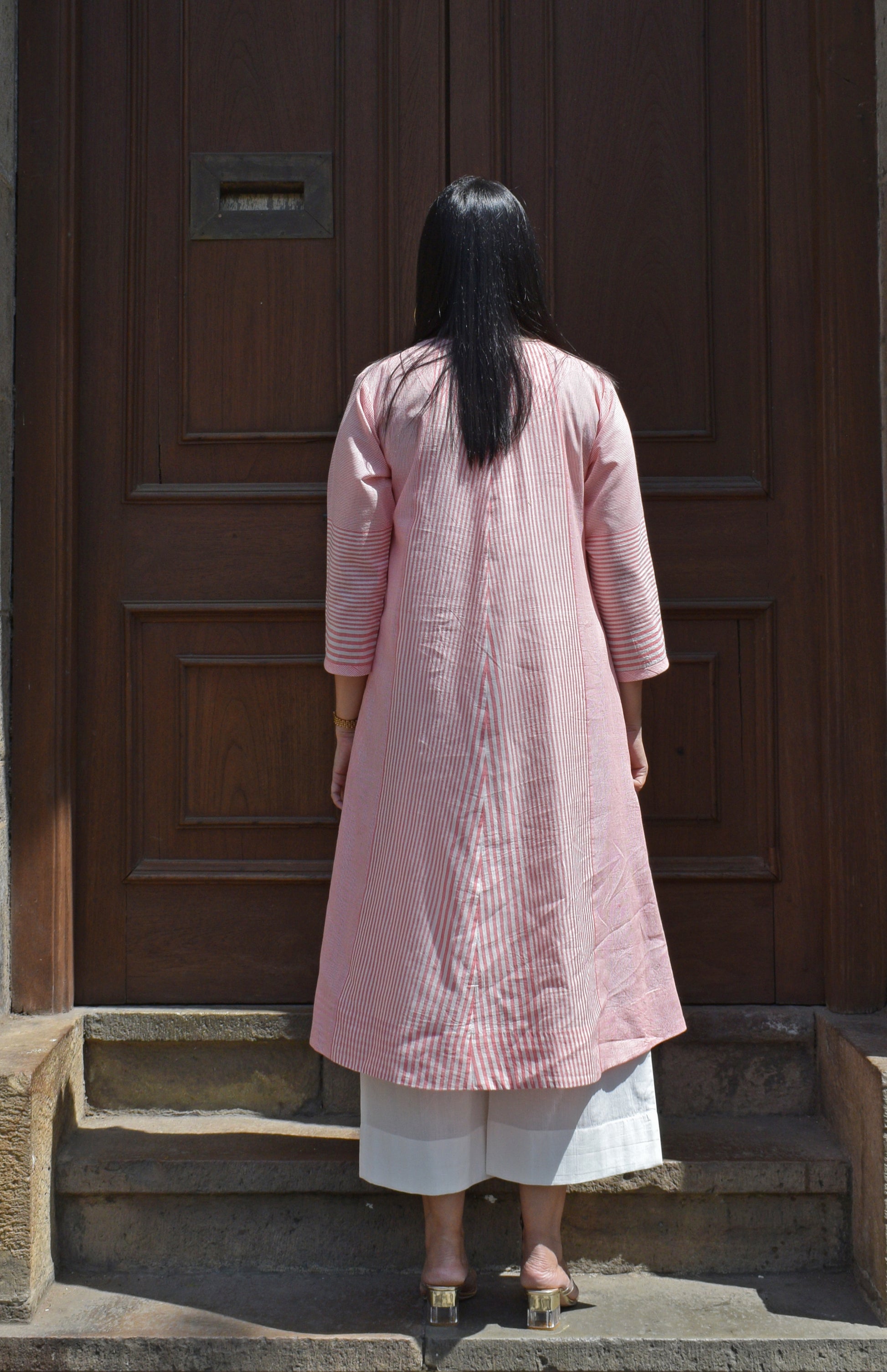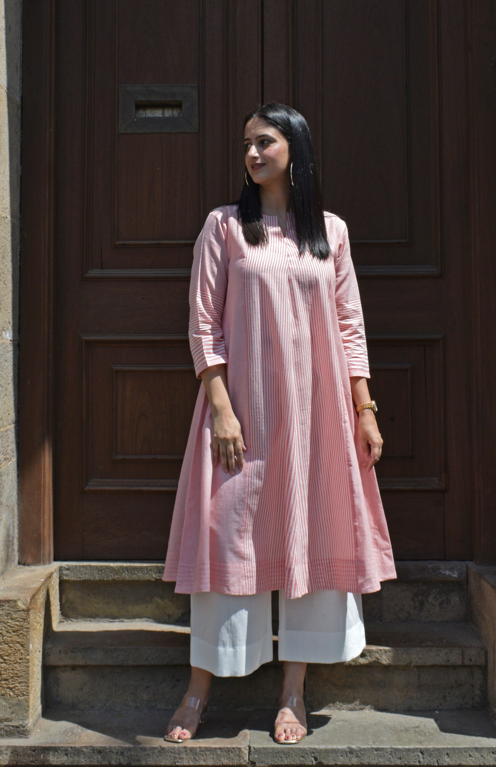Coral Stripe A line kurta in Handwoven cotton