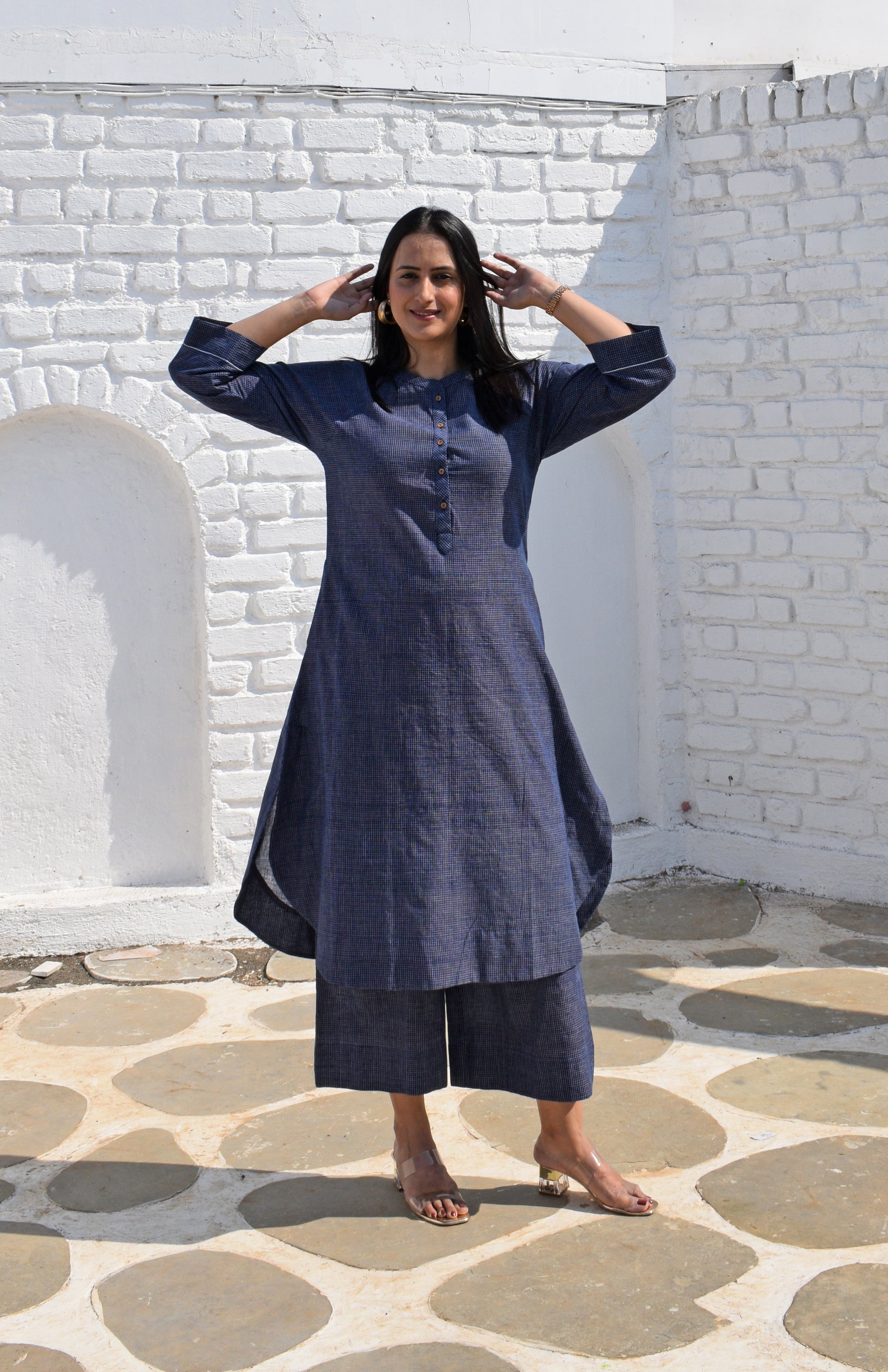 Our dark Blue kurta with raglan sleeve is best paired with our blue pyjama in handwoven checks. It is the perfect ensemble for any season. It can be worn as a set as it is and styled with golden/ brass jewelry with a layered statement necklace. It is easy to maintain and is very soft against the skin, Checks are a classic for every wardrobe