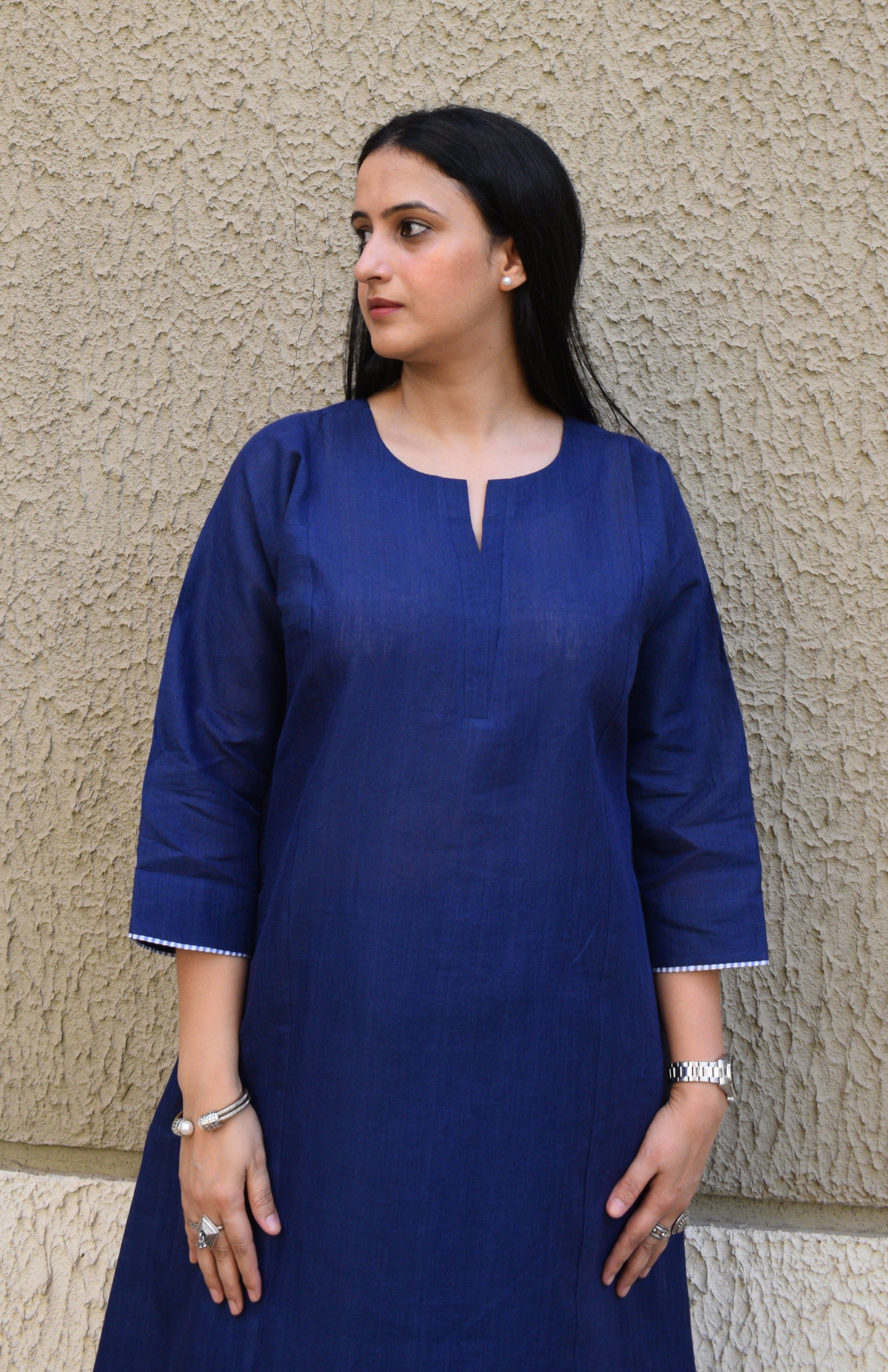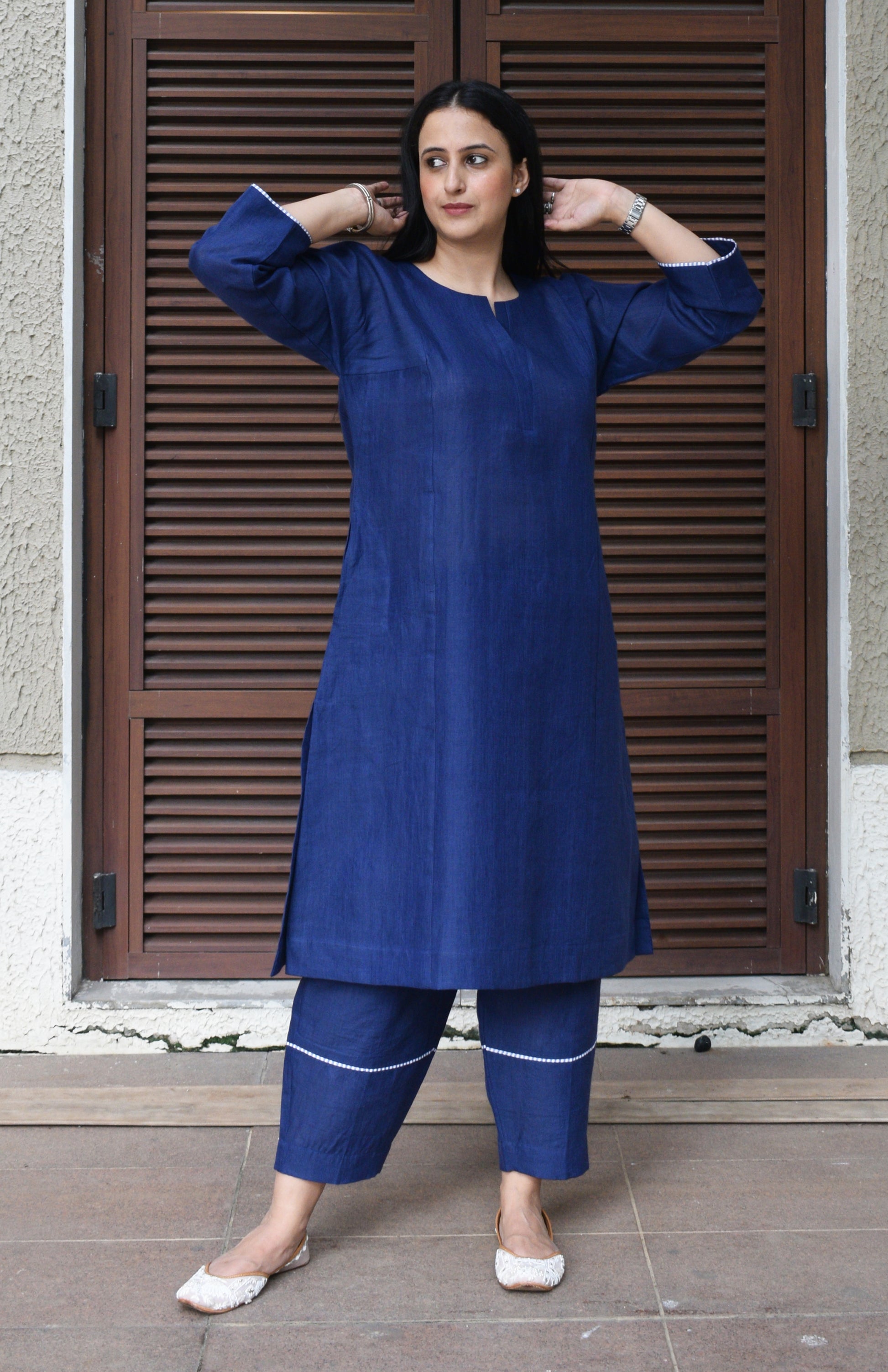 Our dark blue linen straight fit paneled kurta can easily be styled with our dark blue linen balloon fit trousers for a monochromatic look. You can keep the look minimalistic with a sleek watch and simple earrings.