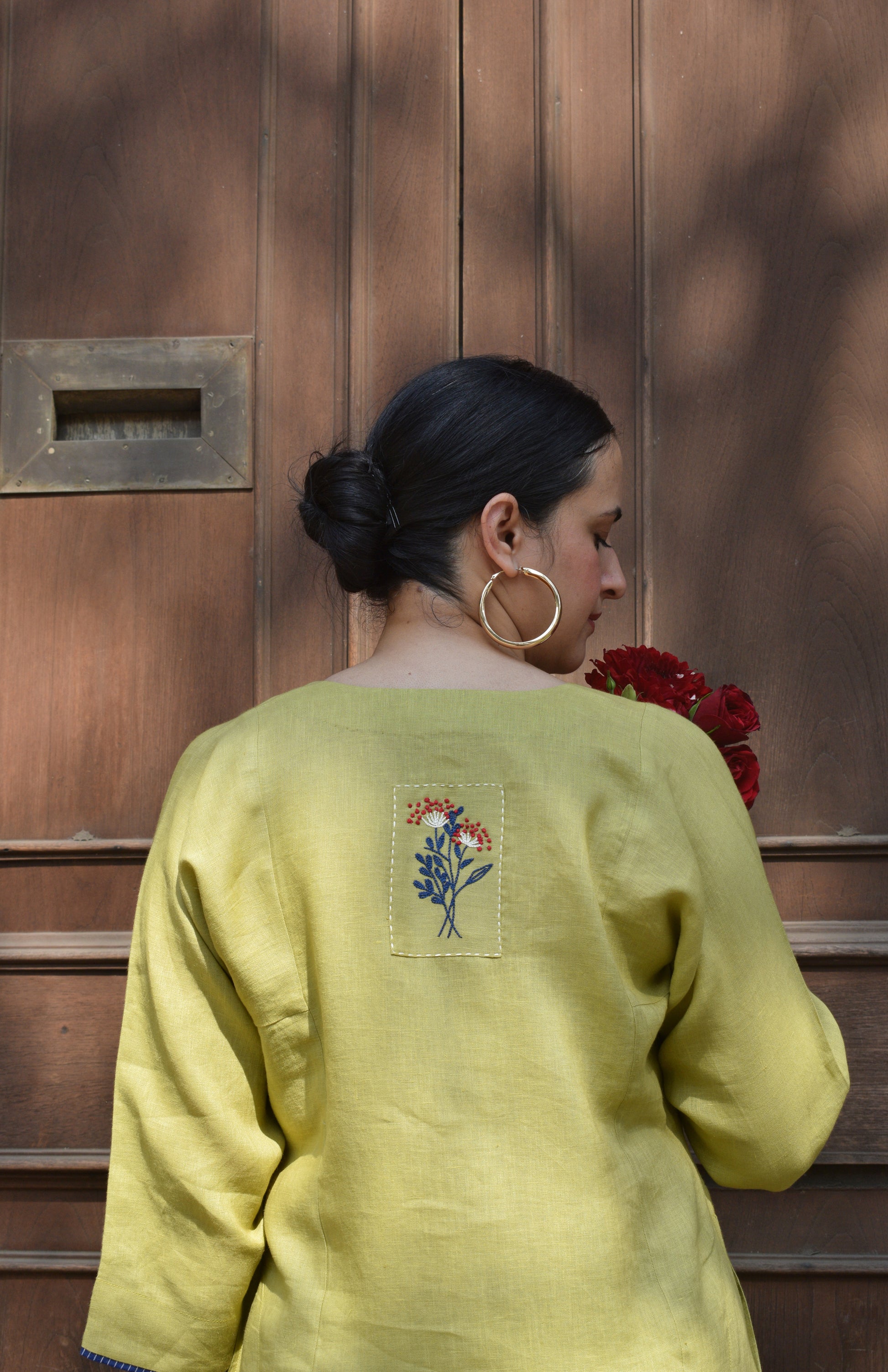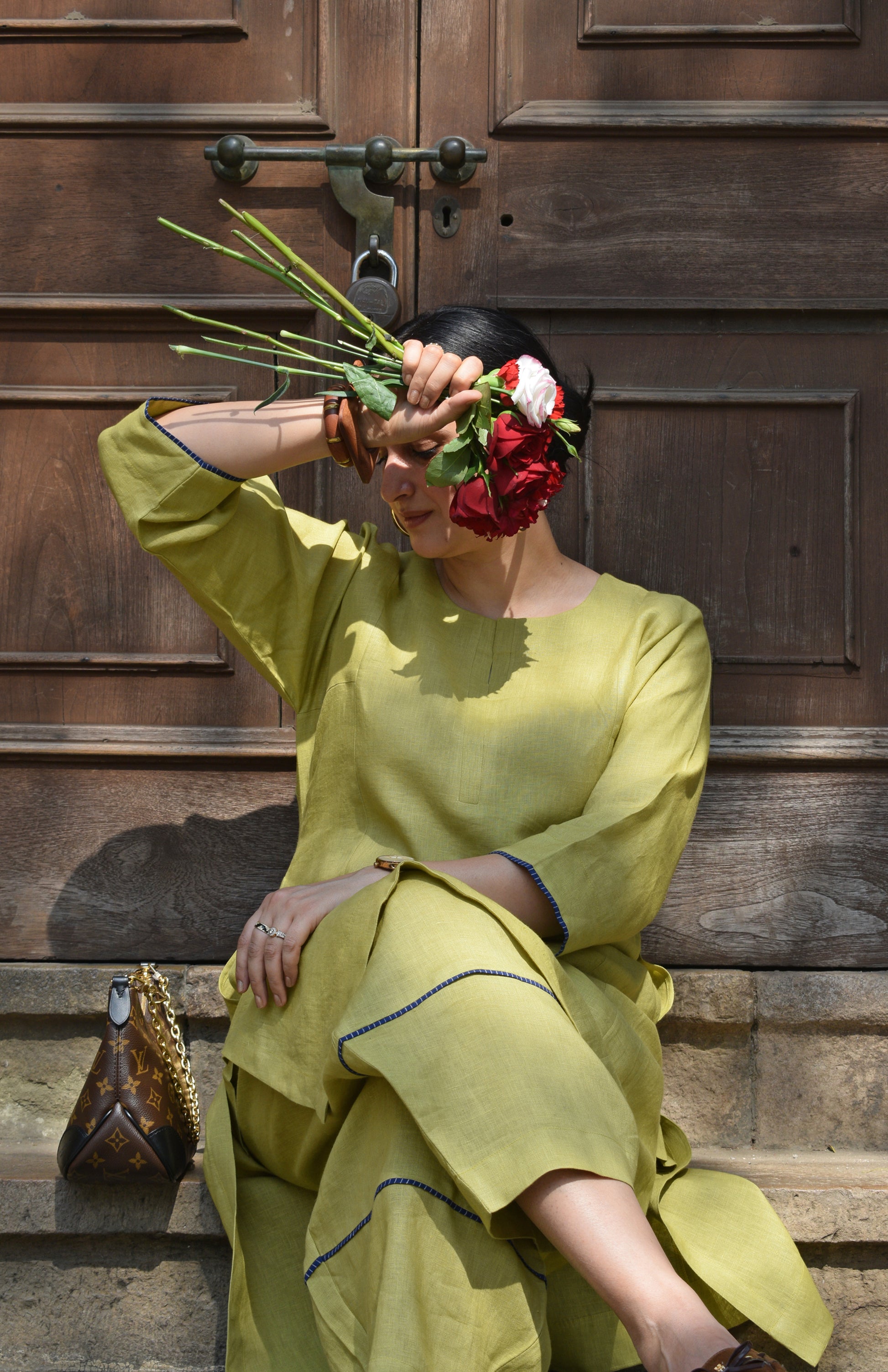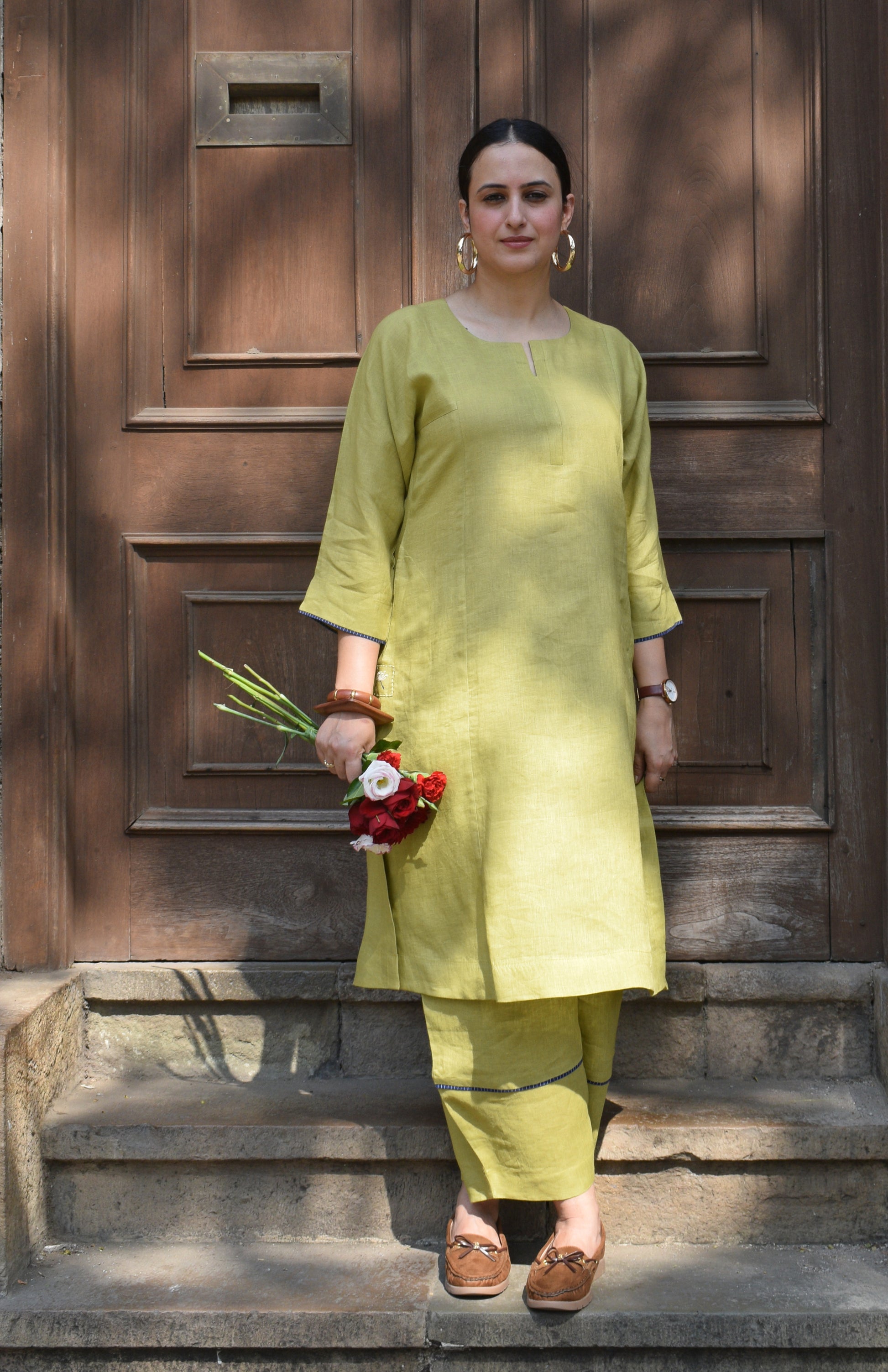 Our fresh lime linen straight fit paneled kurta can easily be styled with our purple linen balloon fit trousers for a monochromatic look. You can keep the look minimalistic with a sleek watch and simple earrings.