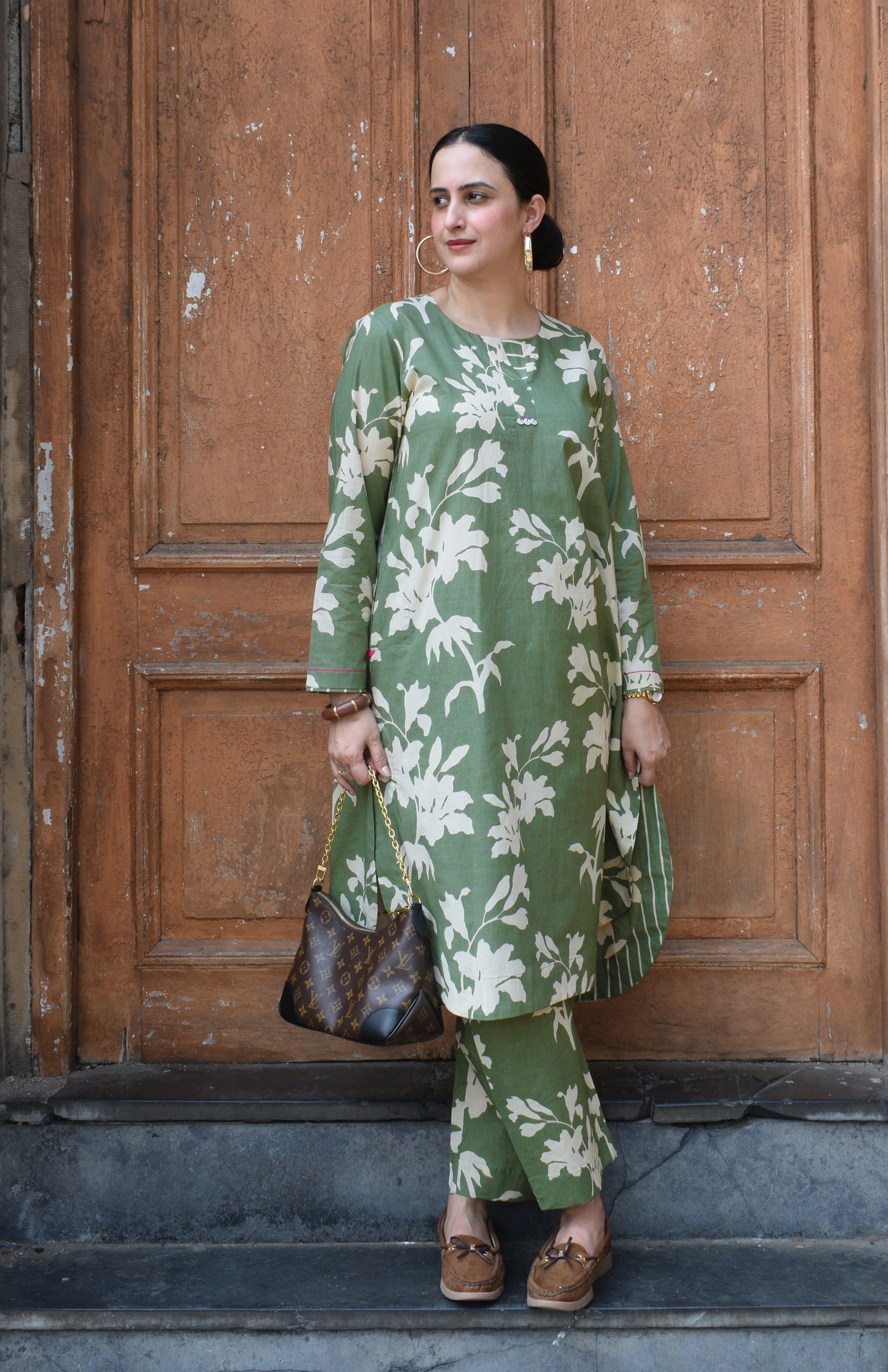 A printed Co-ord set with overlap neckline detail, side slits and embroidered side pockets. The kurta features full length sleeves and a rounded hemline for a chic look. The back yoke with gathers ensures that the fit is comfortable to wear. This set comes with a pair of straight fit pajamas in the same fabric with full elastic waistband.
