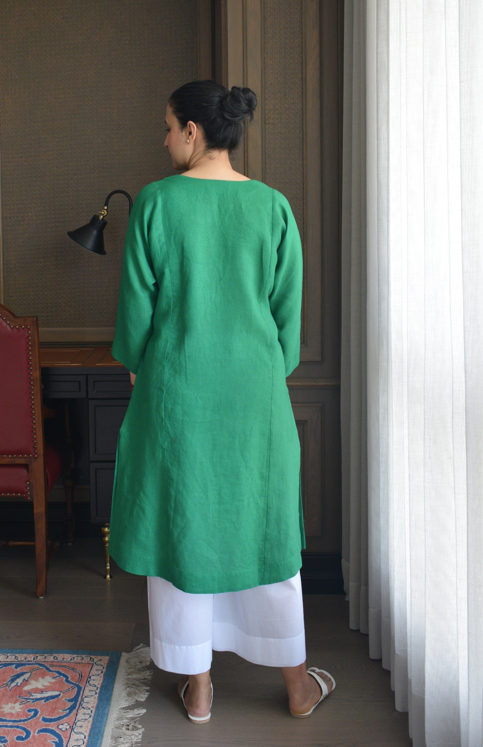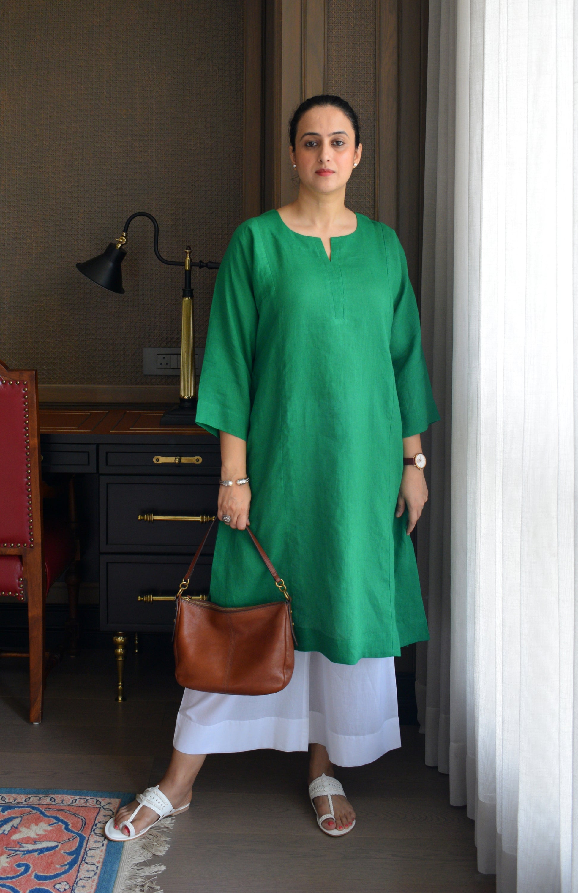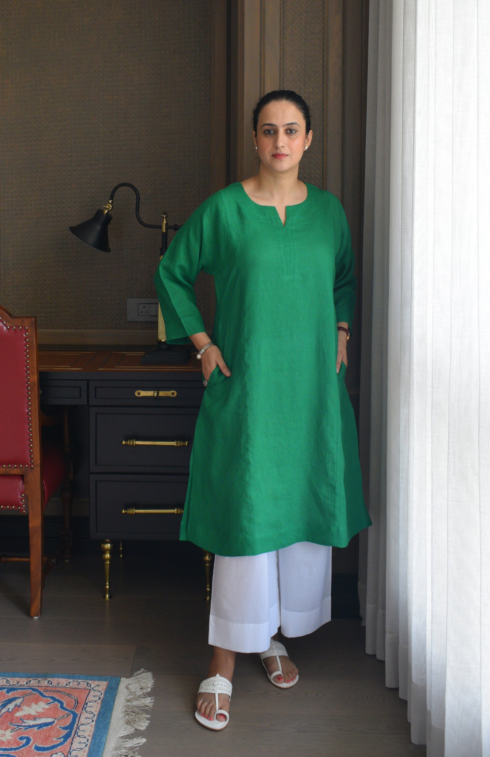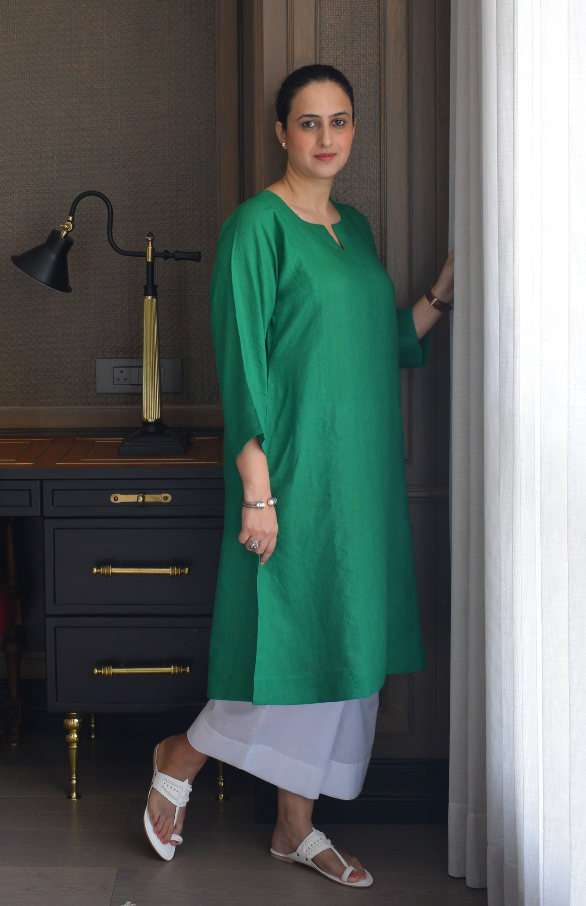 Our Green linen straight fit paneled kurta can easily be styled with our sunkissed white basic pyjama for a semi formal look. You can keep the look minimalistic with a sleek watch and simple earrings.
