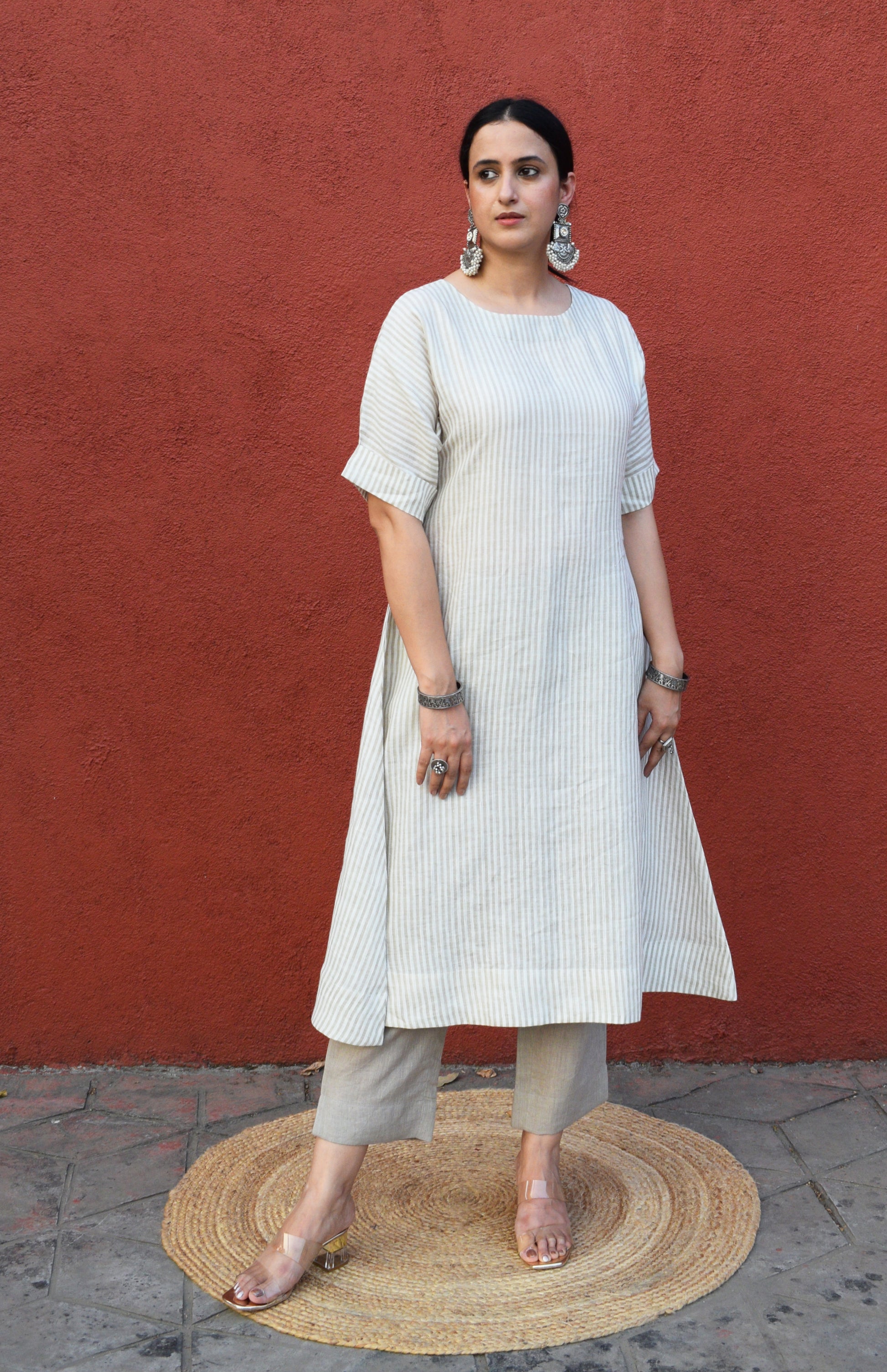 Coral Stripe A line kurta in Handwoven cotton