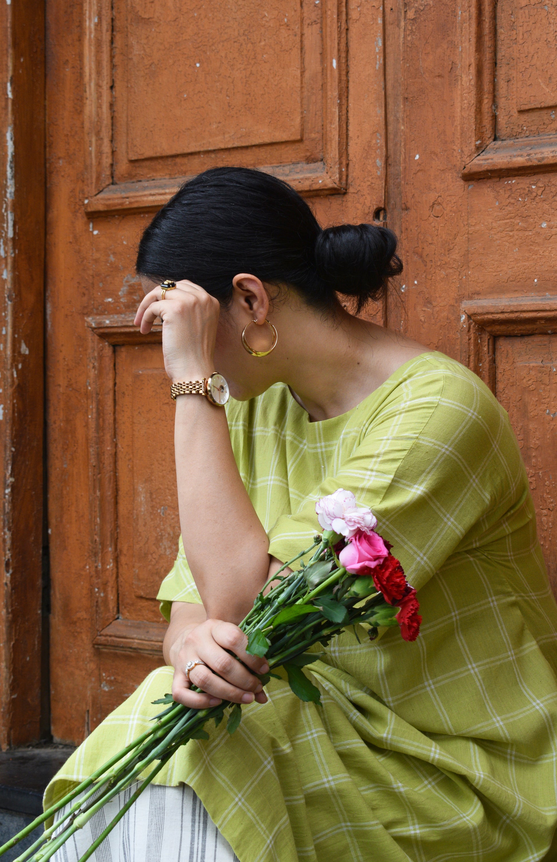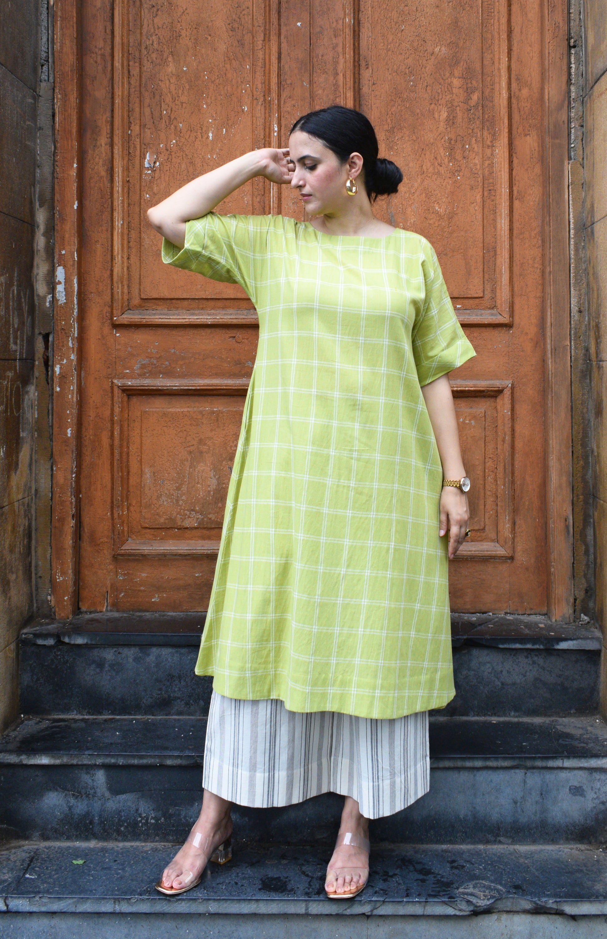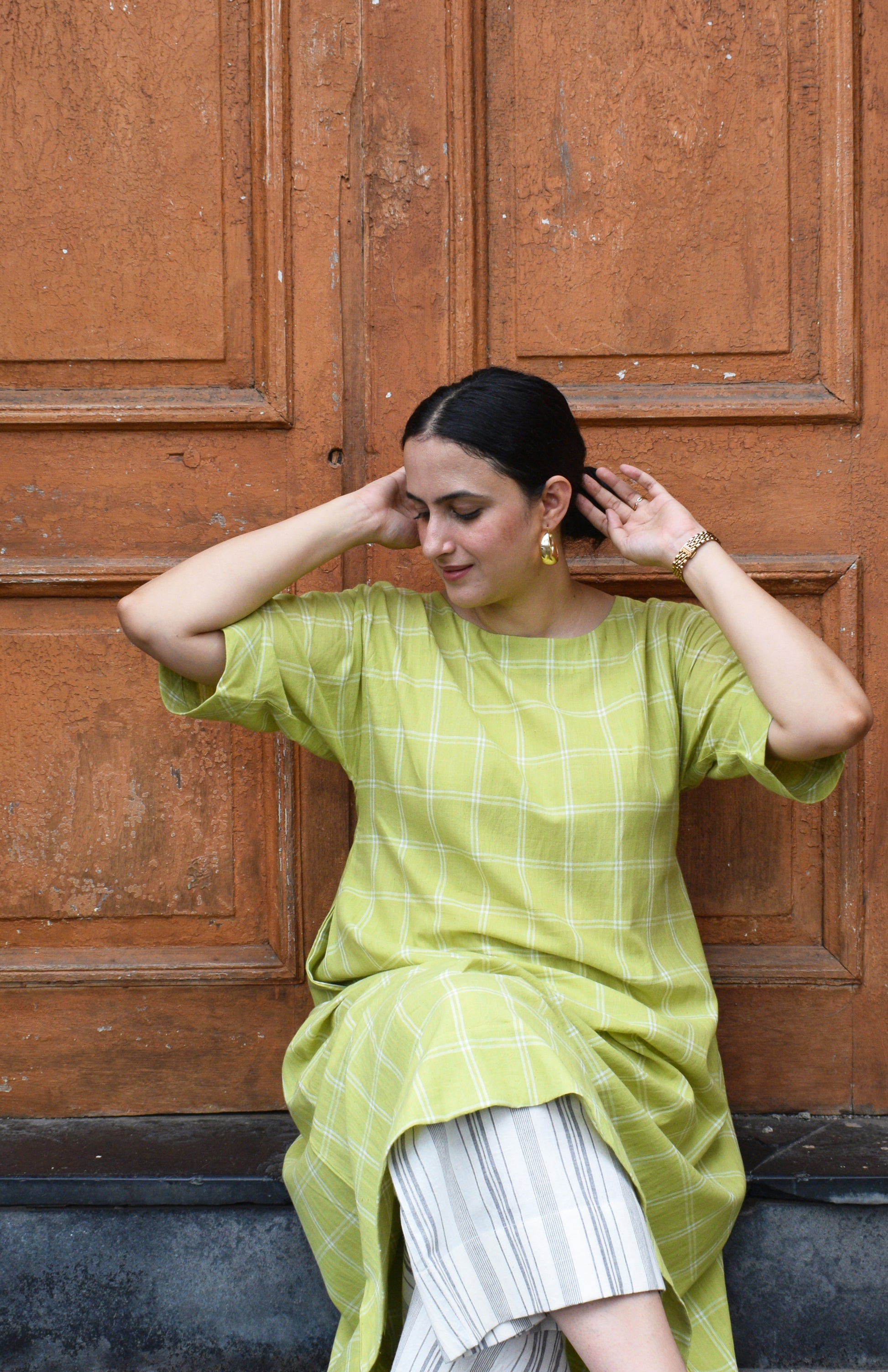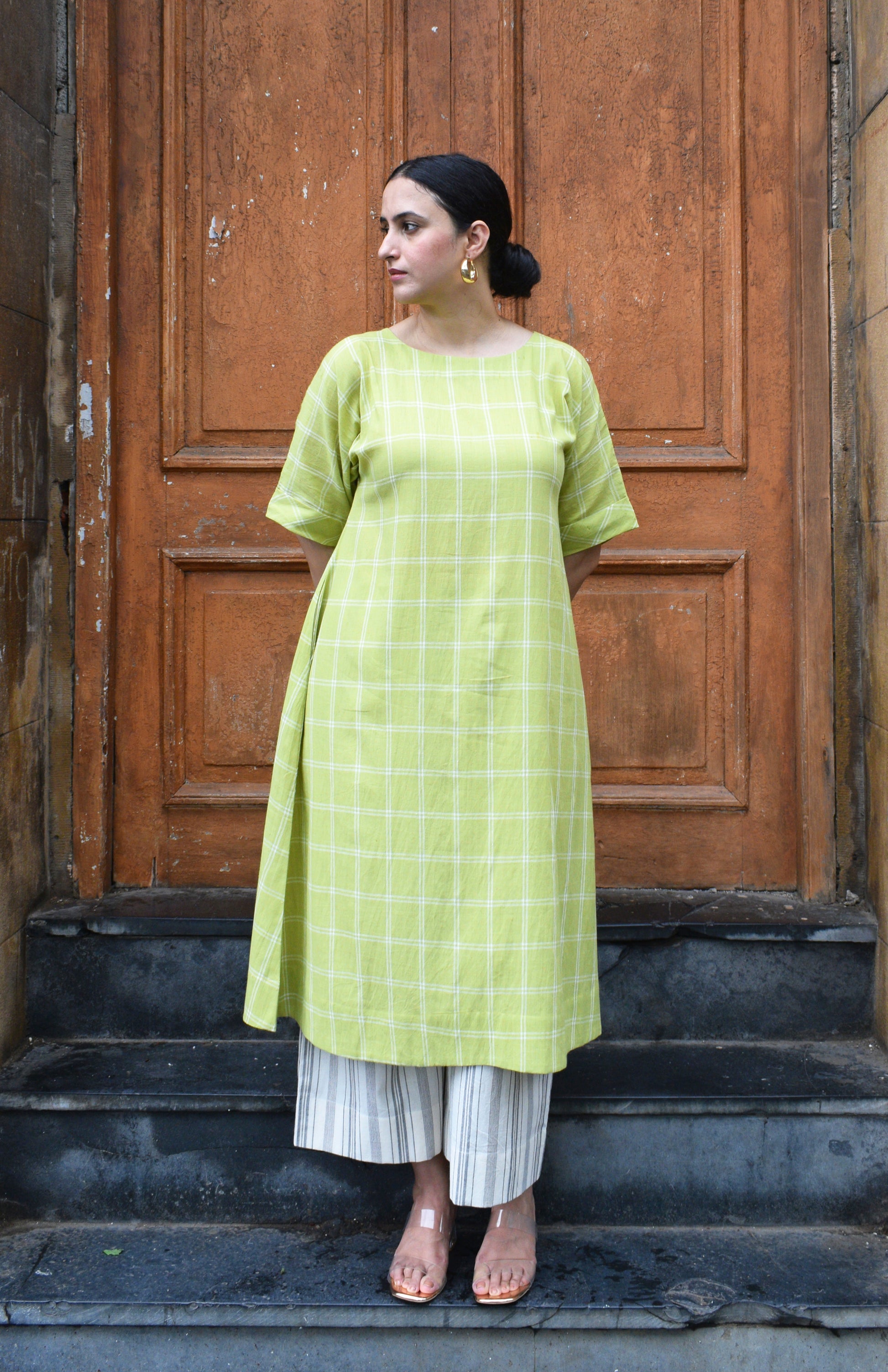 Lime Green A line Kurta in Handwoven Checks with Handwoven Striped pyjama