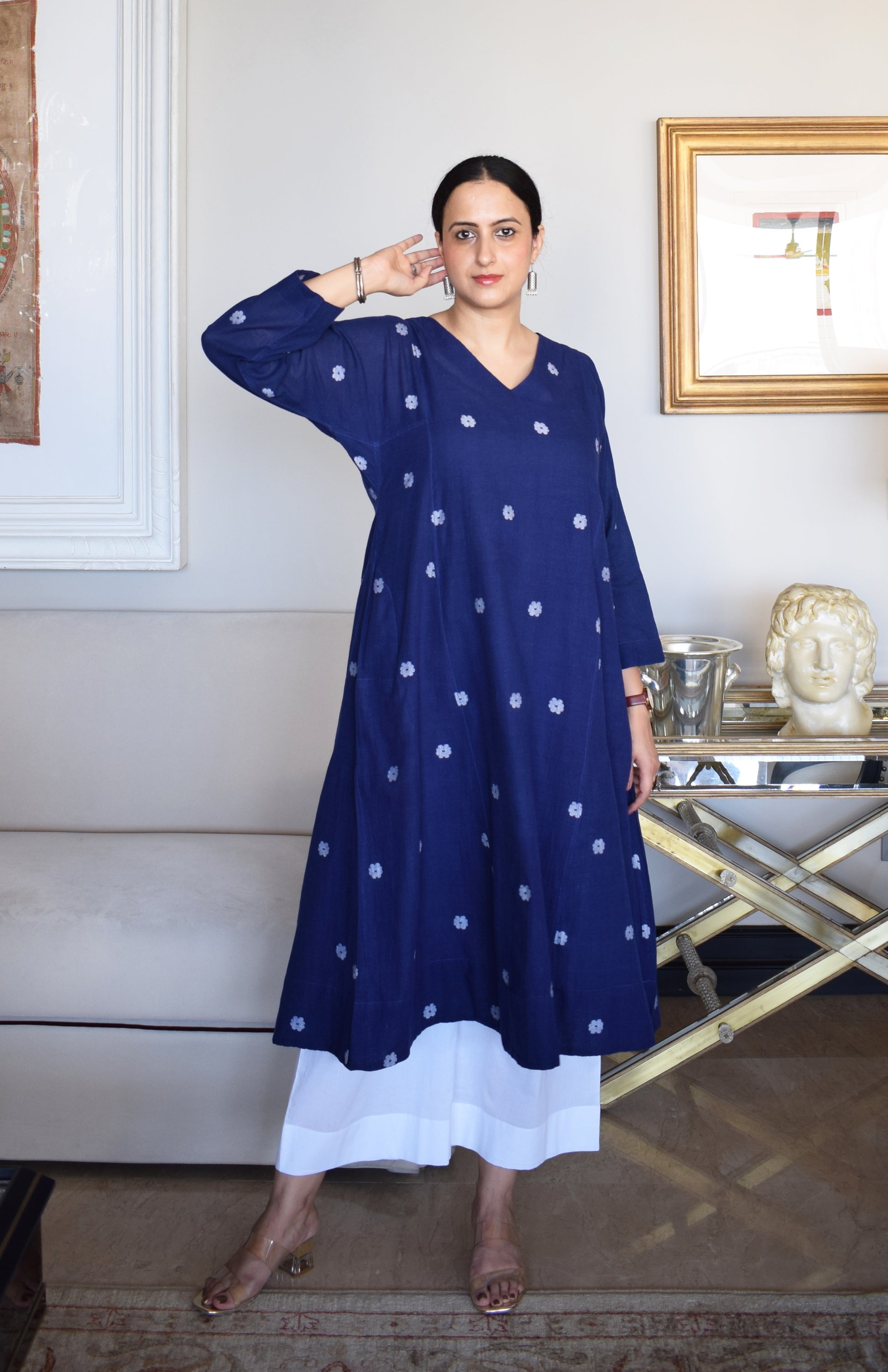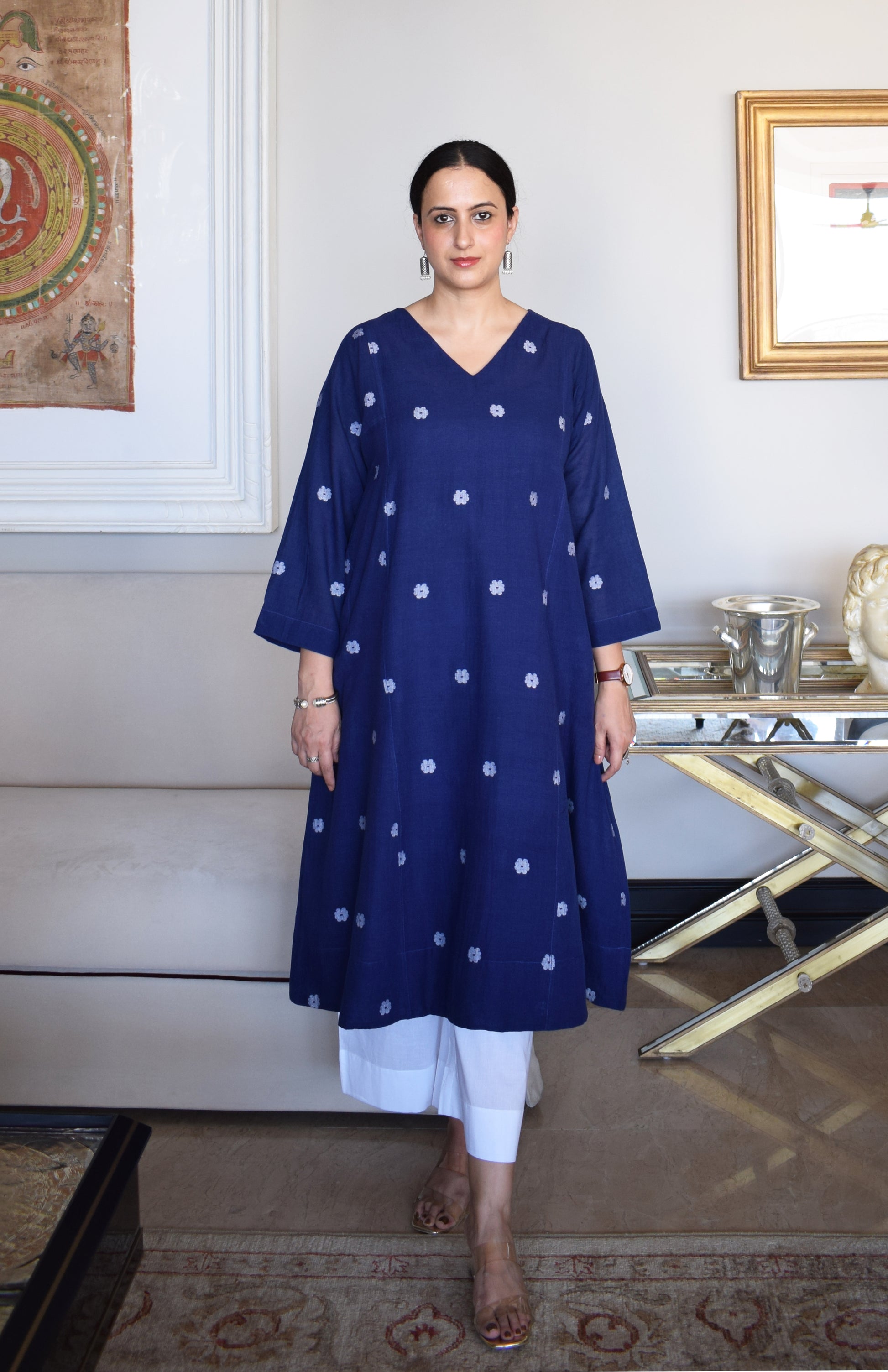 Loose-fitted Jamdani kurta stitched in phiran style with side panels and gusset. This kurta has no armhole. It is an A-line fit with pockets on both sides of the kurta. This kurta comes with a mul cotton slip and White pyjama