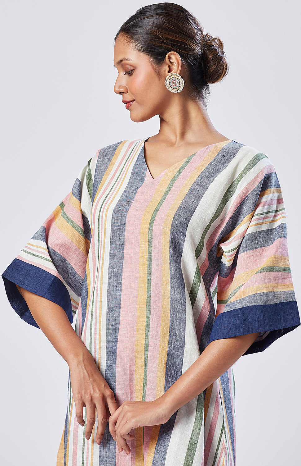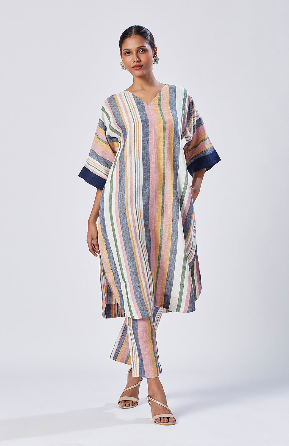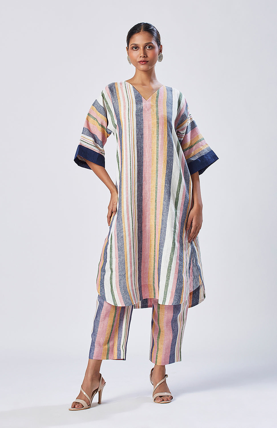 Loose-fitted pure linen kurta with kimono sleeves and side pockets. This kurta features a V shaped neckline and a round hem with thick facing. This kurta comes with matching wide leg pajamas in the same fabric with full elastic waistband.