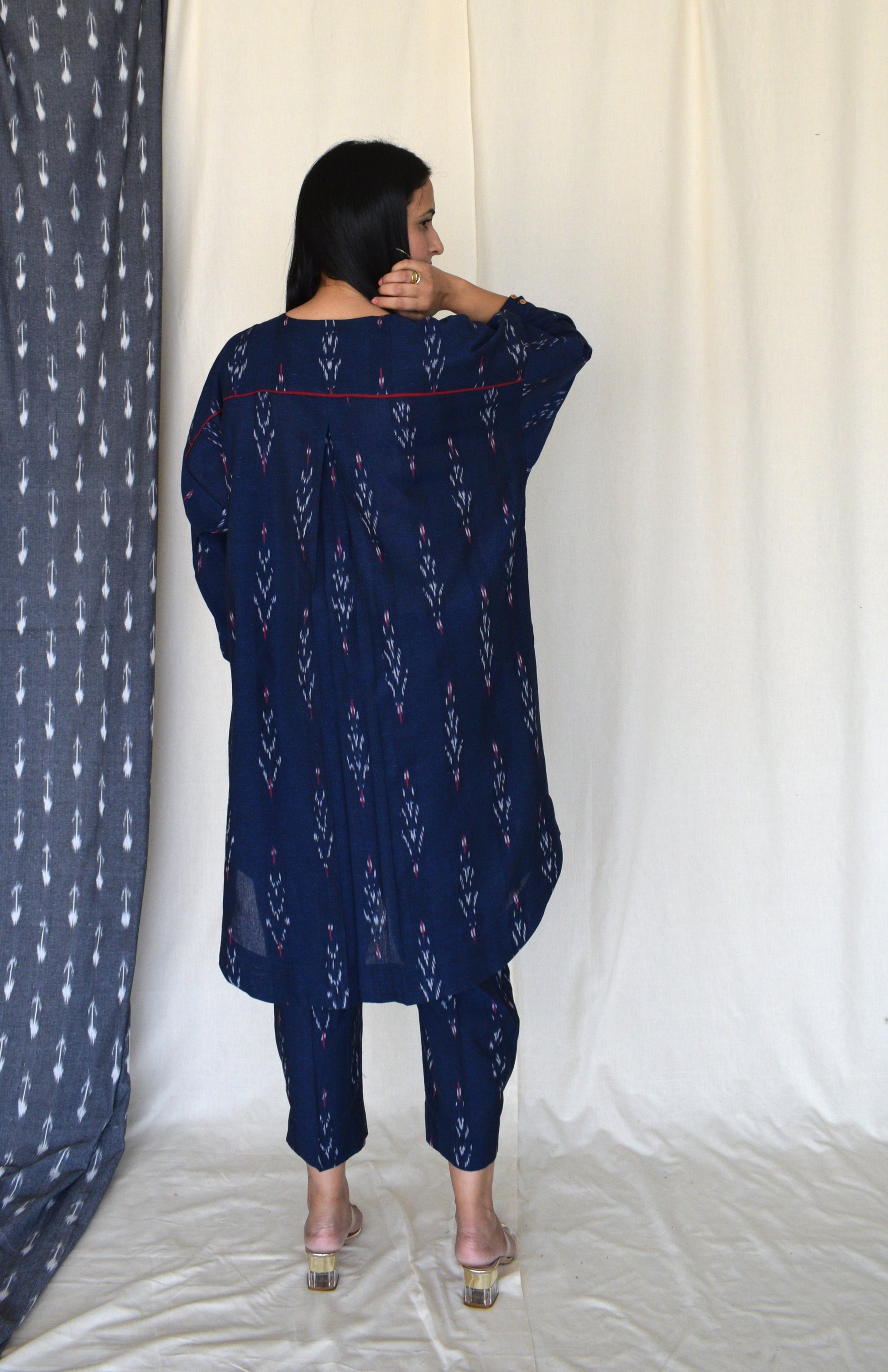 Our ikat co-ord set can easily be styled as it is with brogues or sandals. The kurta can be paired with denims and a tote bag for a casual day out.