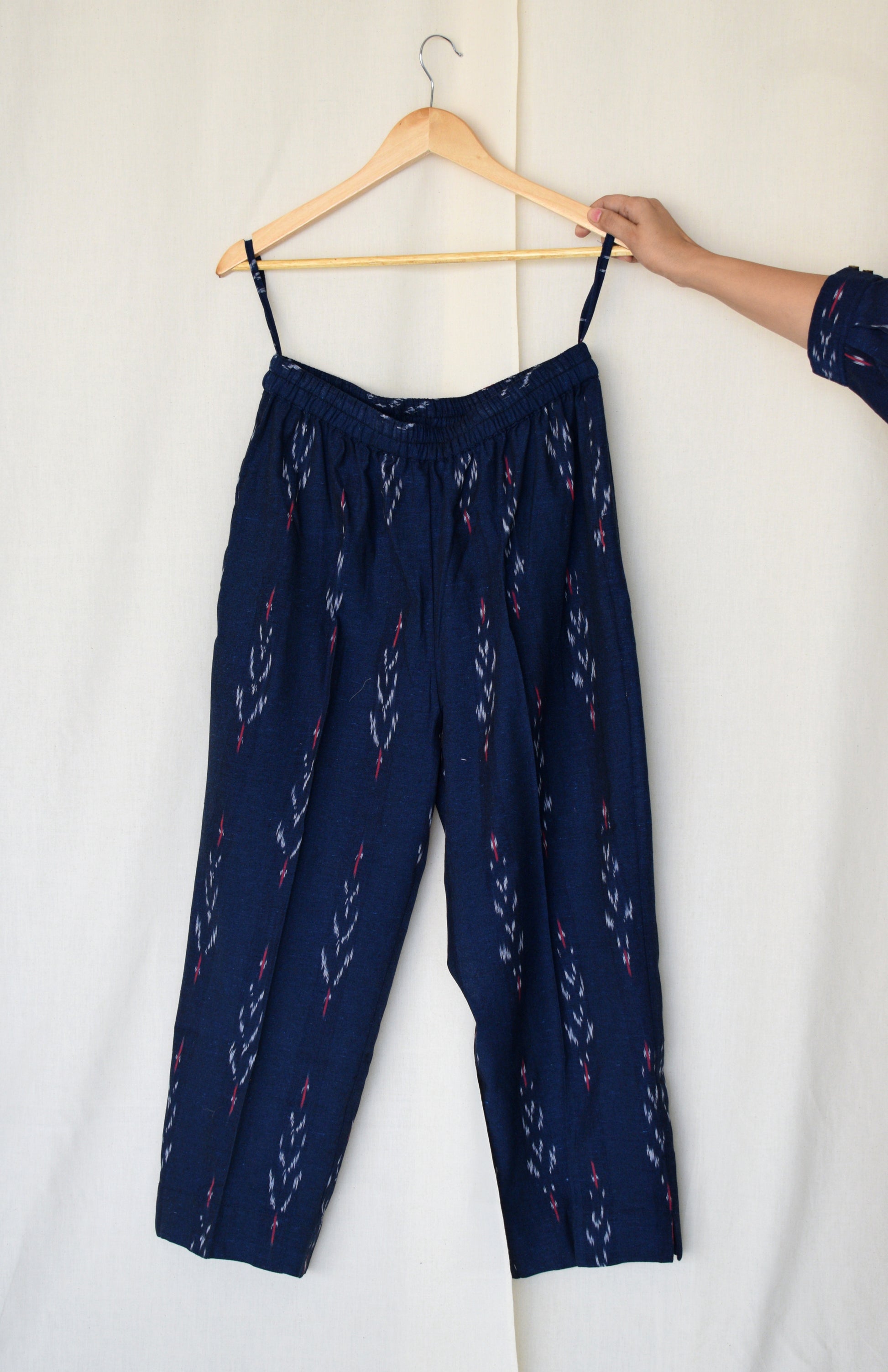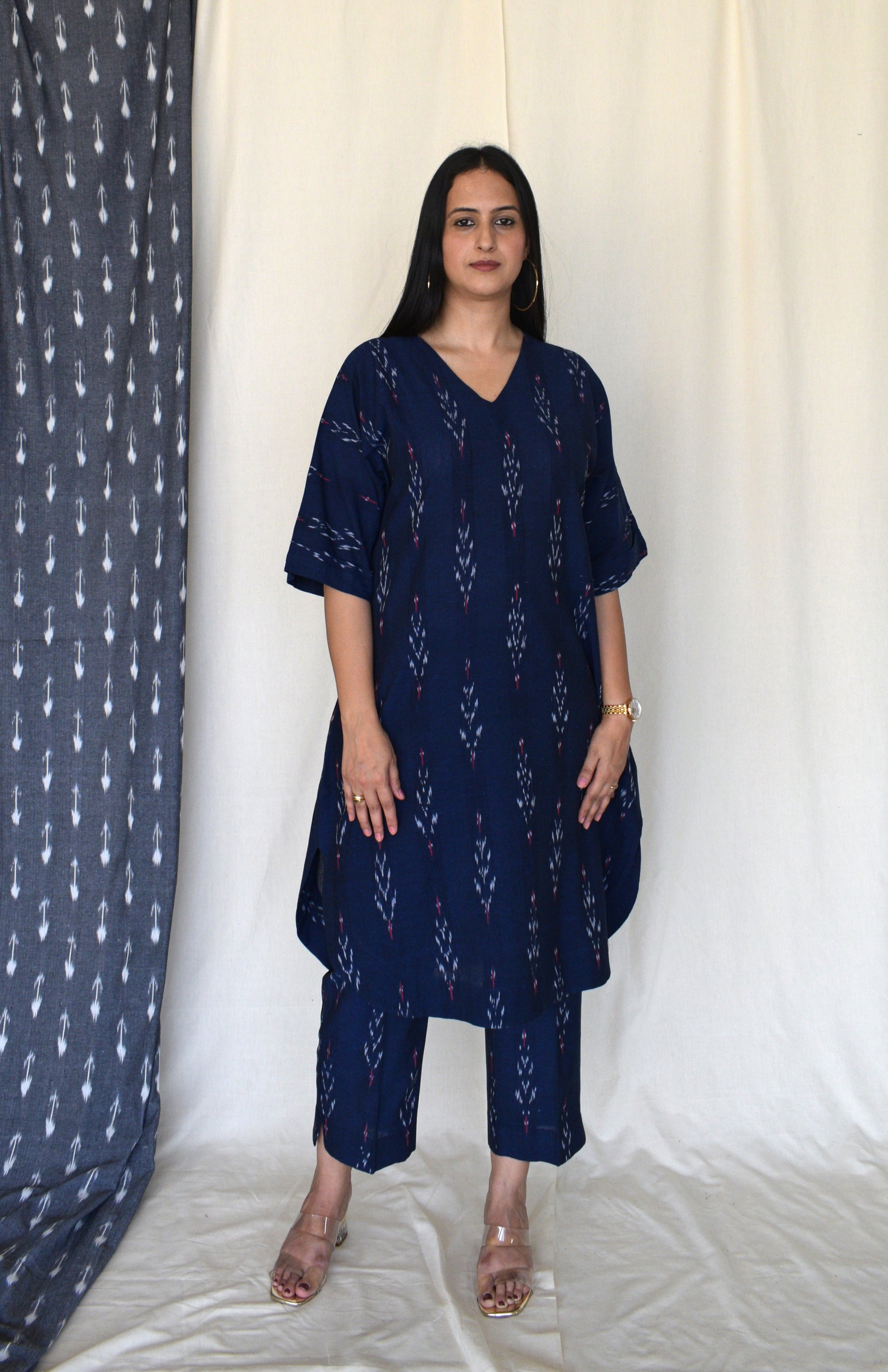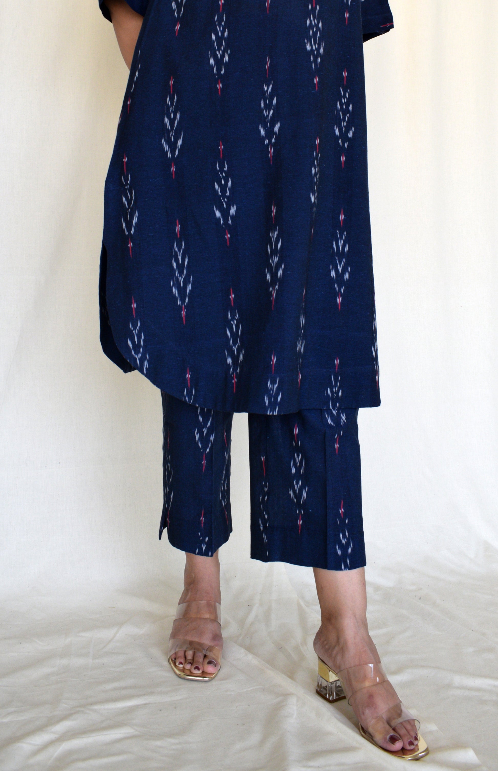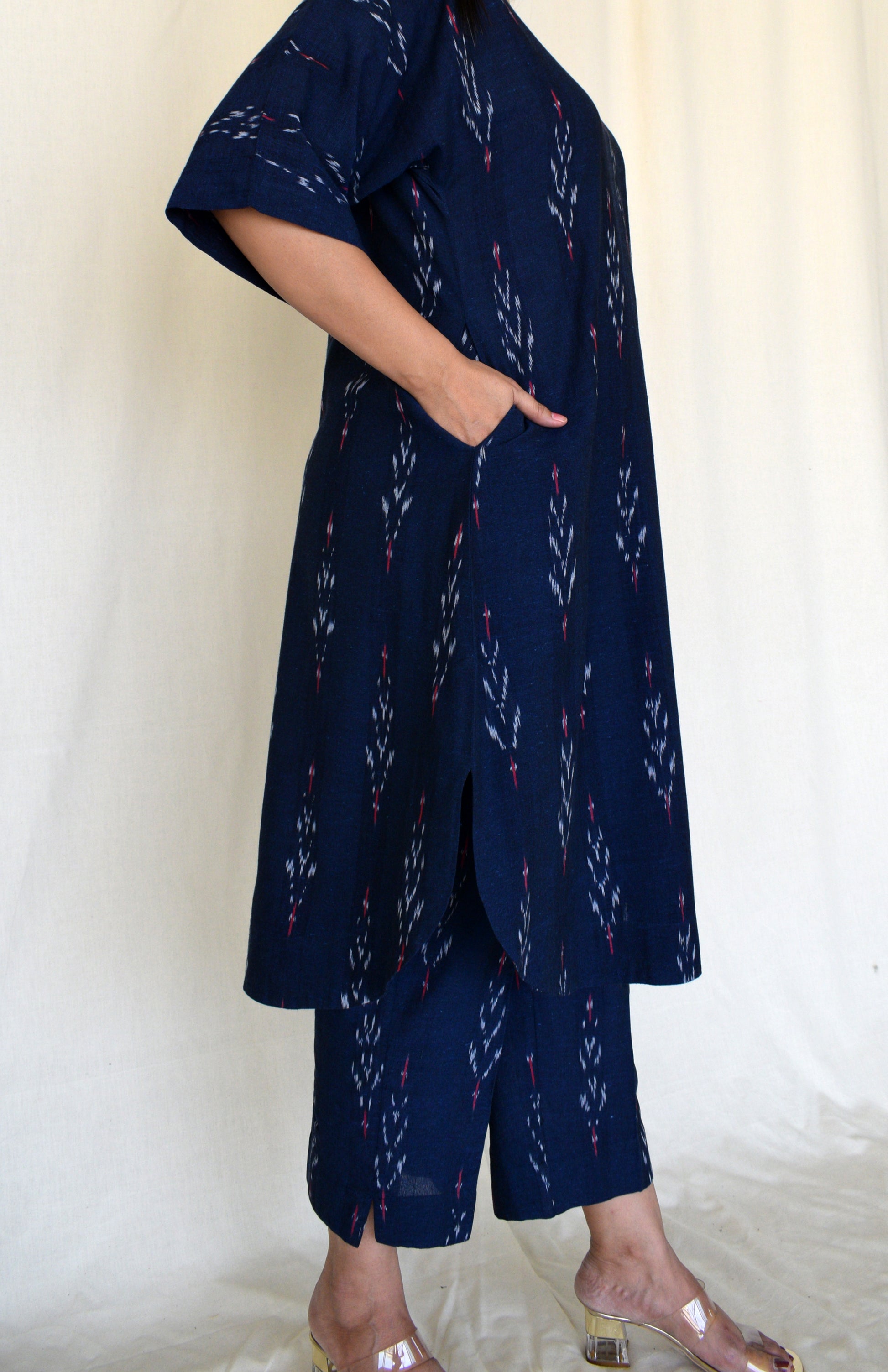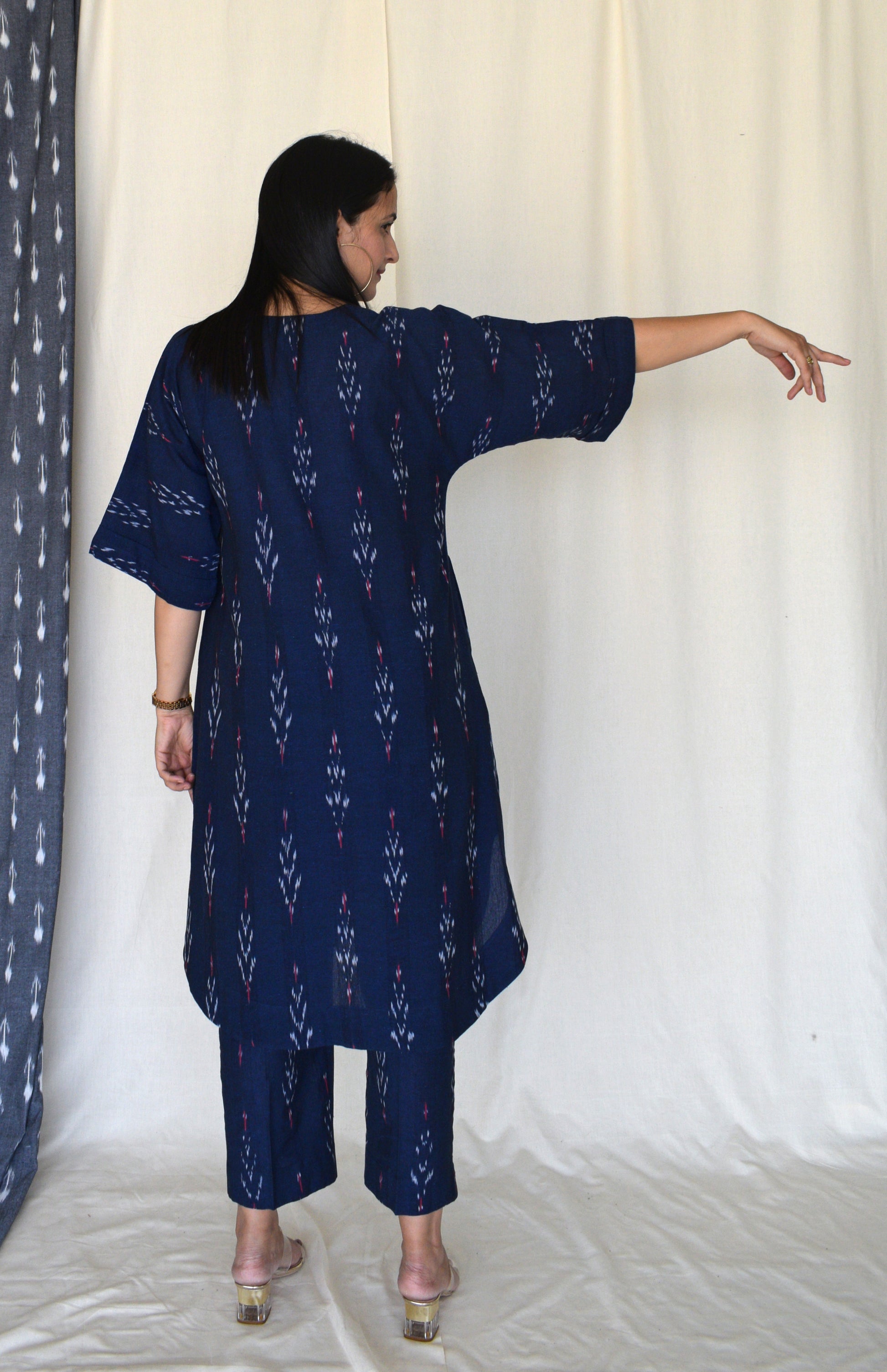Our ikat co-ord set can easily be styled as it is with brogues or sandals. The kurta can be paired with denims and a tote bag for a casual day out.