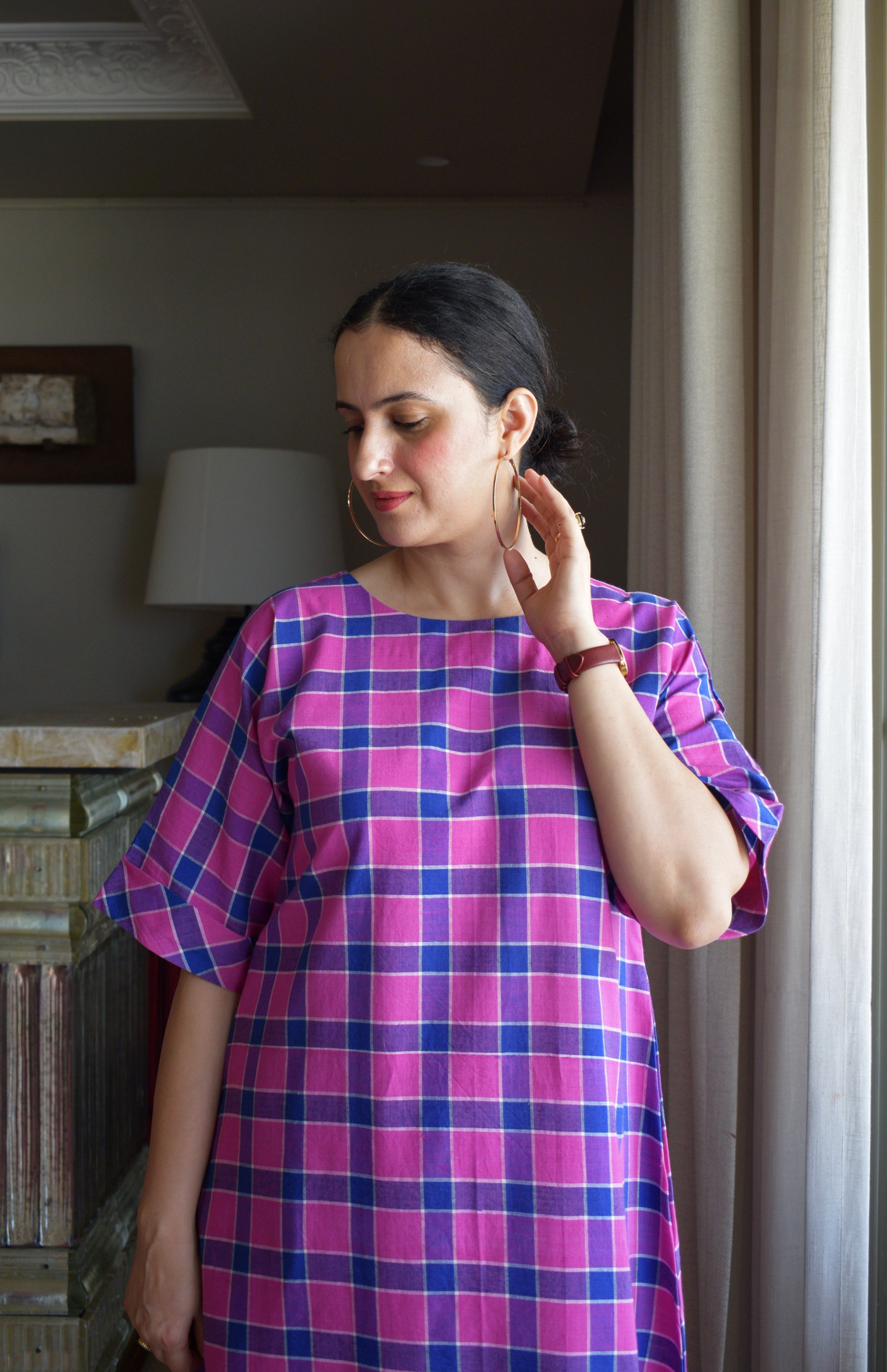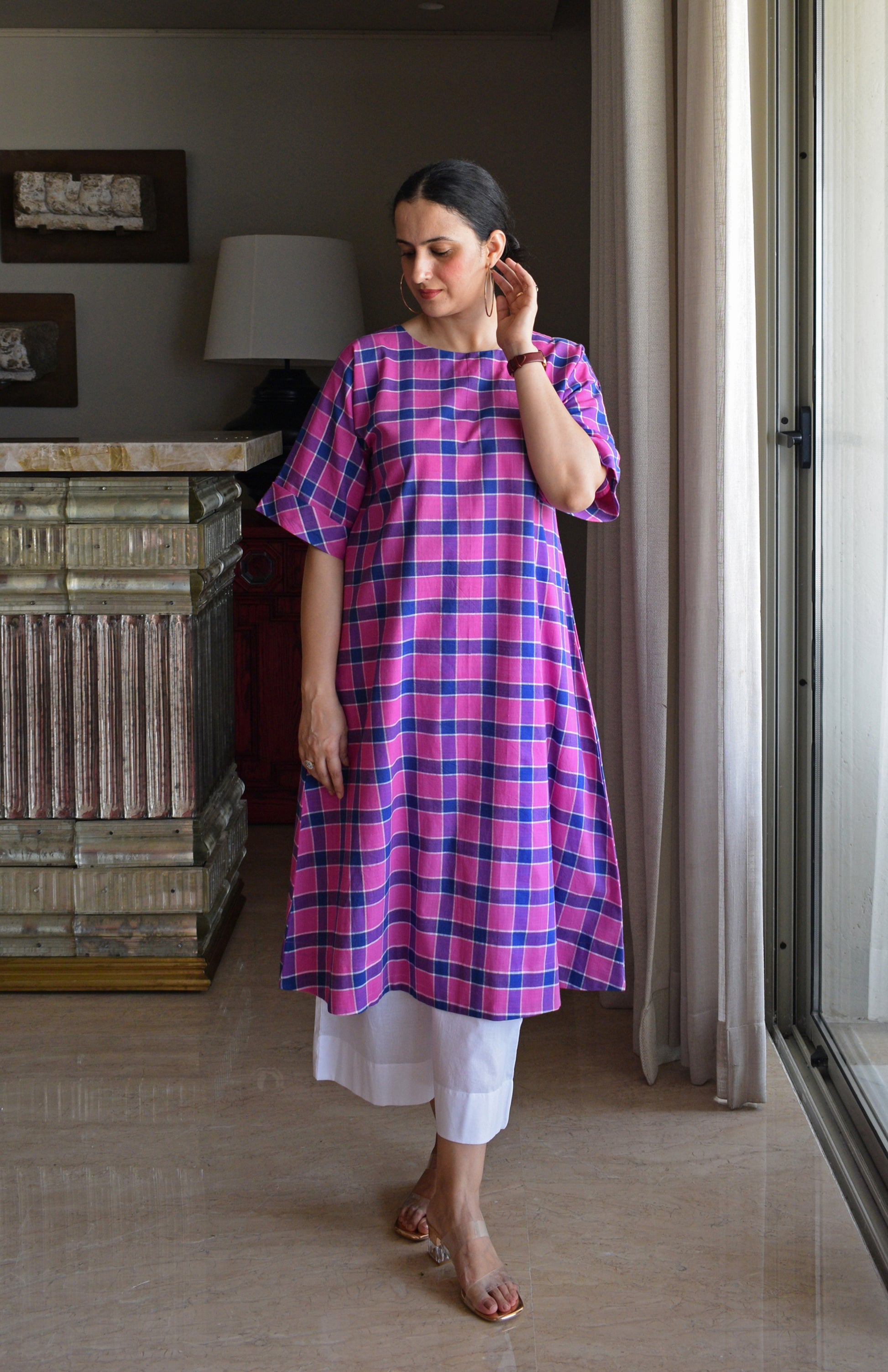 Orchid Pink A line Kurta in Handwoven Checks with White Pyjama