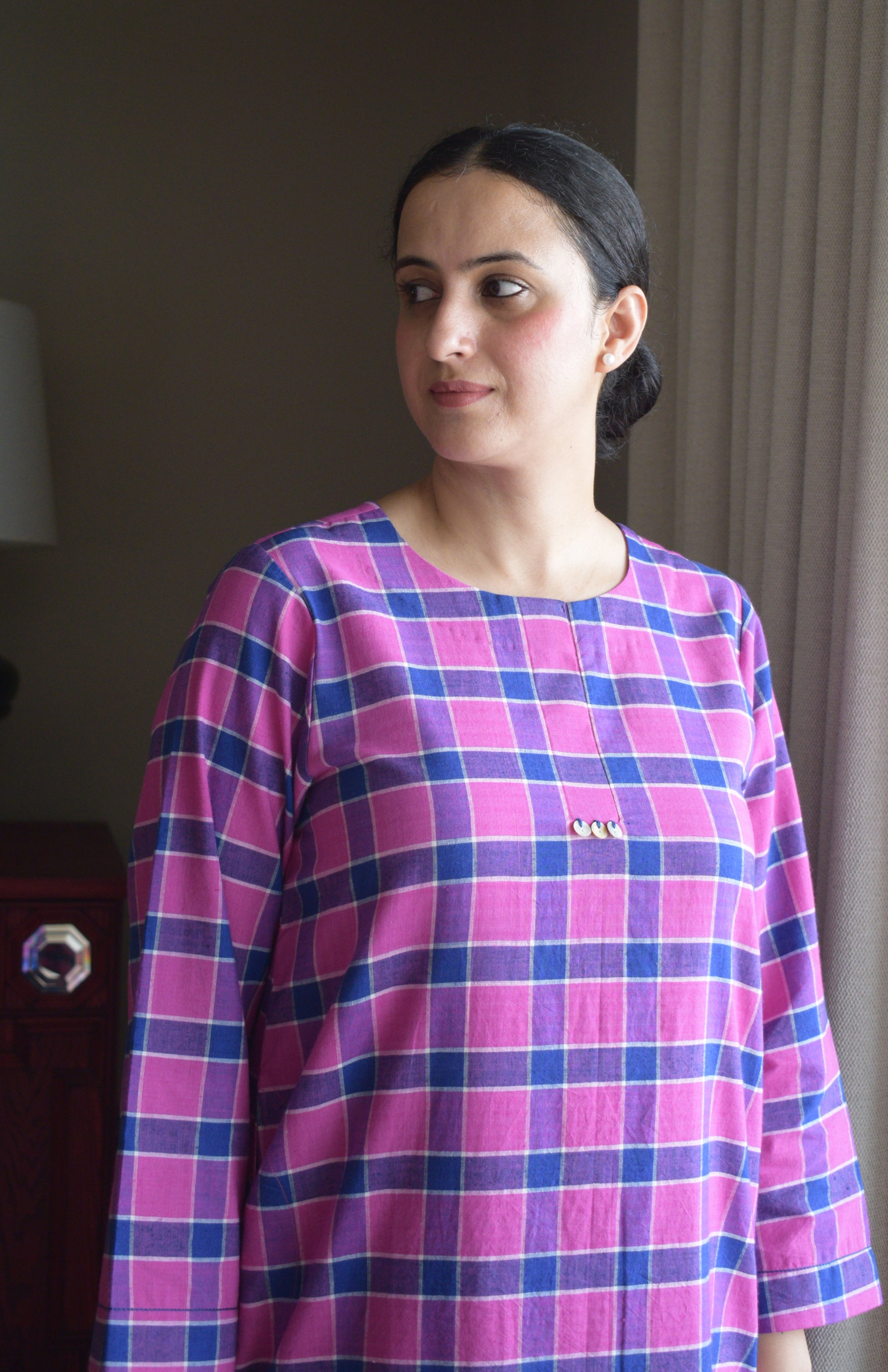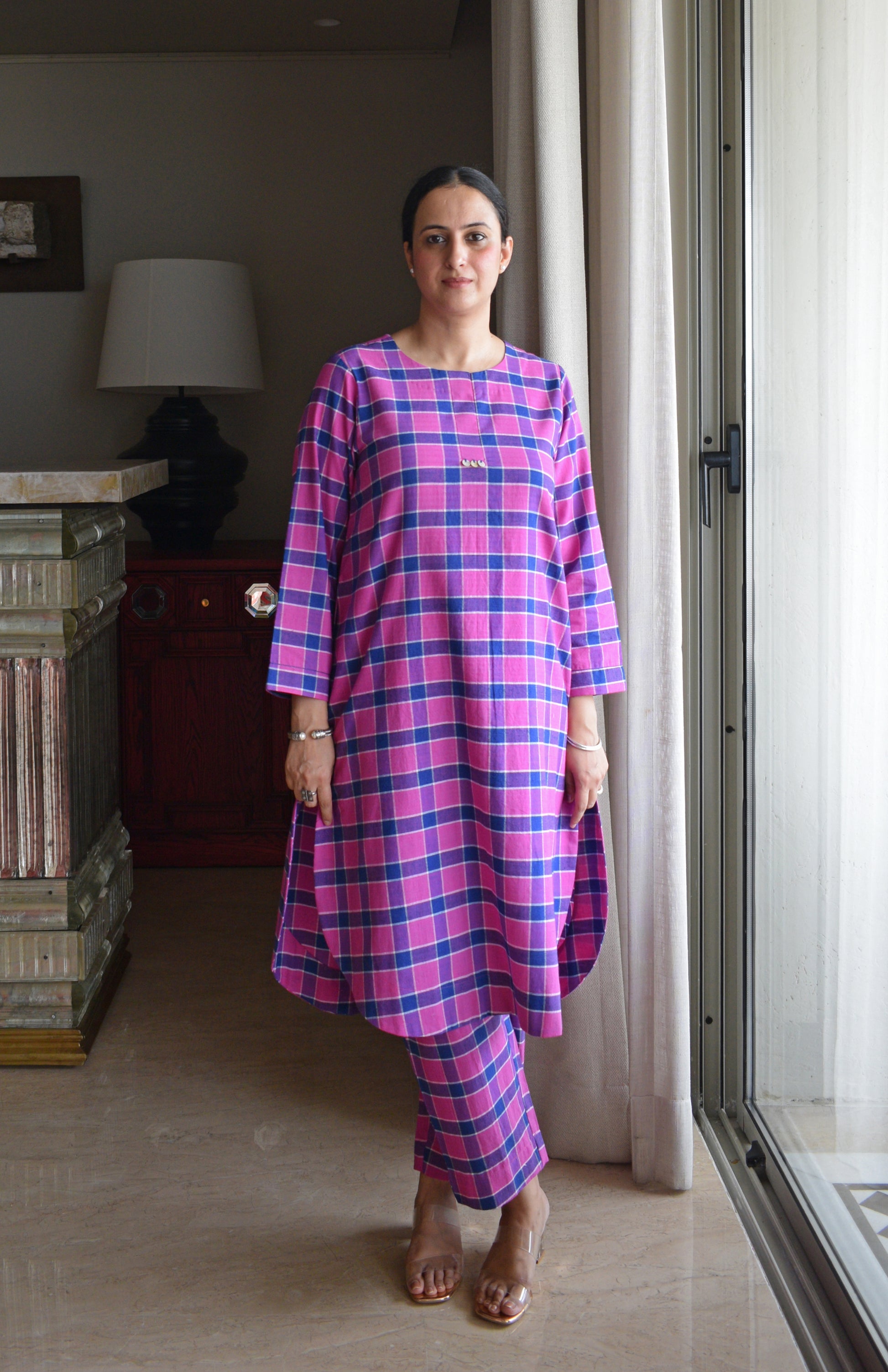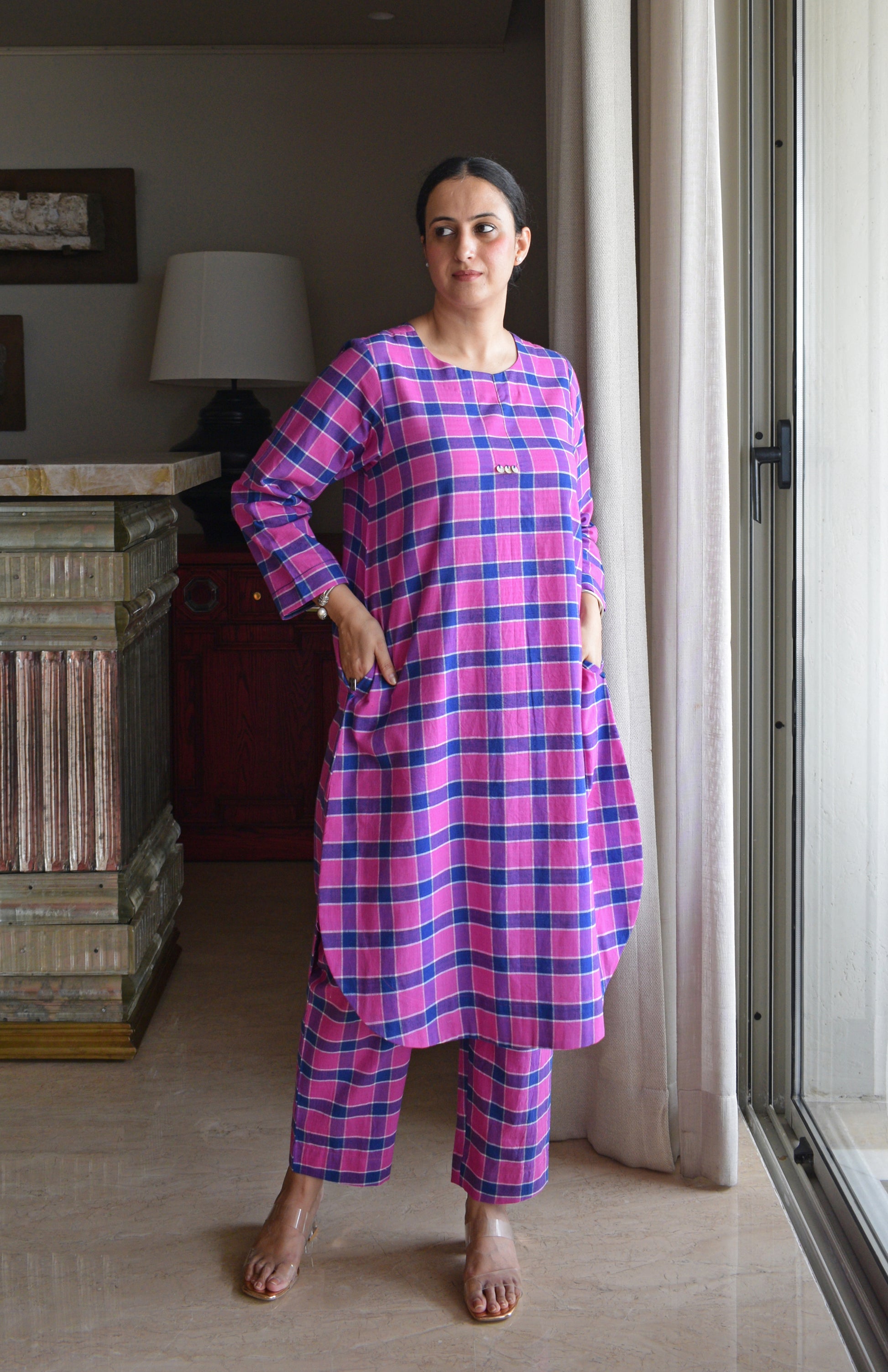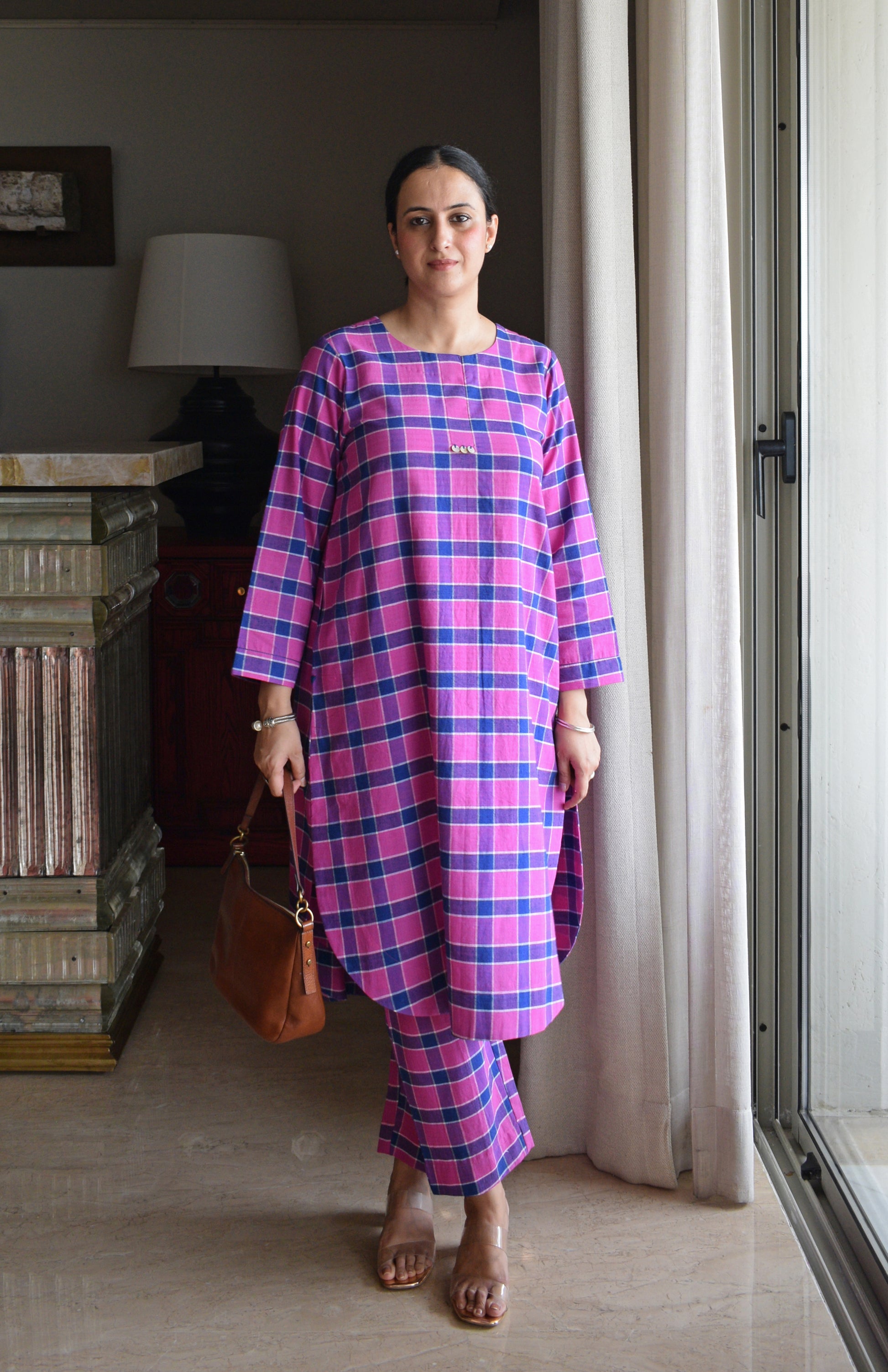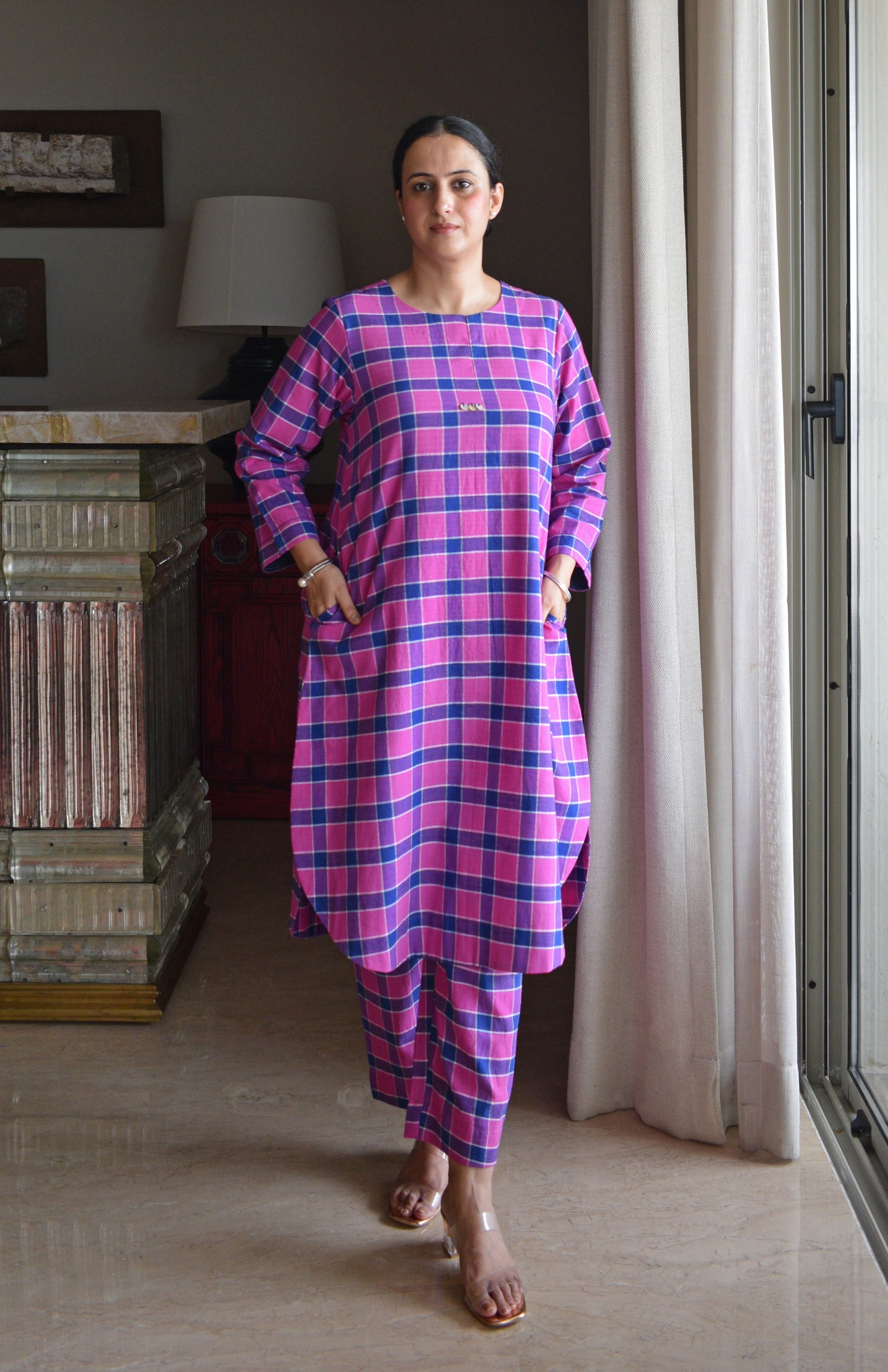 Purple Checks Antifit kurta in Handwoven Cotton and White pyjama