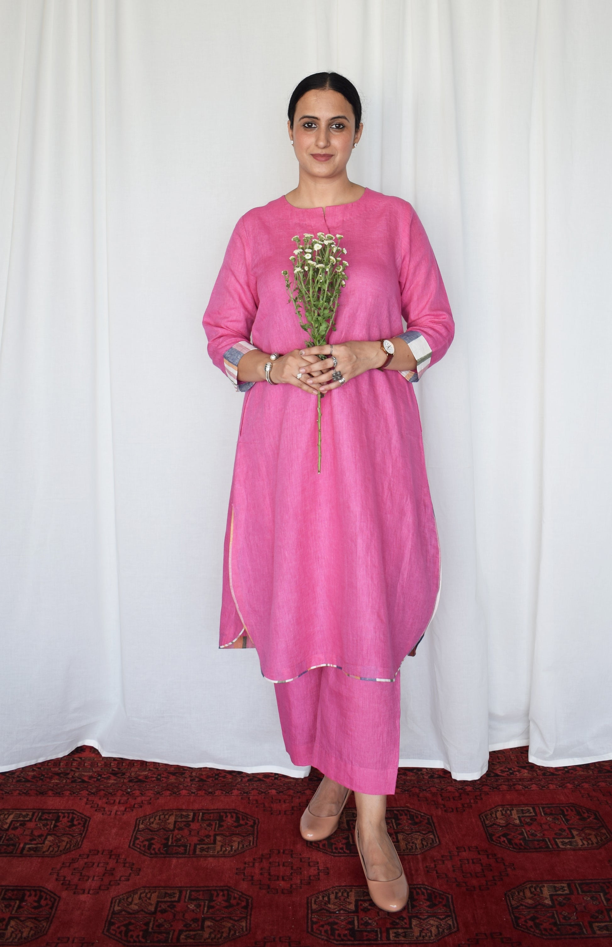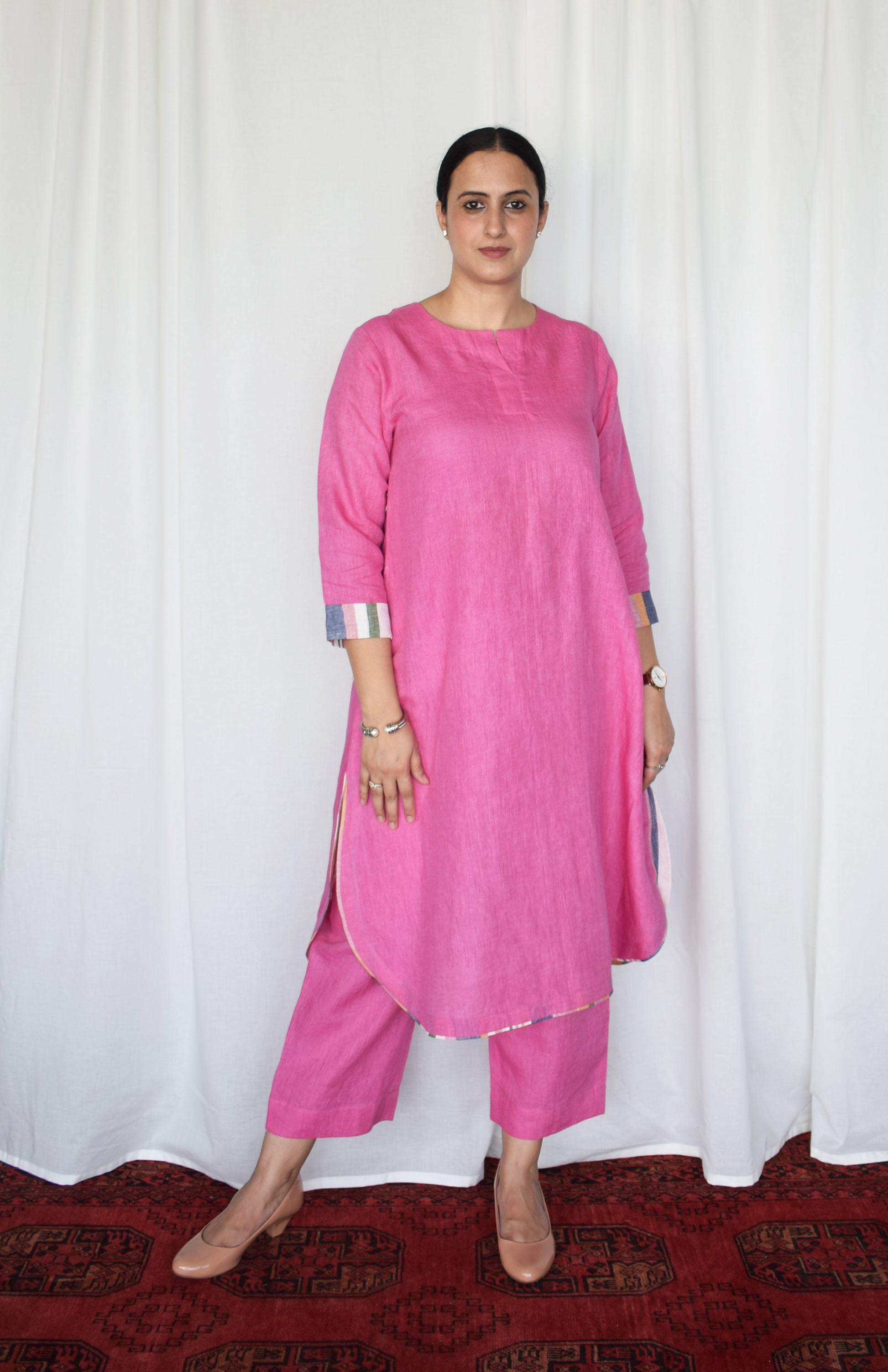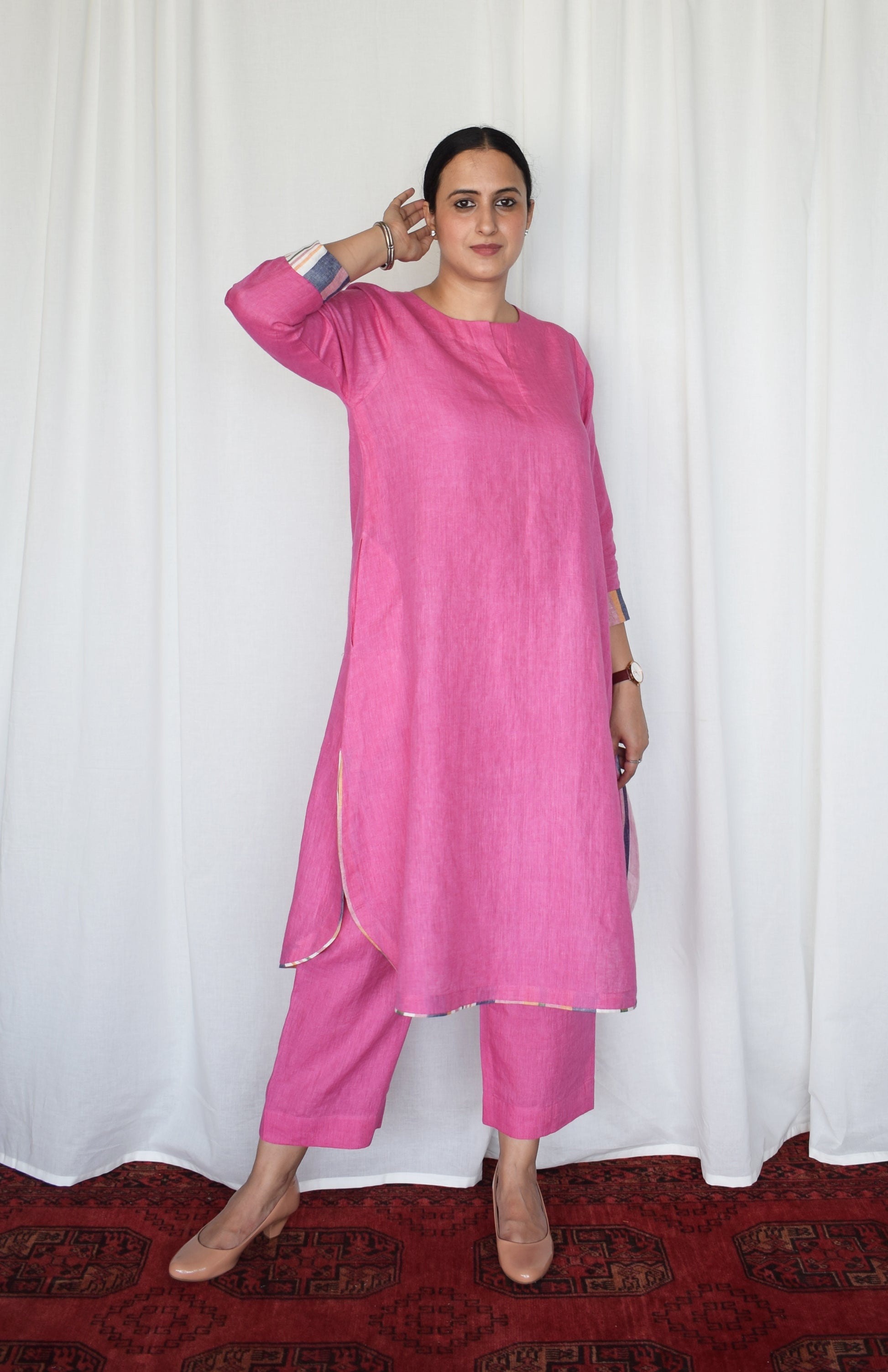 A comfort fit pure linen Co-ord set with overlap neckline detail, side slits and side pockets. The kurta features full length sleeves and a rounded hemline for a chic look. The contrast piping details on the hemline makes it a must have set in your wardrobe. This set comes with a pair of straight fit pajamas in the same fabric with full elastic waistband