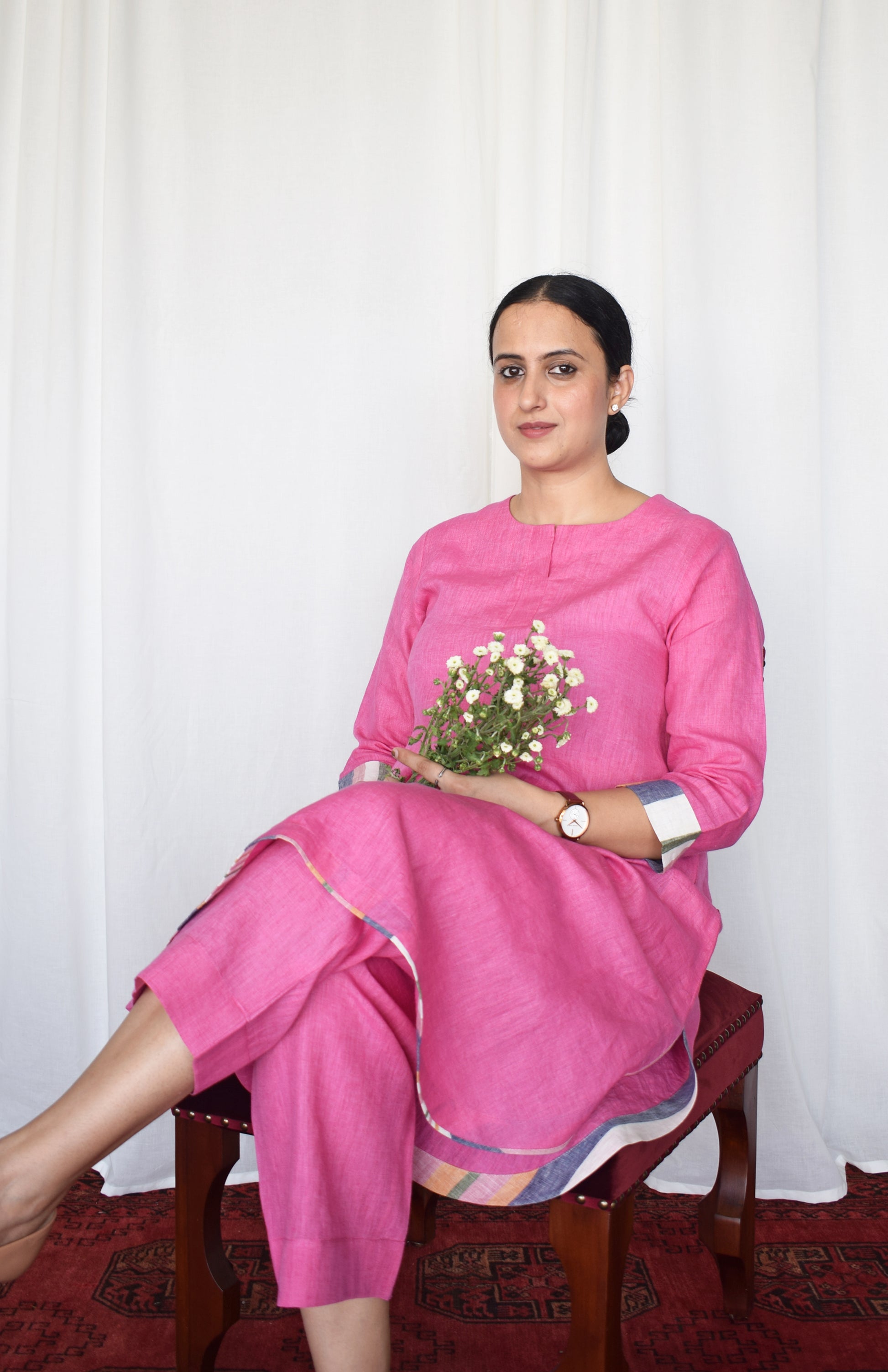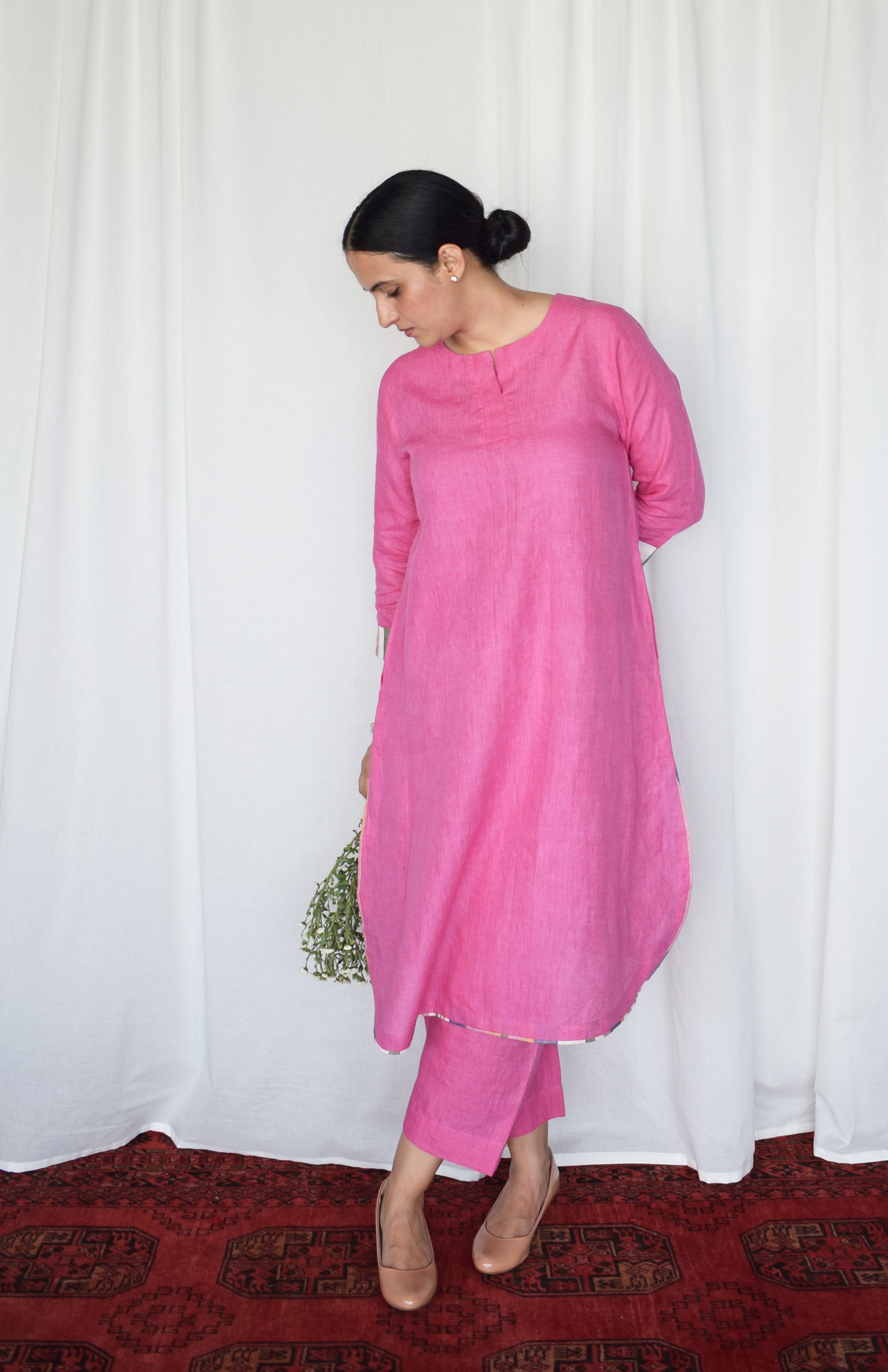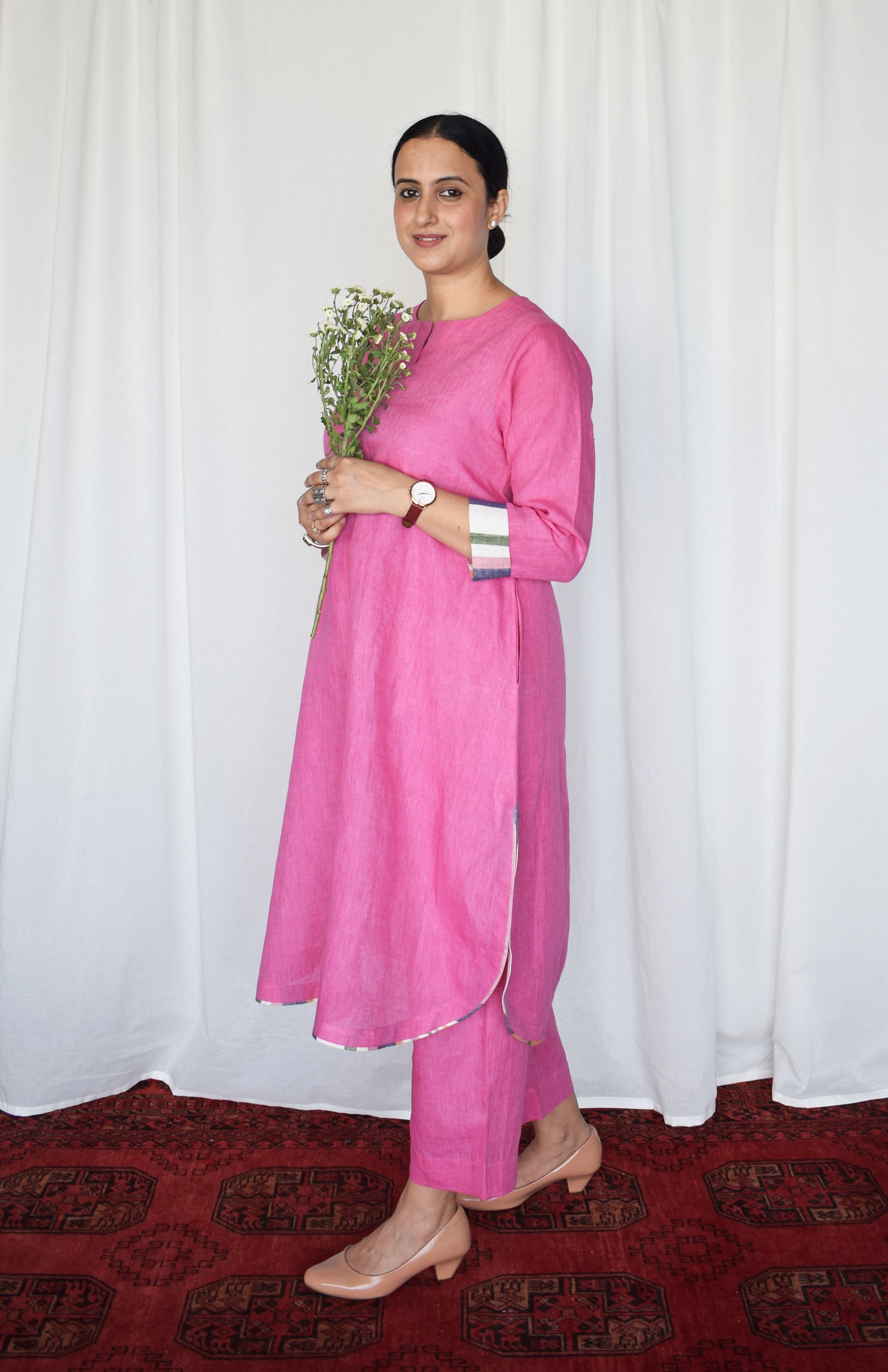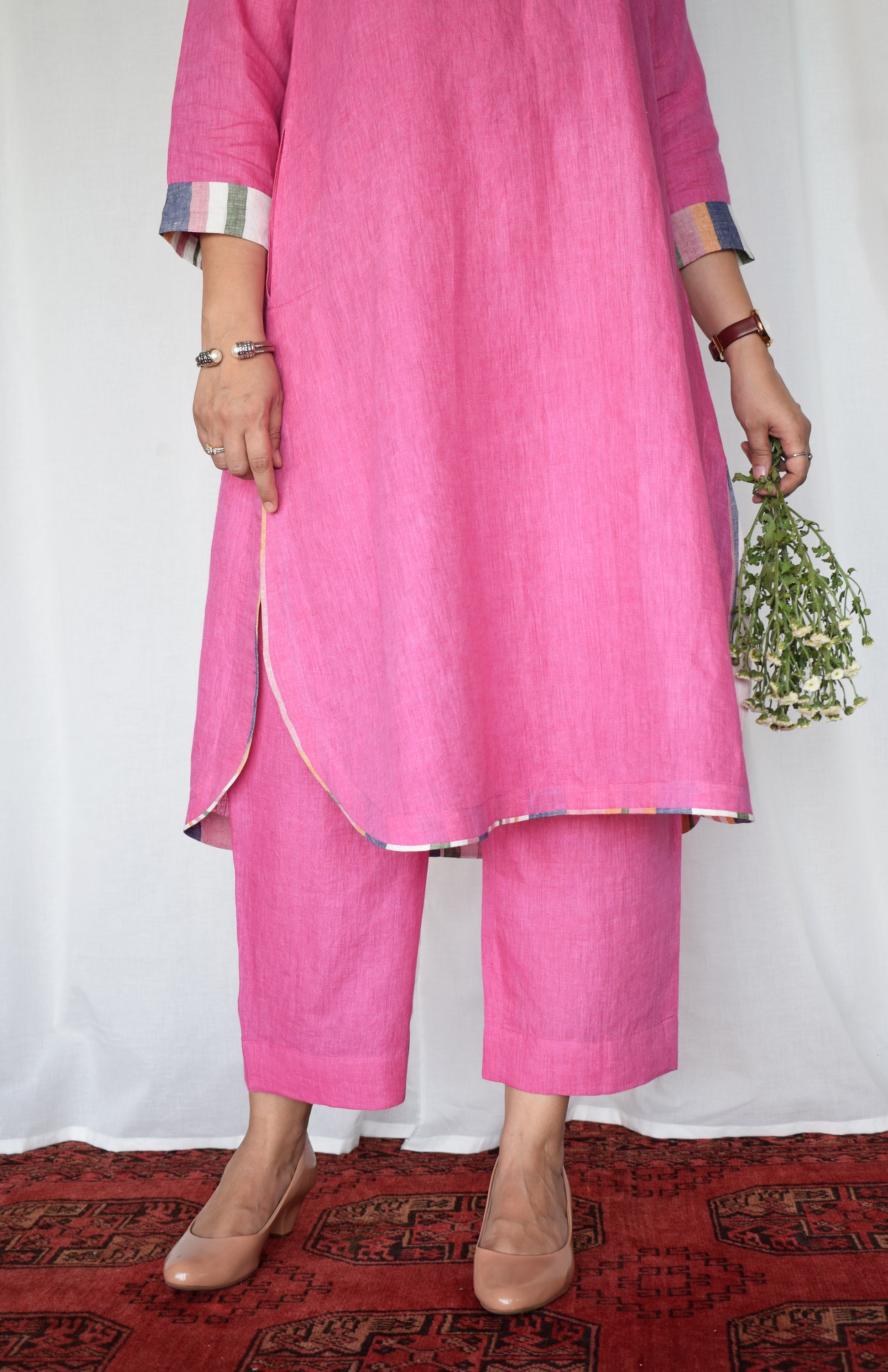 A comfort fit pure linen Co-ord set with overlap neckline detail, side slits and side pockets. The kurta features full length sleeves and a rounded hemline for a chic look. The contrast piping details on the hemline makes it a must have set in your wardrobe. This set comes with a pair of straight fit pajamas in the same fabric with full elastic waistband