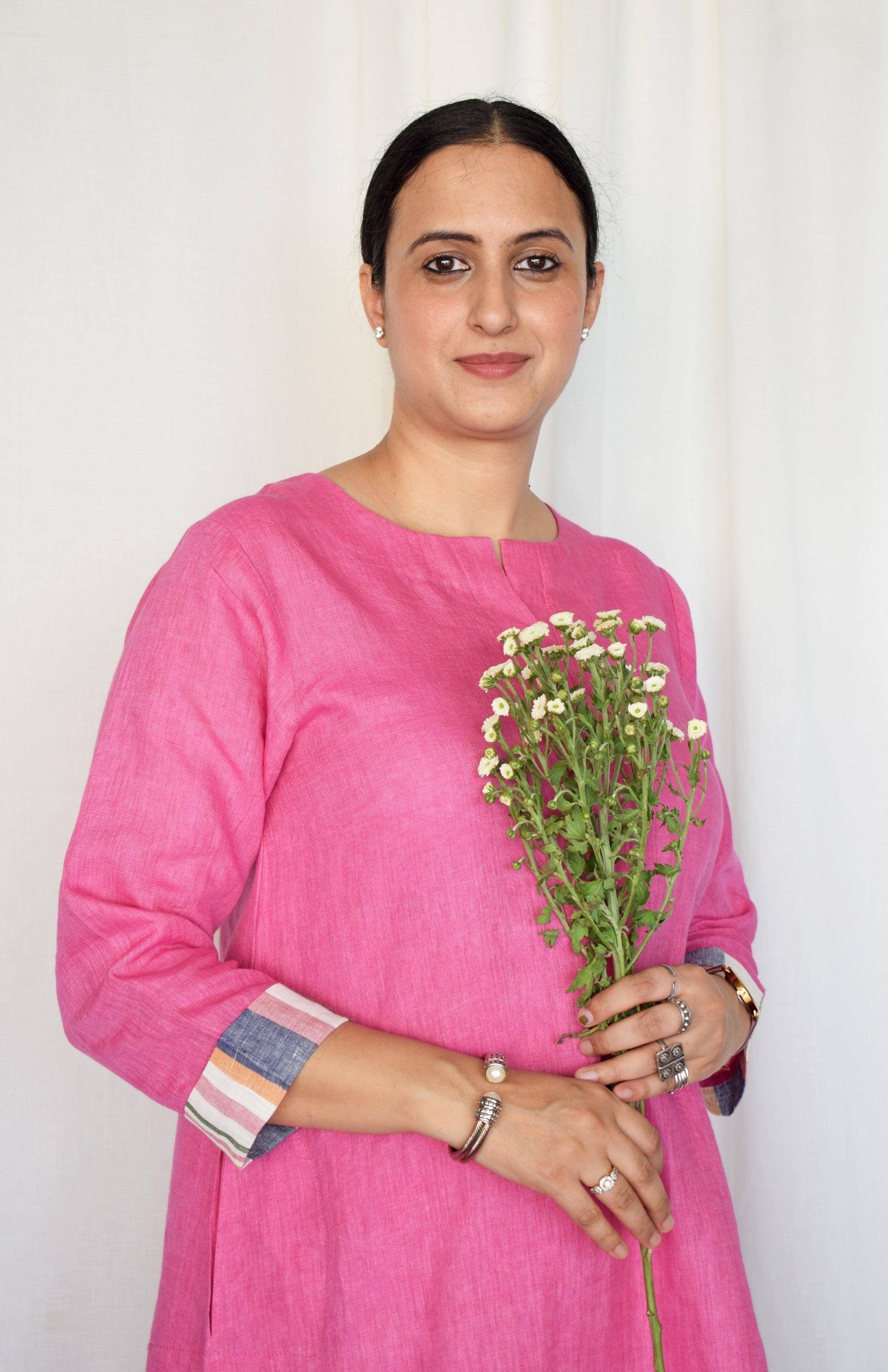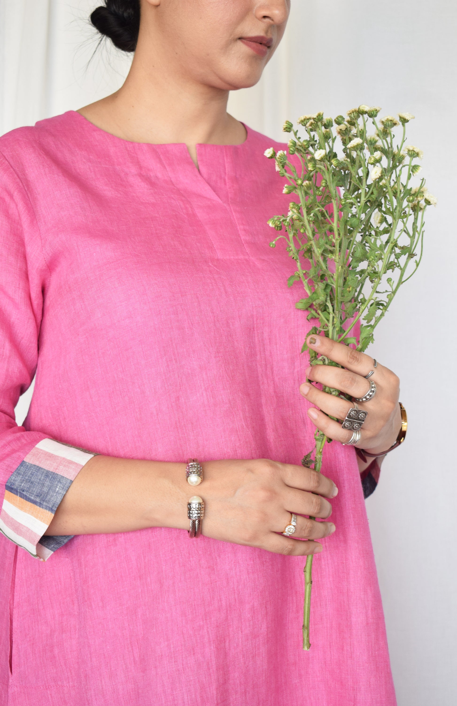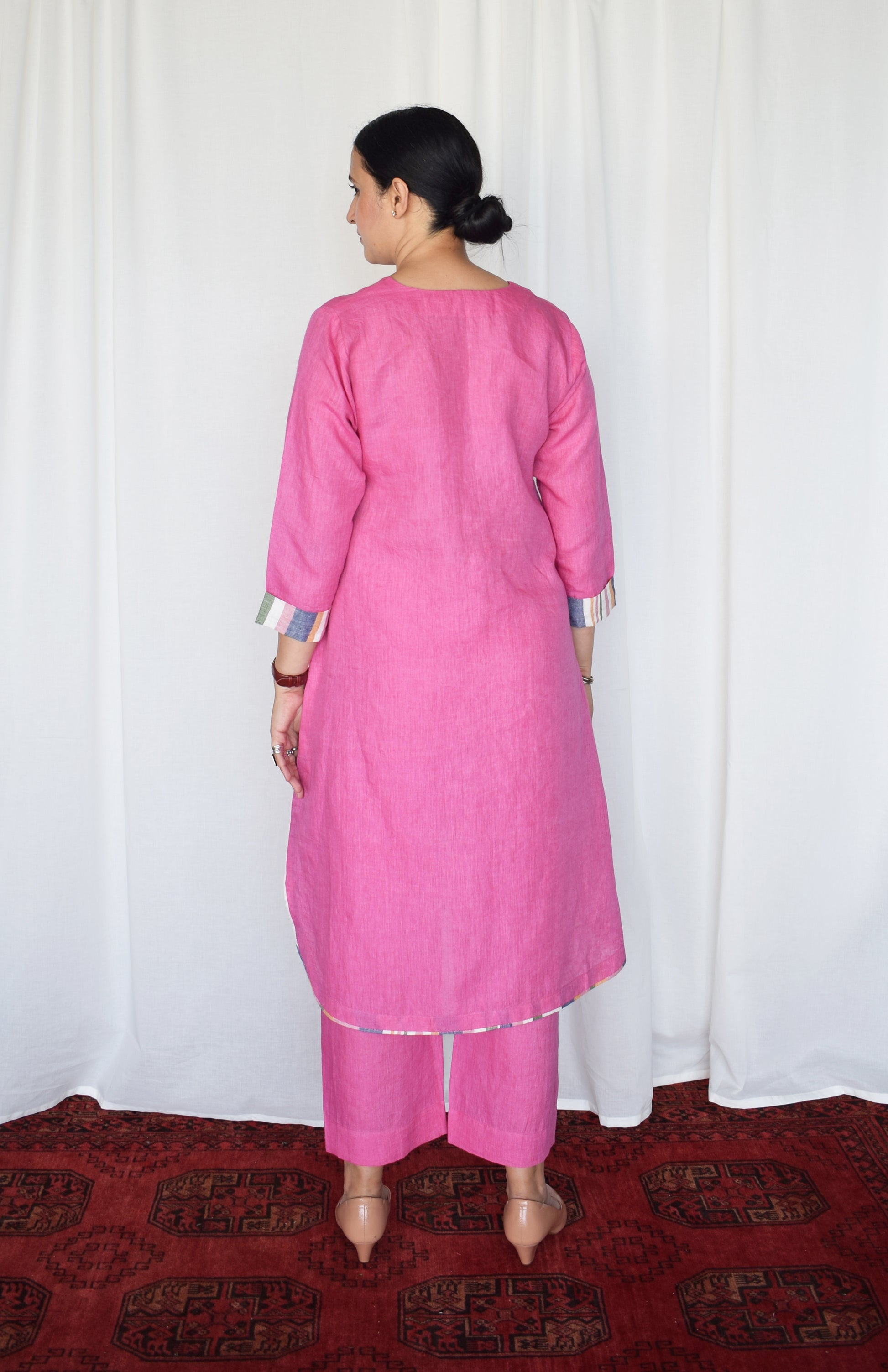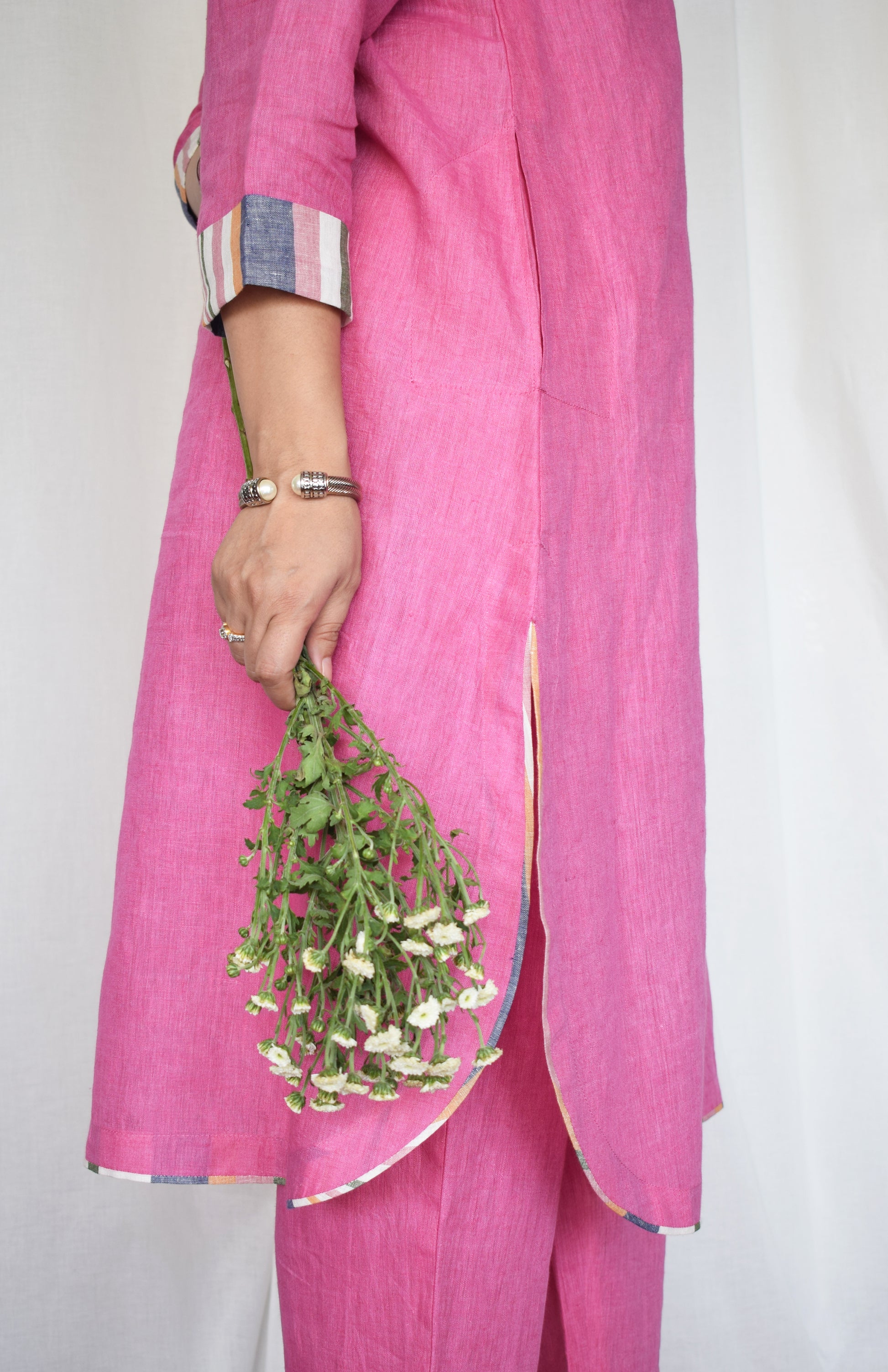 Coral Stripe Bias Paneled kurta in Handwoven cotton