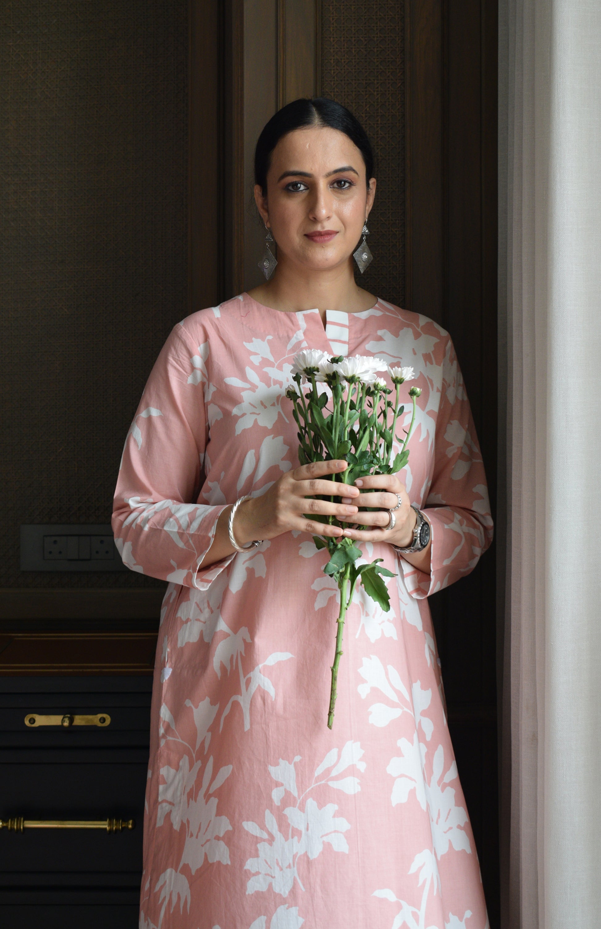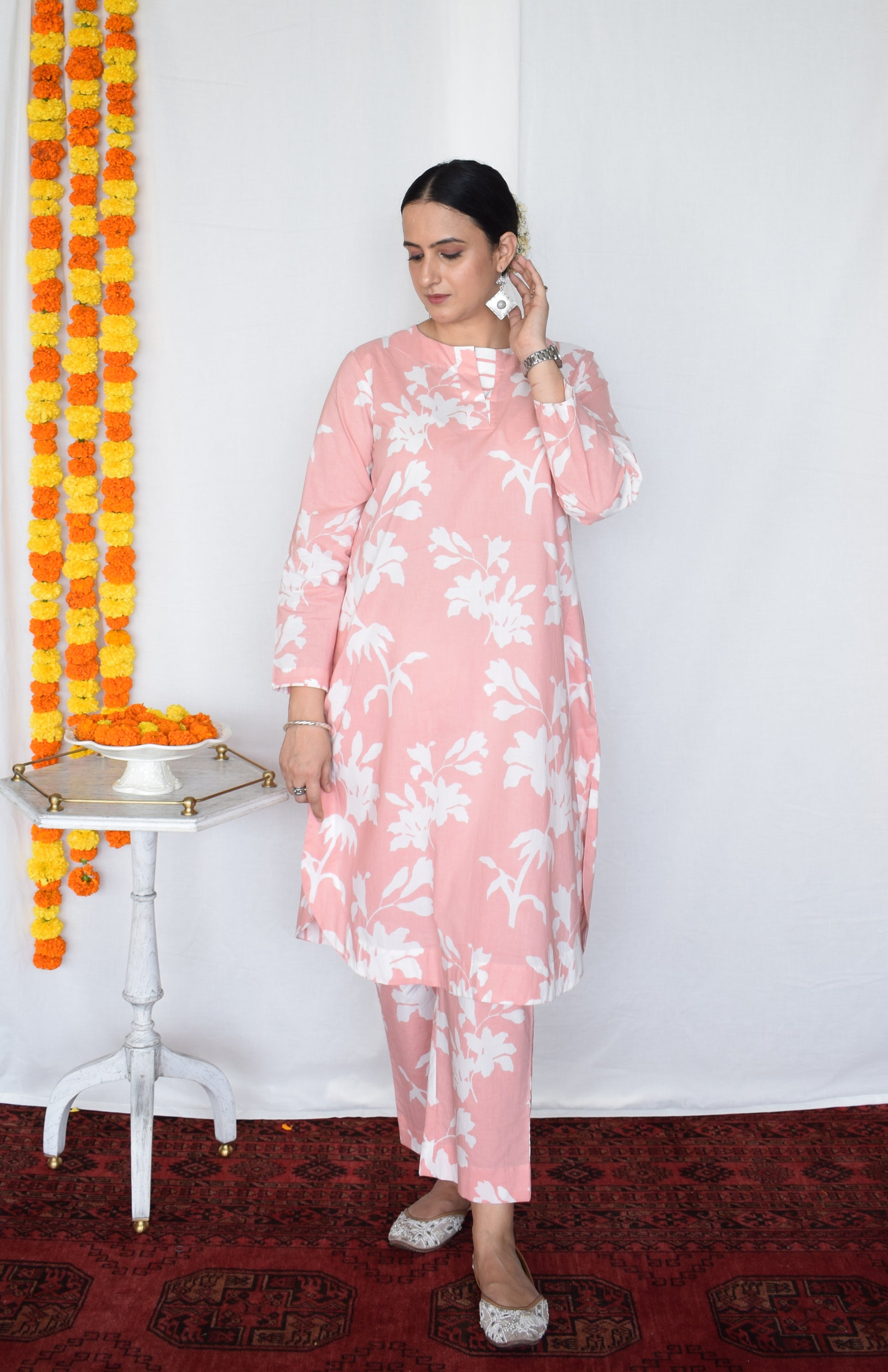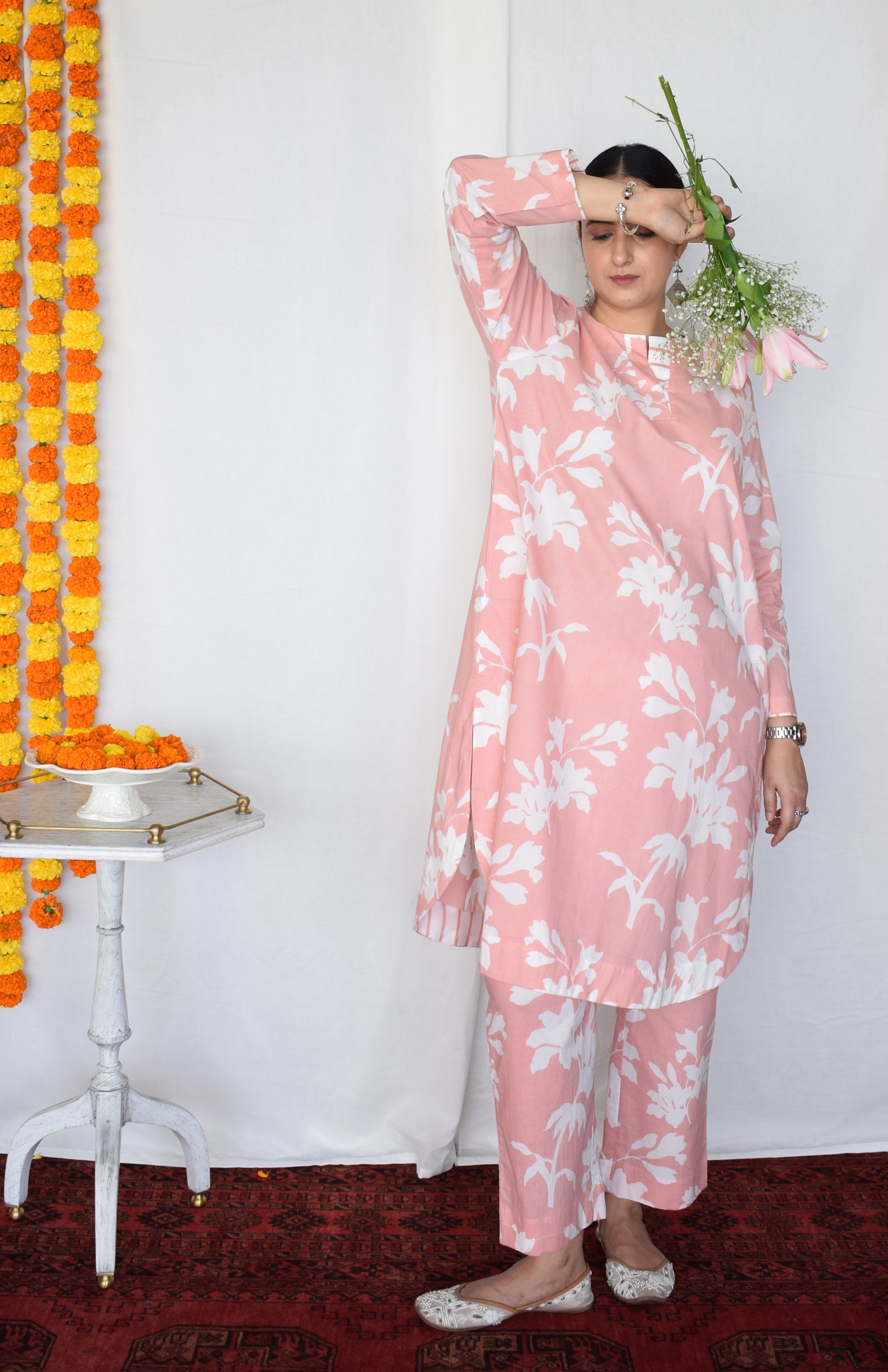 A printed Co-ord set with overlap neckline detail, side slits and embroidered side pockets. The kurta features full length sleeves and a rounded hemline for a chic look. The back yoke with gathers ensures that the fit is comfortable to wear. This set comes with a pair of straight fit pajamas in the same fabric with full elastic waistband.