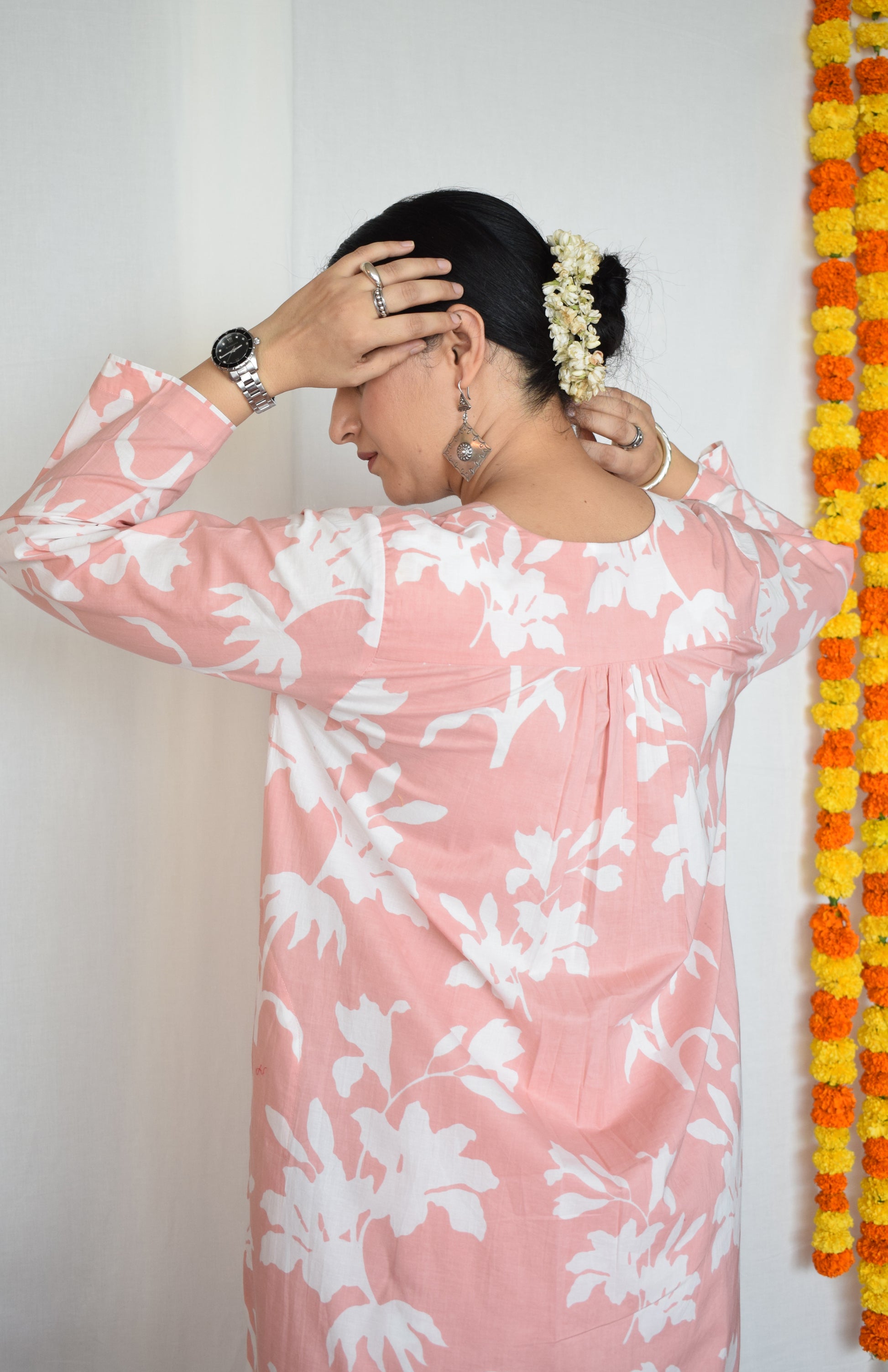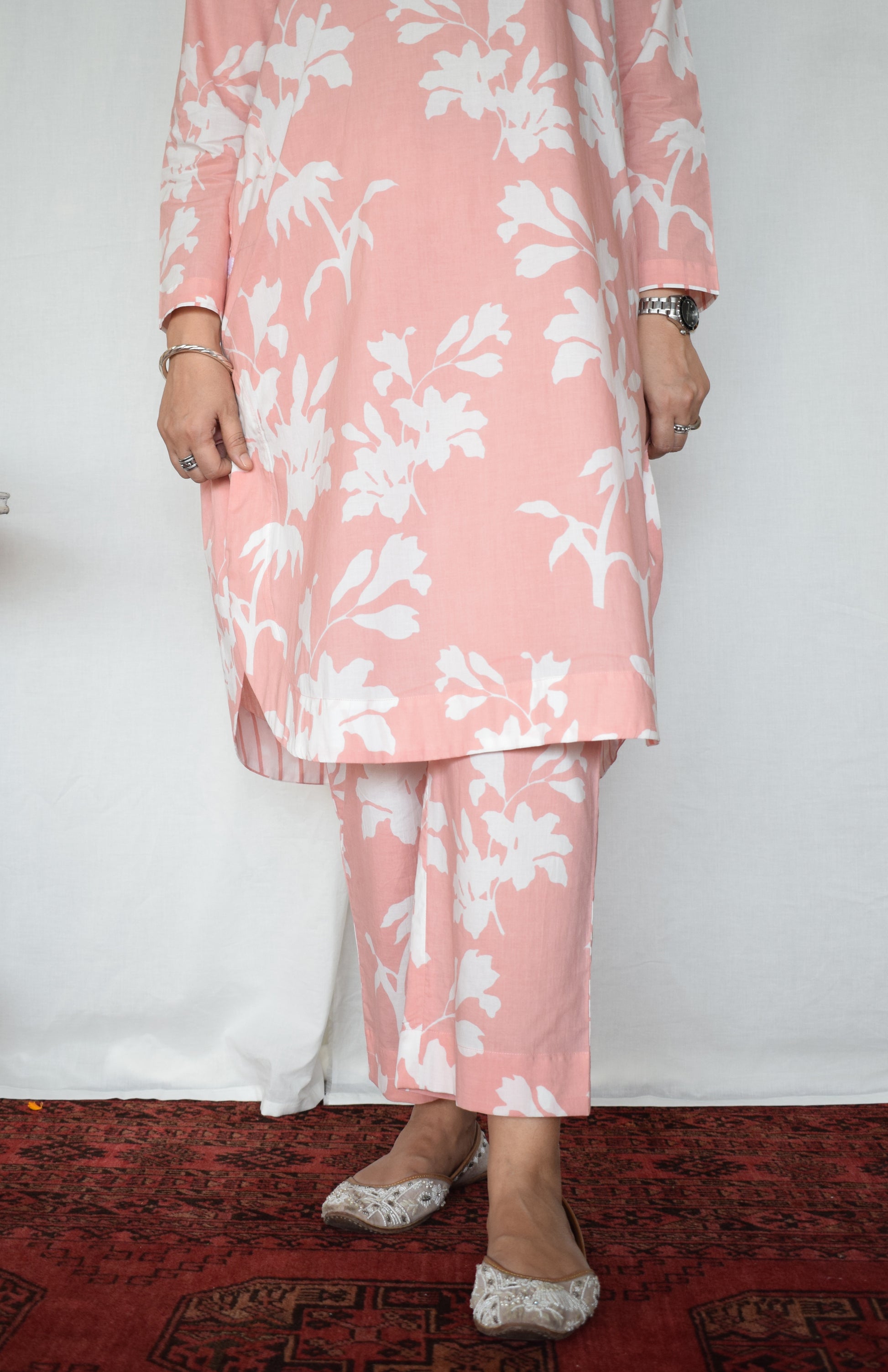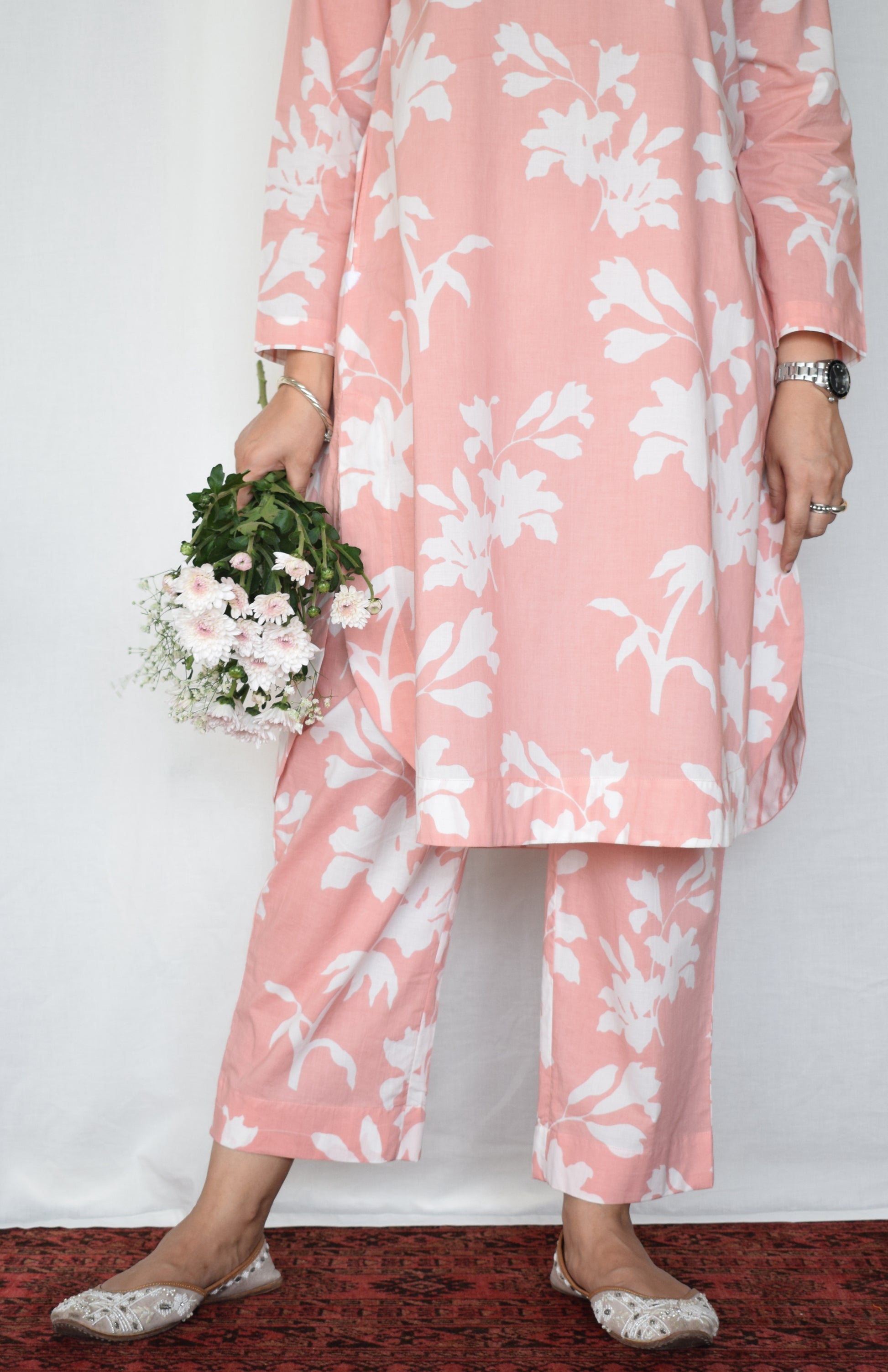 A printed Co-ord set with overlap neckline detail, side slits and embroidered side pockets. The kurta features full length sleeves and a rounded hemline for a chic look. The back yoke with gathers ensures that the fit is comfortable to wear. This set comes with a pair of straight fit pajamas in the same fabric with full elastic waistband.