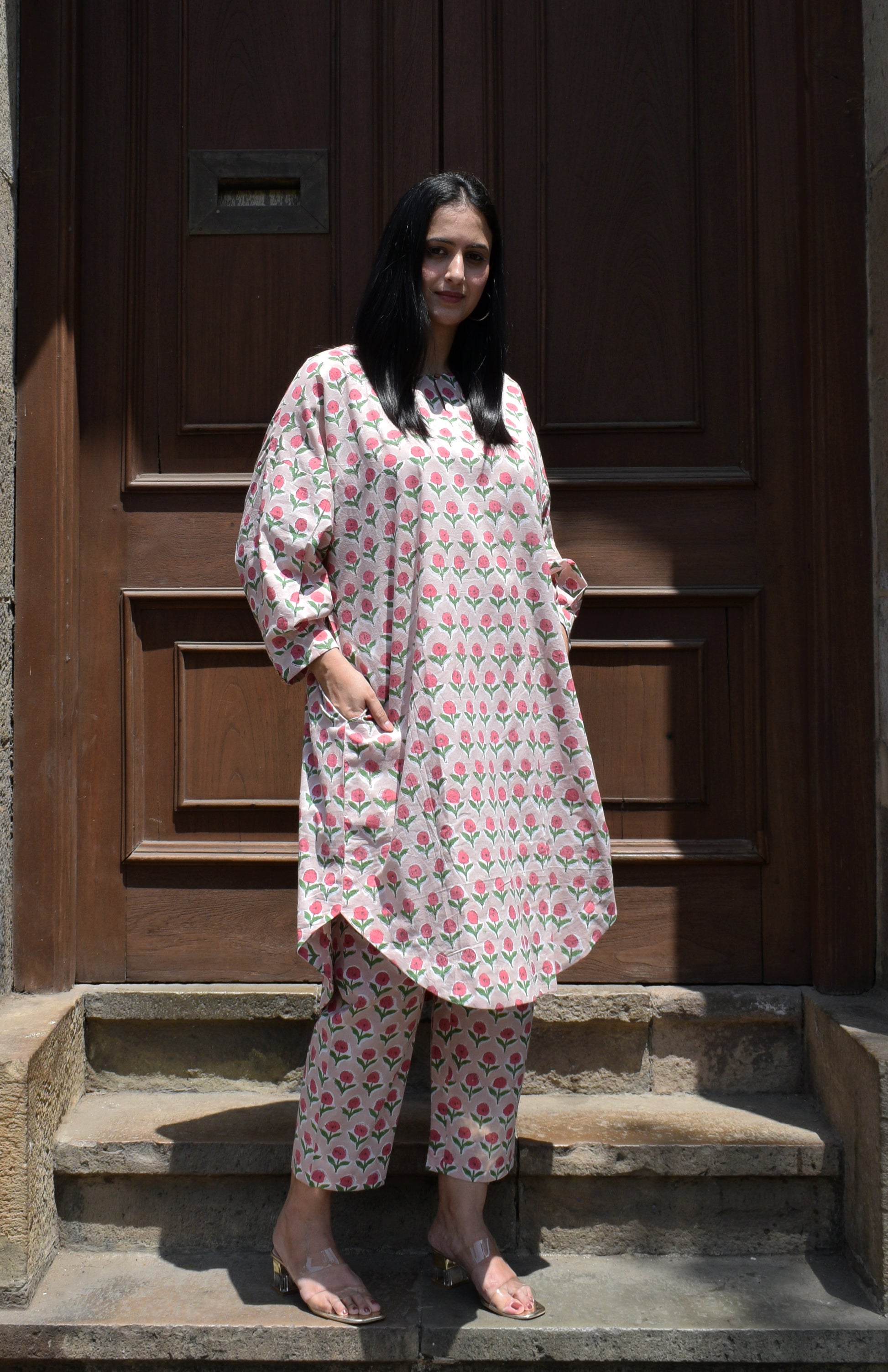 Our Pink hand block printed co-ord set can easily be styled as it is with brogues or sandals. The kurta can be paired with denims and a tote bag for a casual day out