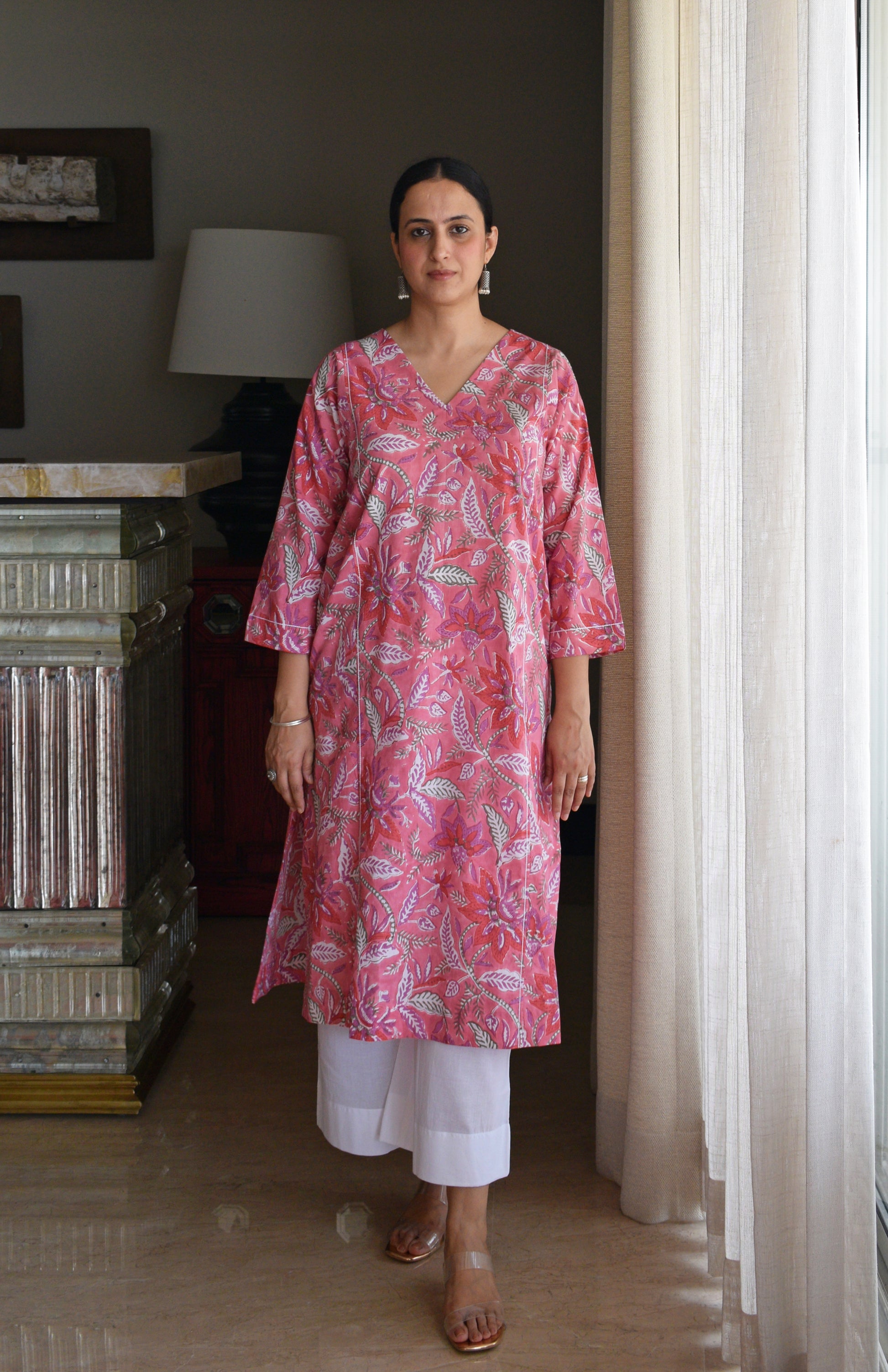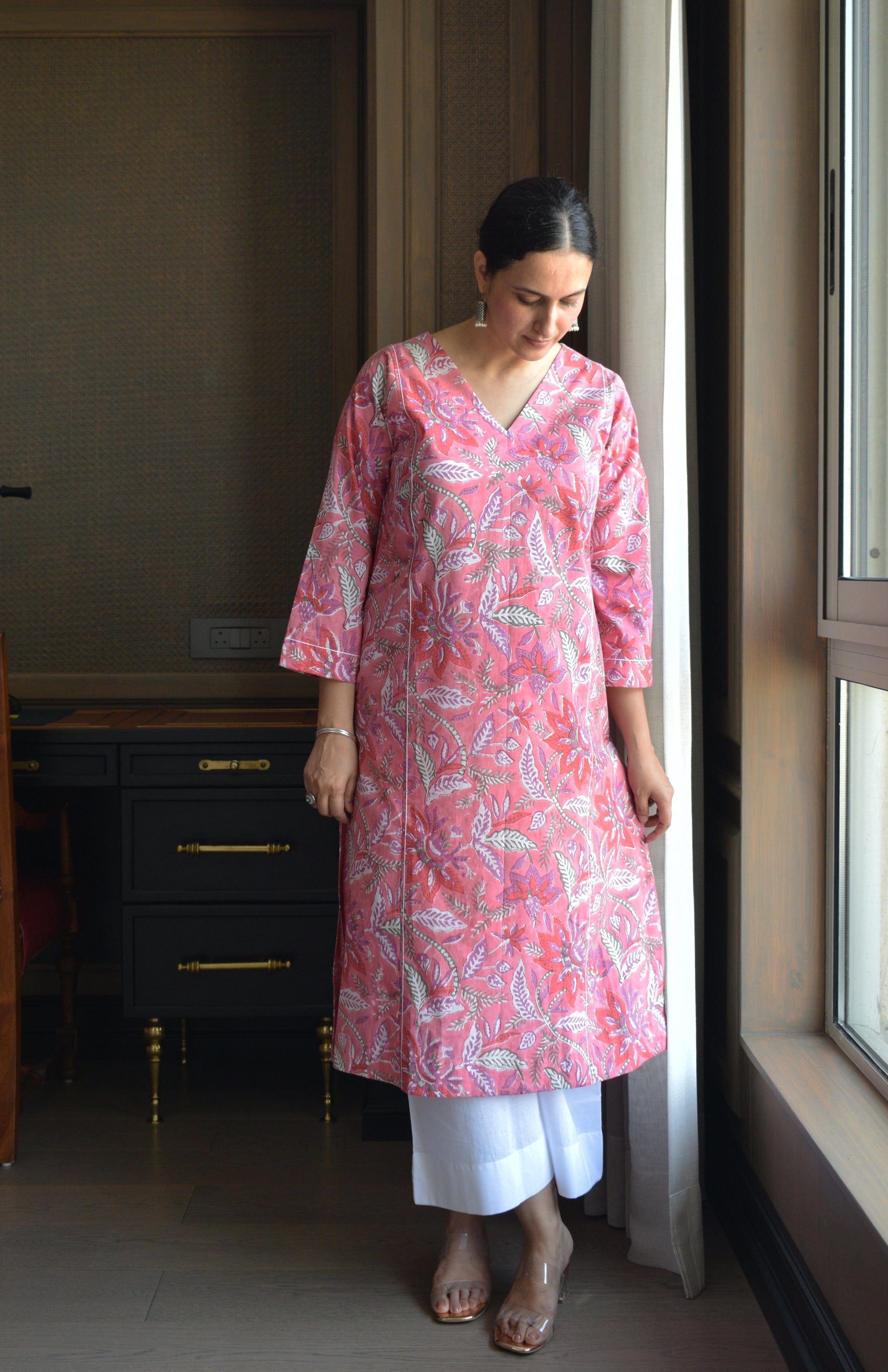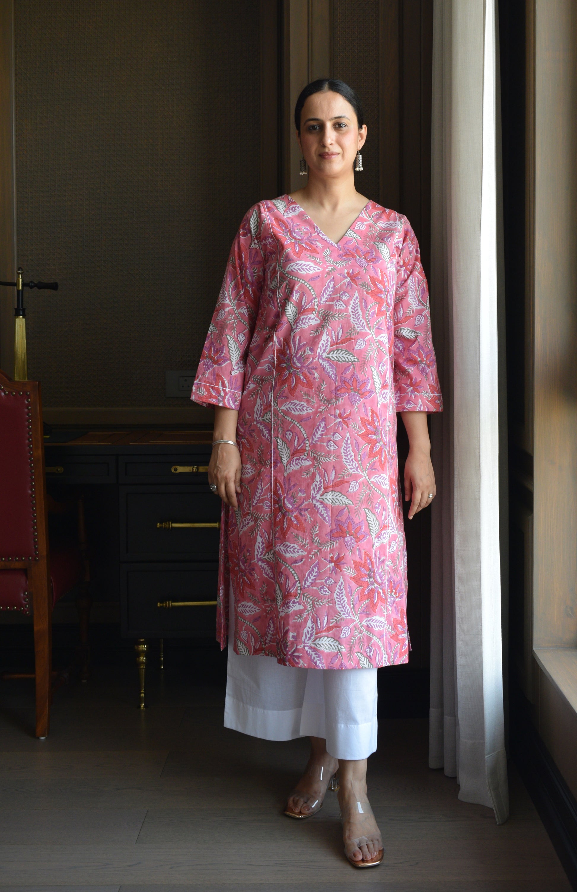 Crafted in soft cotton, this hand block printed kurta blends simplicity with thoughtful detail. Featuring a straight fit with side slits and a flattering V-neckline, it’s designed for everyday comfort. The front and back panels are subtly highlighted with contrast stitch detail, adding a touch of understated charm—perfect for effortless, all-day wear.