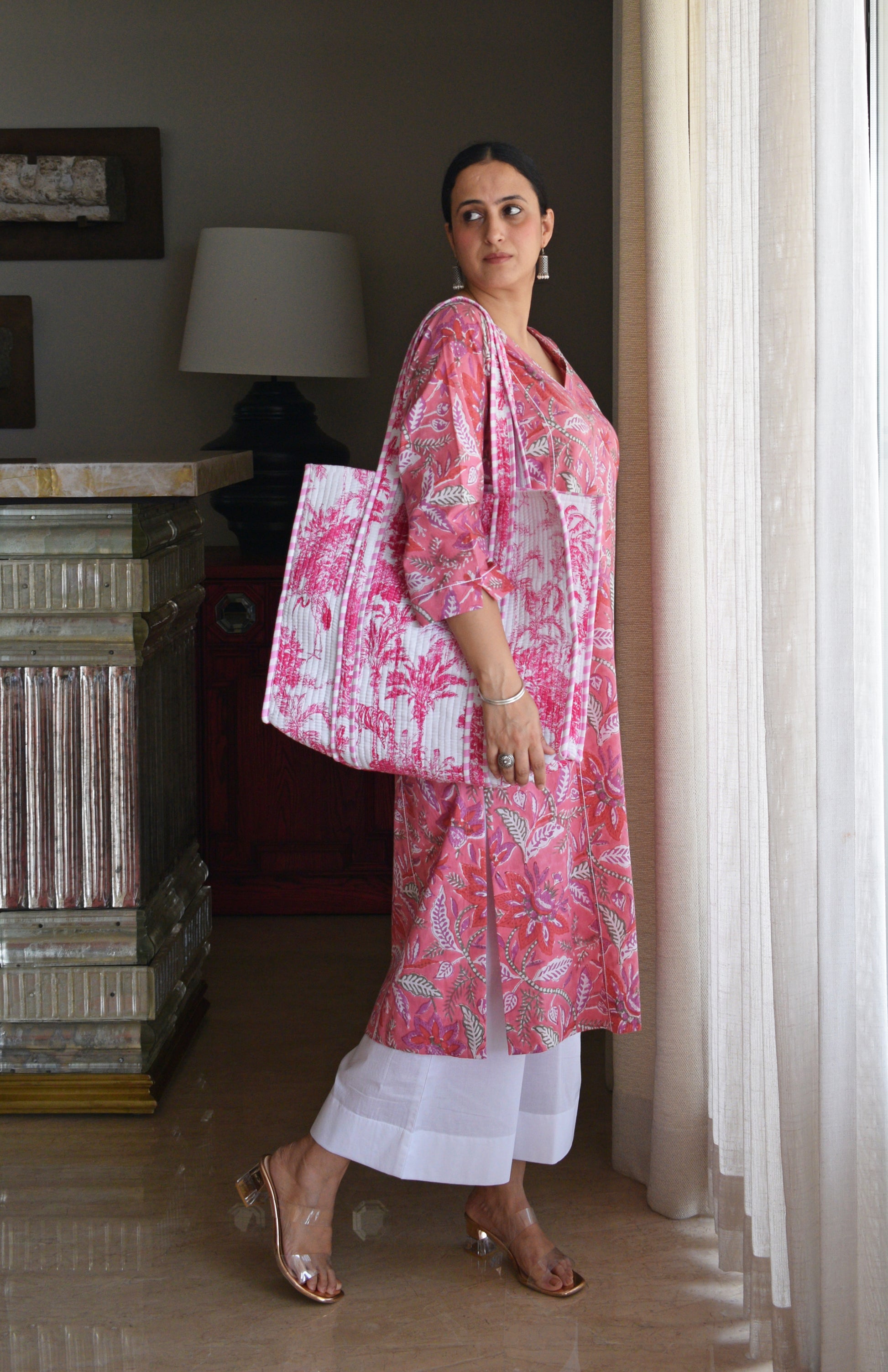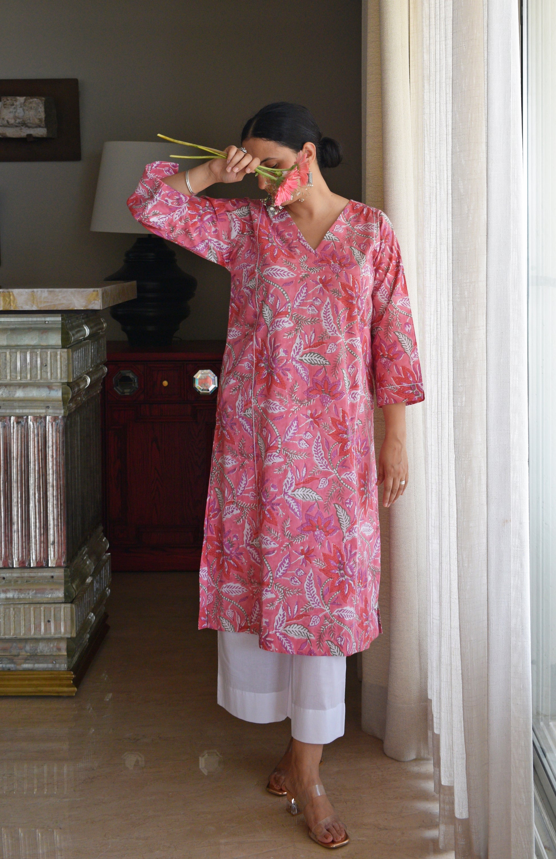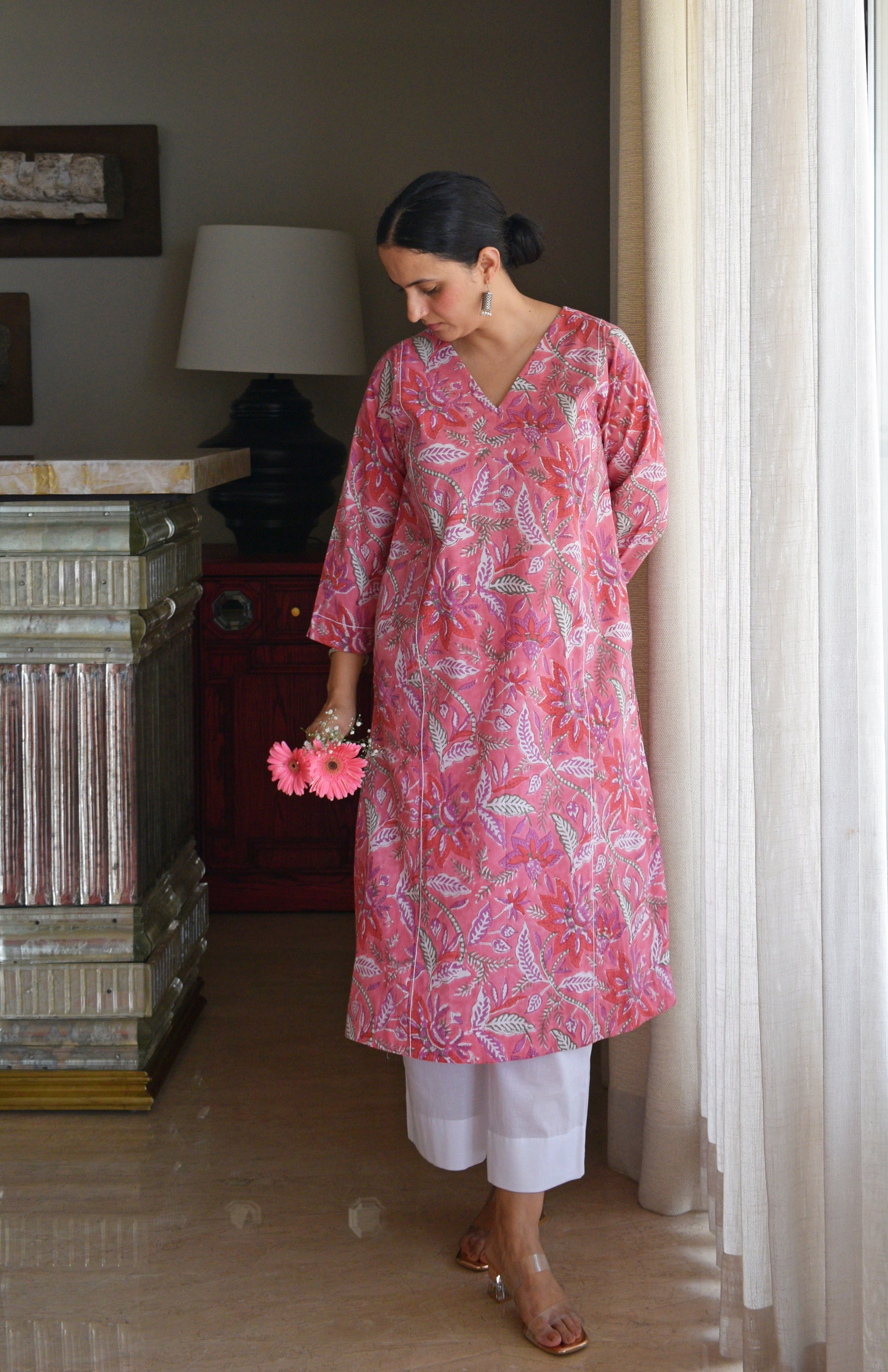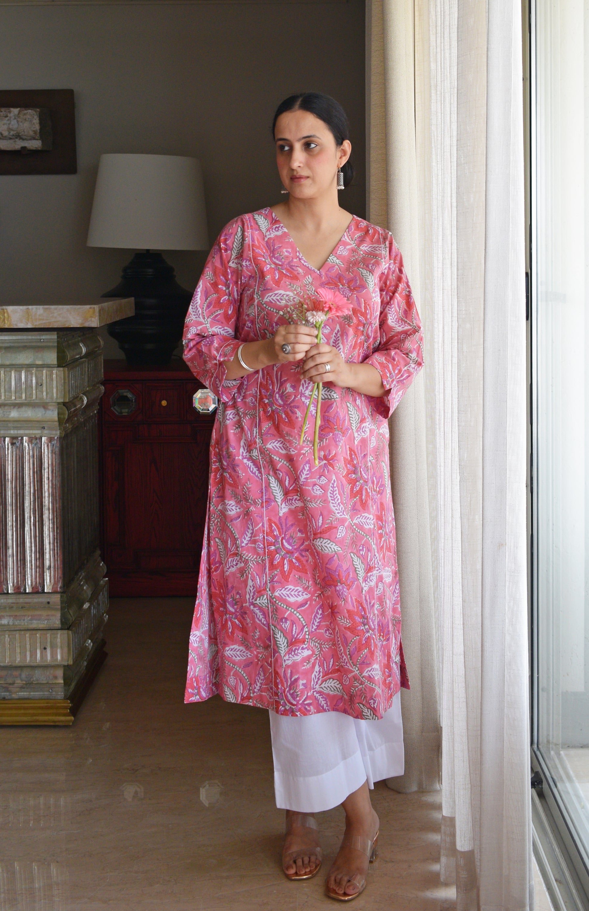 Crafted in soft cotton, this hand block printed kurta blends simplicity with thoughtful detail. Featuring a straight fit with side slits and a flattering V-neckline, it’s designed for everyday comfort. The front and back panels are subtly highlighted with contrast stitch detail, adding a touch of understated charm—perfect for effortless, all-day wear.