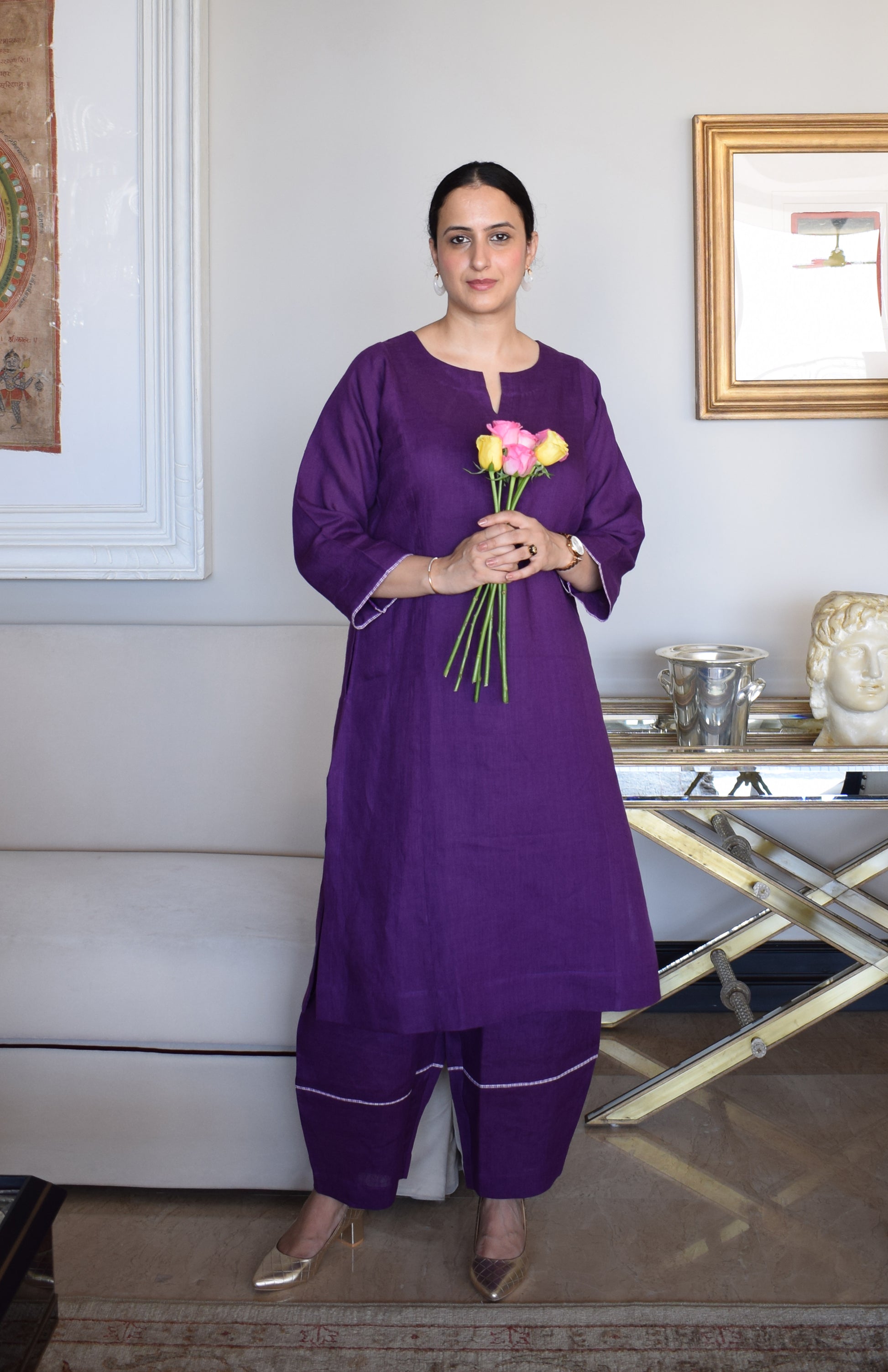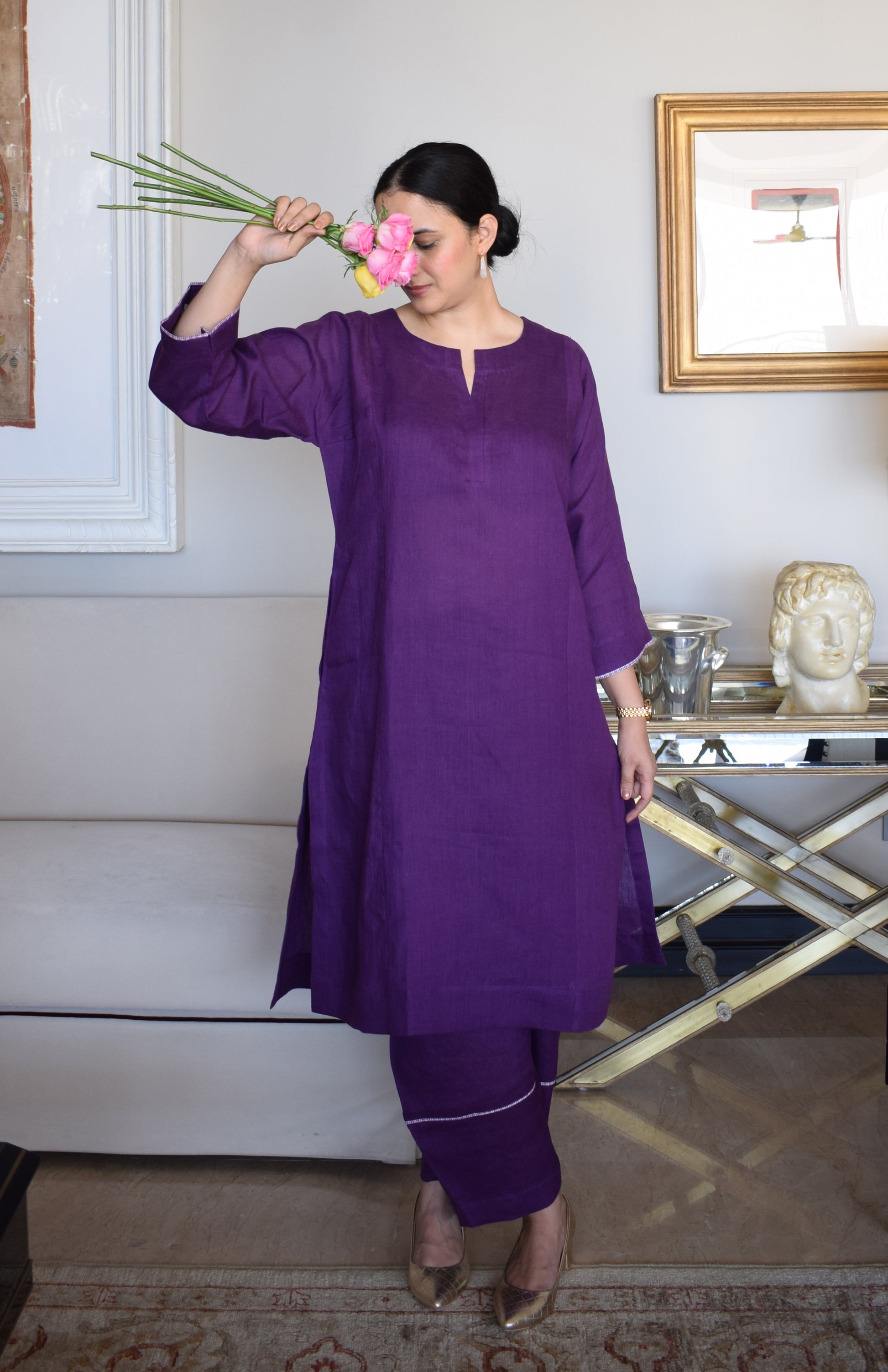 Pure Linen | Kurta & Pants SetPurple Linen Straight Fit Panelled Kurta Set with Trousers
